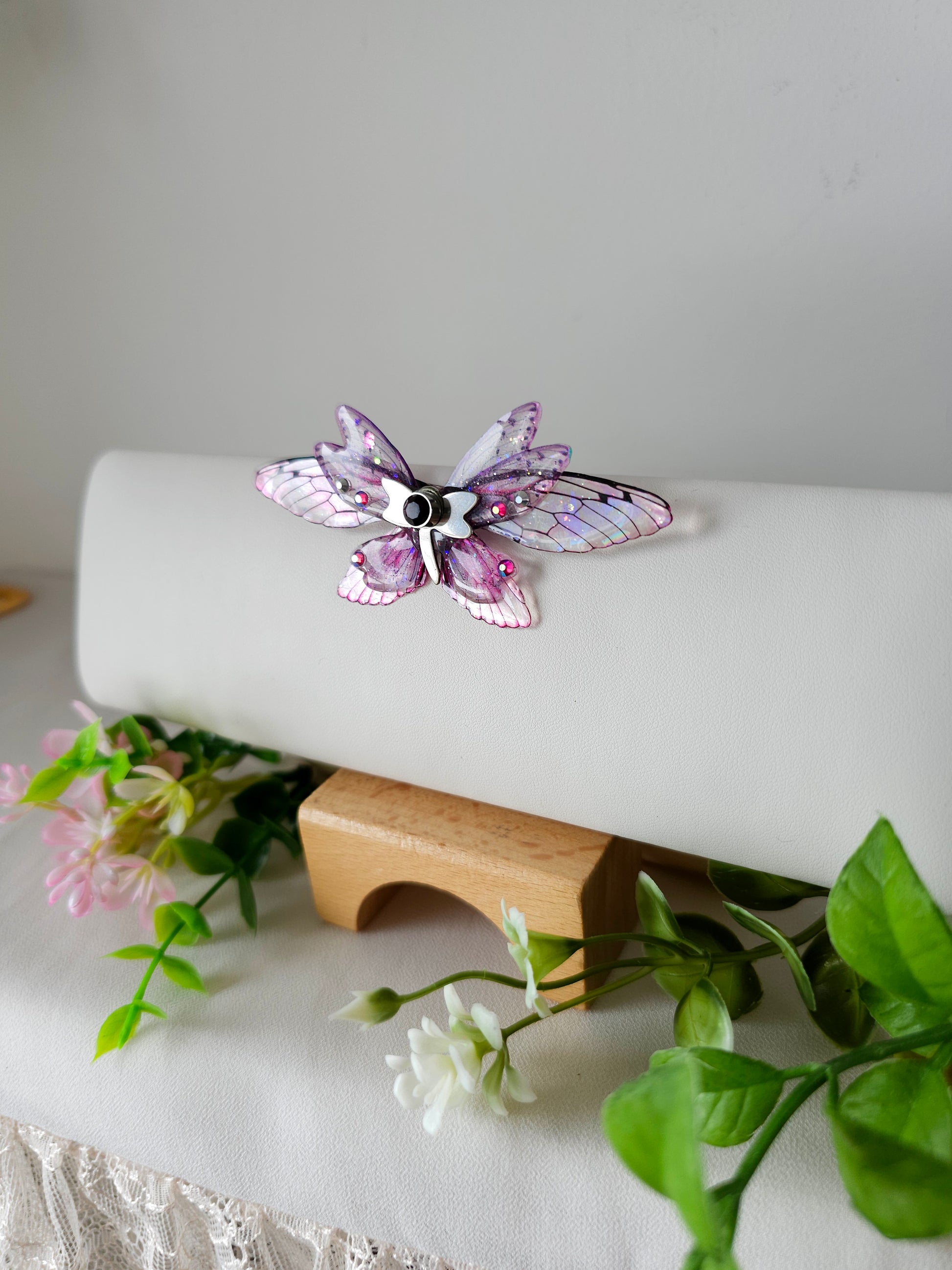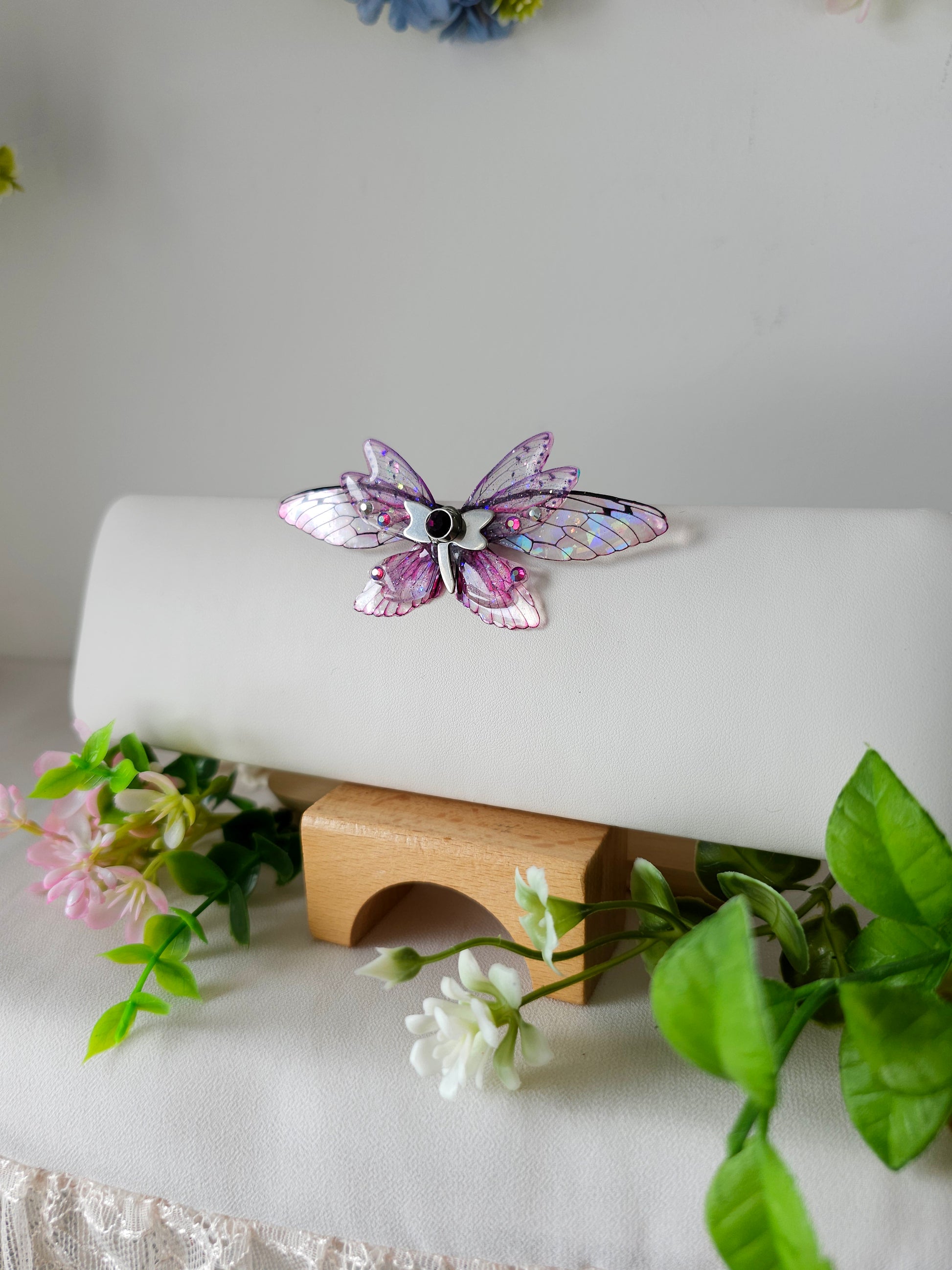 Aripile sunt realizate din rășină non-toxică, ușoară și rezistentă, decorate manual cu pigmenți irizanți, reflexii multicolore și strasuri strălucitoare ce captează lumina din orice unghi.