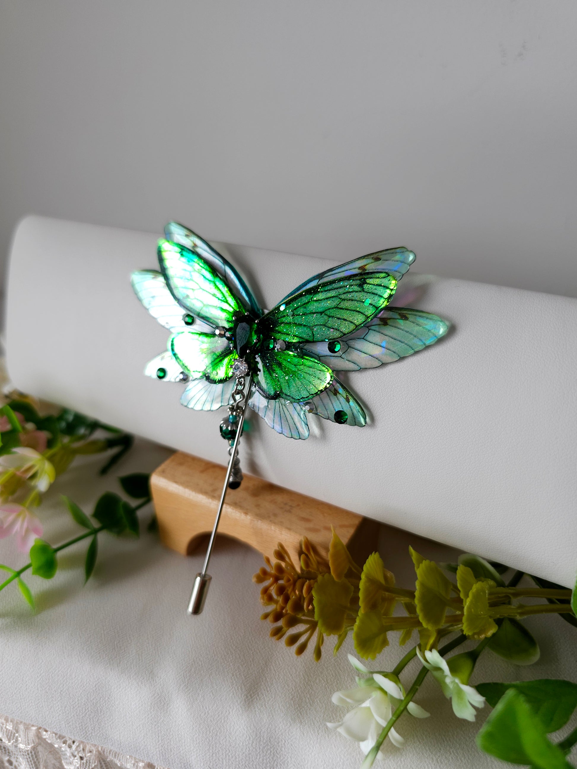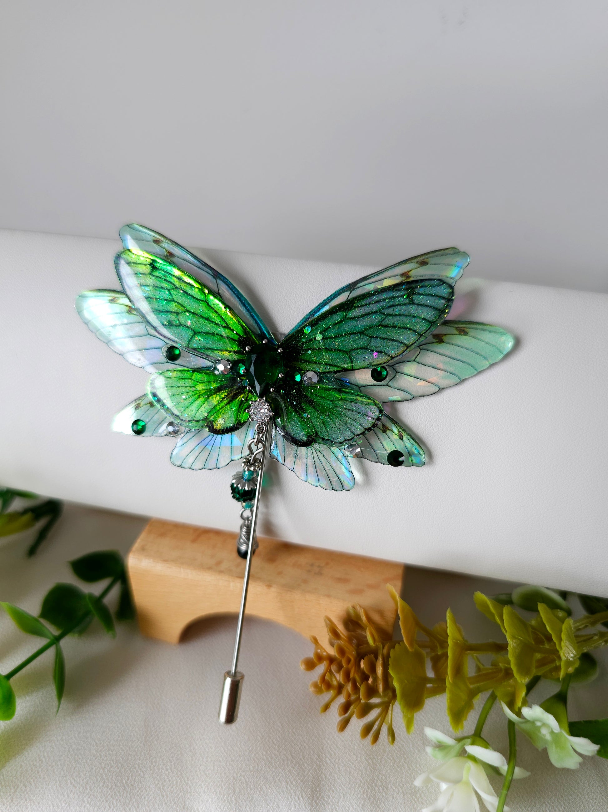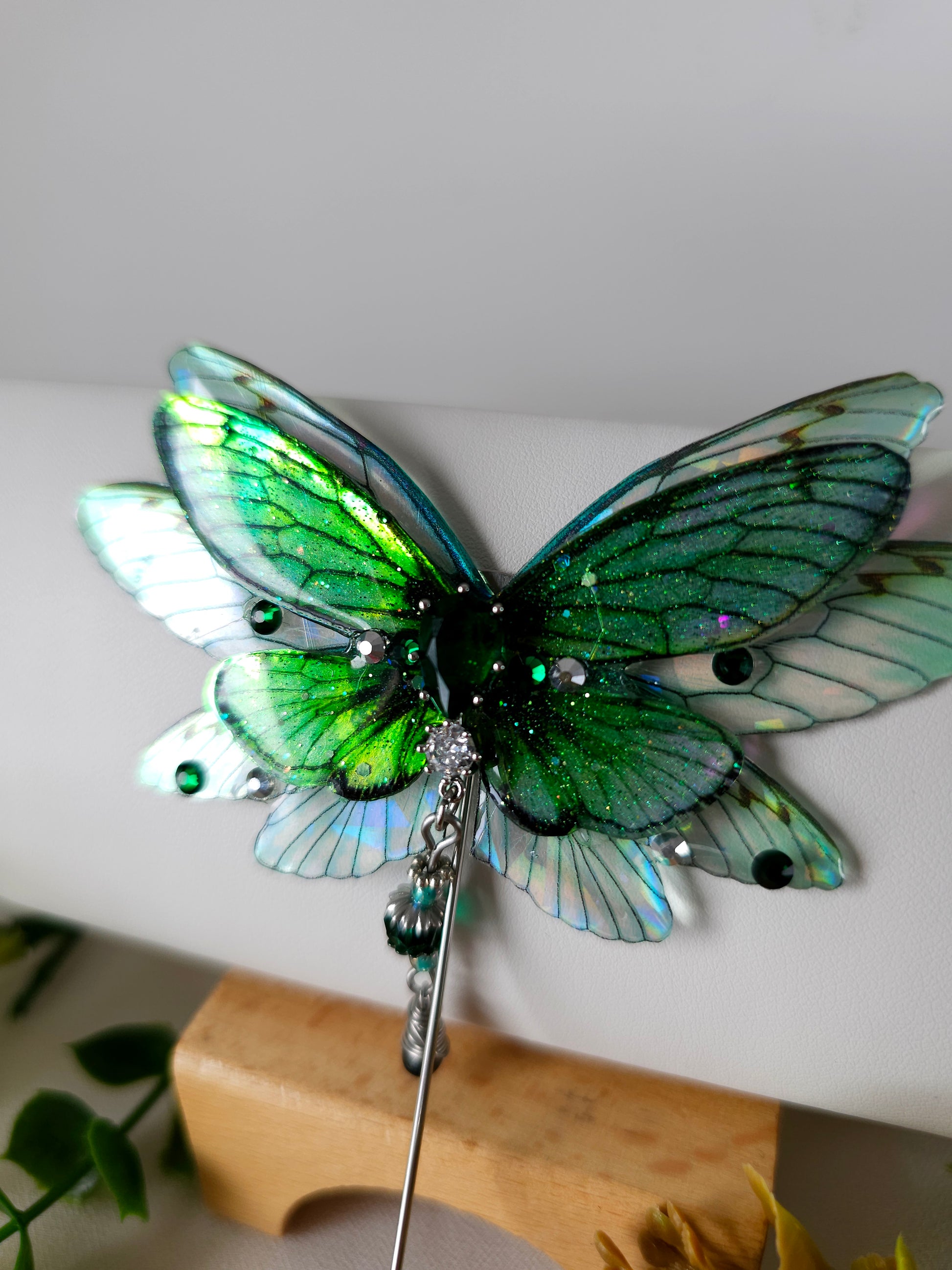 Aripile sunt realizate din rășină non-toxică, ușoară și rezistentă, decorate manual cu pigmenți irizanți, reflexii multicolore și strasuri strălucitoare ce captează lumina din orice unghi.