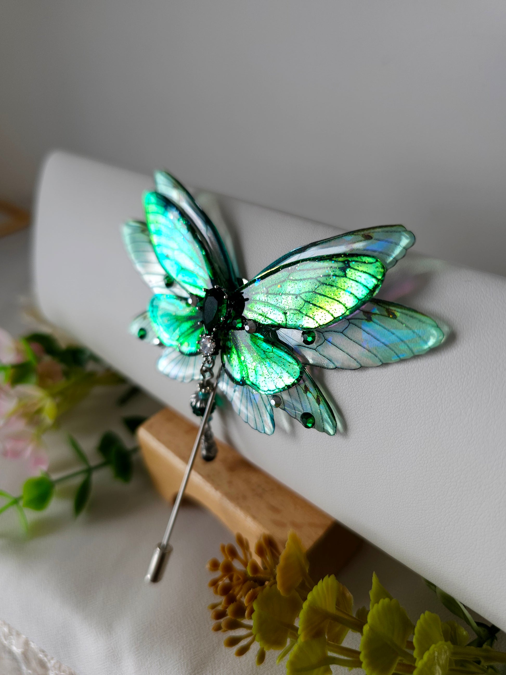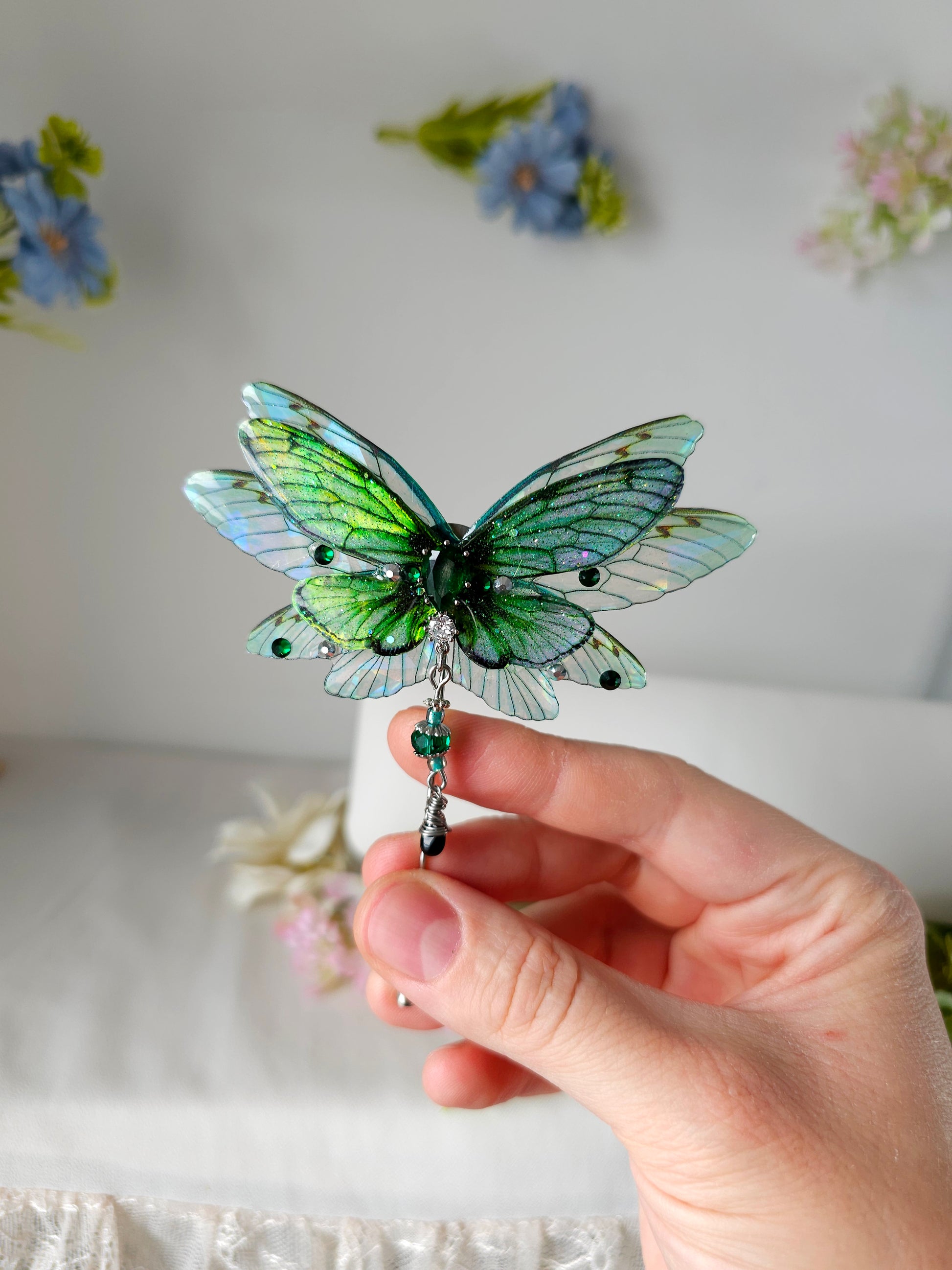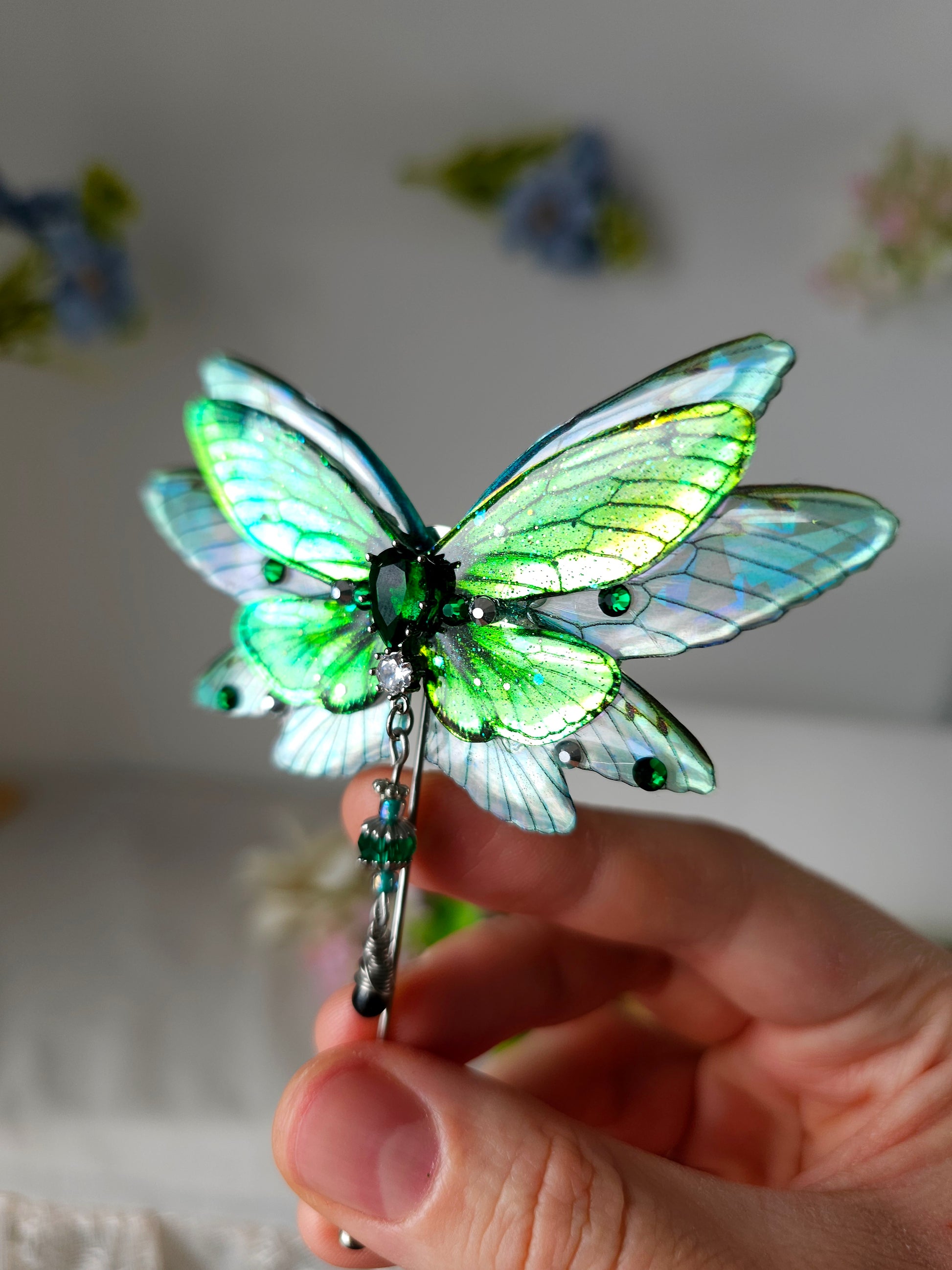 Aripile sunt realizate din rășină non-toxică, ușoară și rezistentă, decorate manual cu pigmenți irizanți, reflexii multicolore și strasuri strălucitoare ce captează lumina din orice unghi.