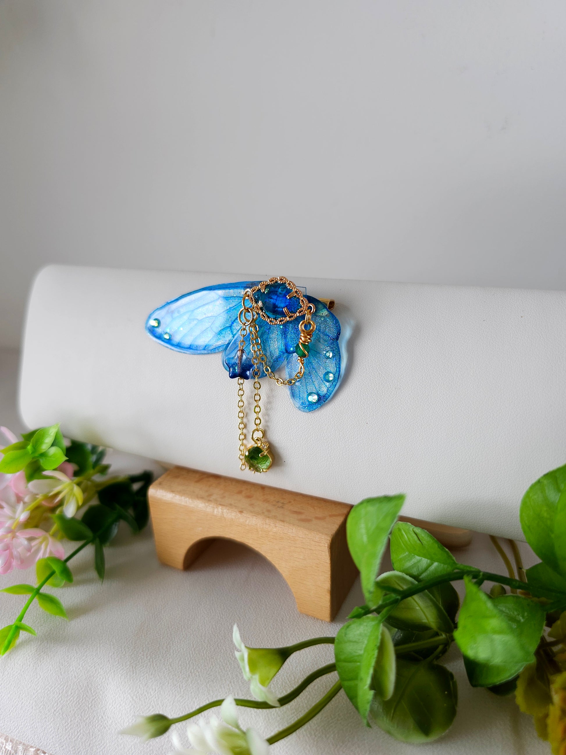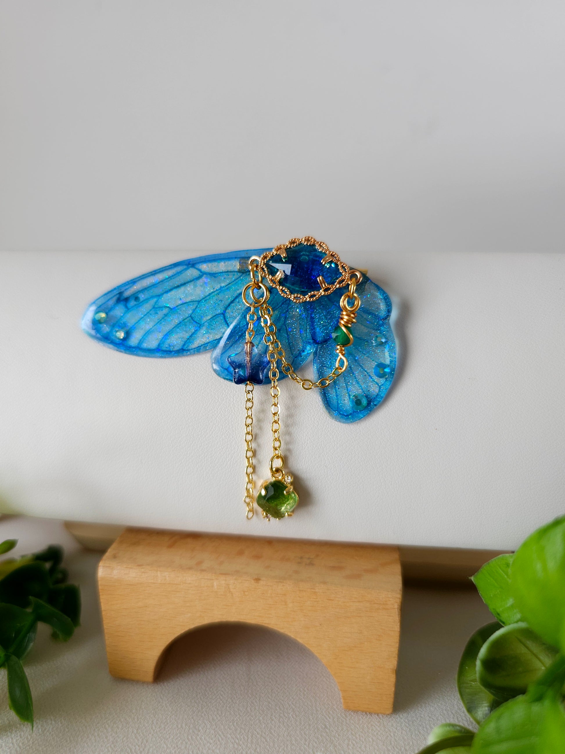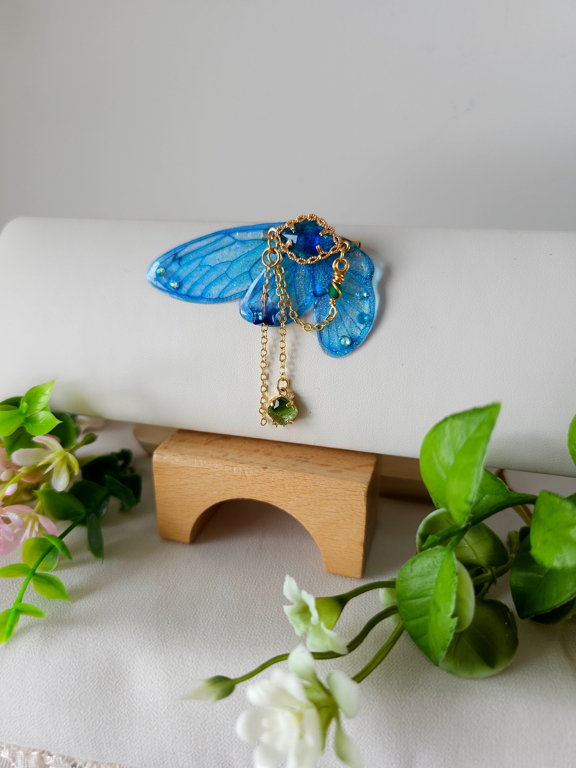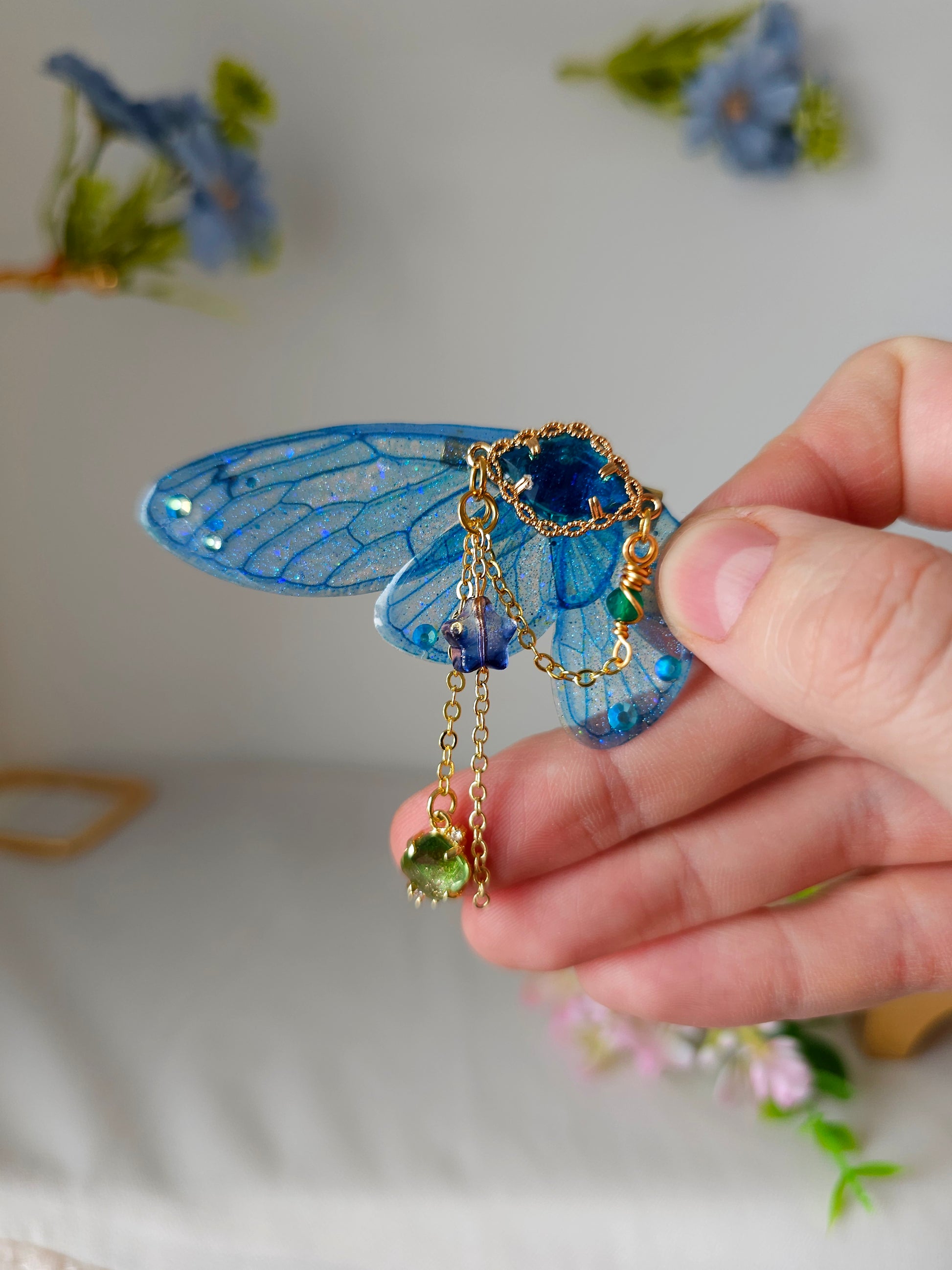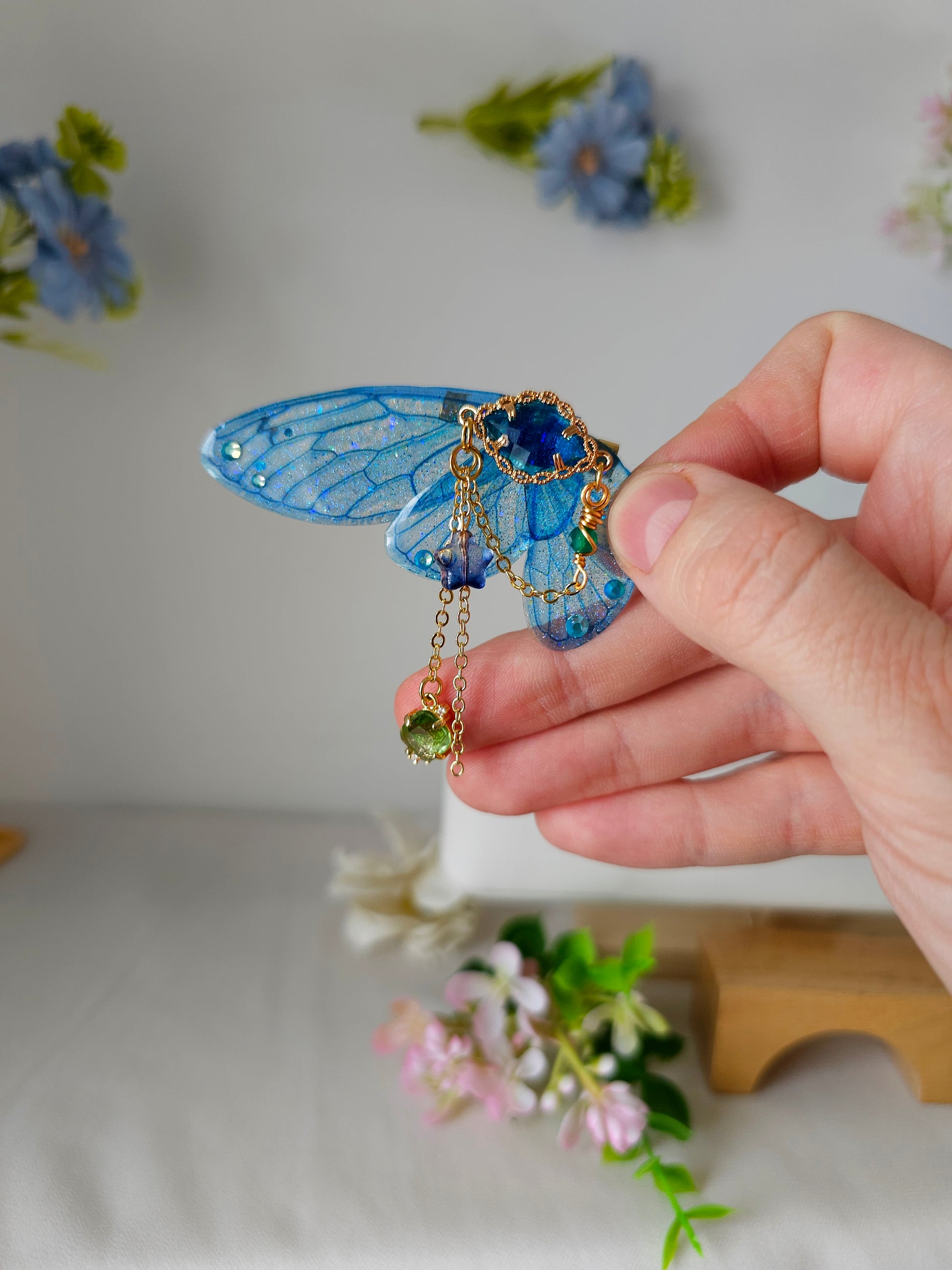 Aripile sunt realizate din rășină non-toxică, ușoară și rezistentă, decorate manual cu pigmenți irizanți, reflexii multicolore și strasuri strălucitoare ce captează lumina din orice unghi.