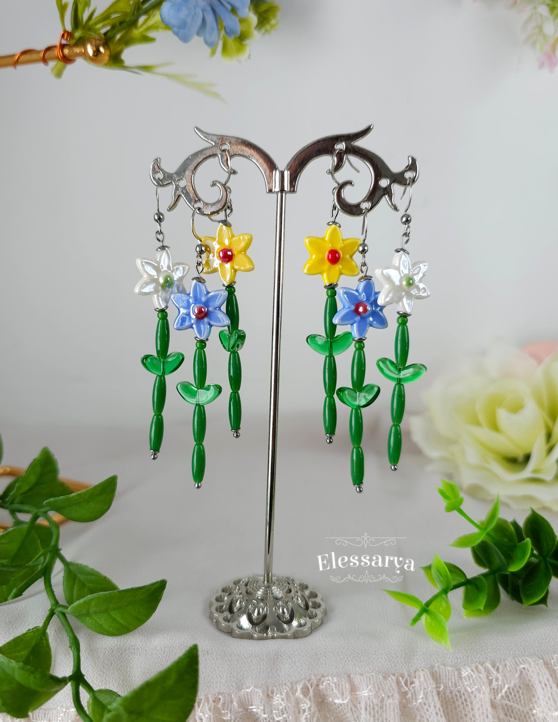 Delicate earrings inspired by blooming daffodils in cheerful spring hues. The elongated design, with a green stem and ceramic flower, adds a playful and fresh air to any outfit.