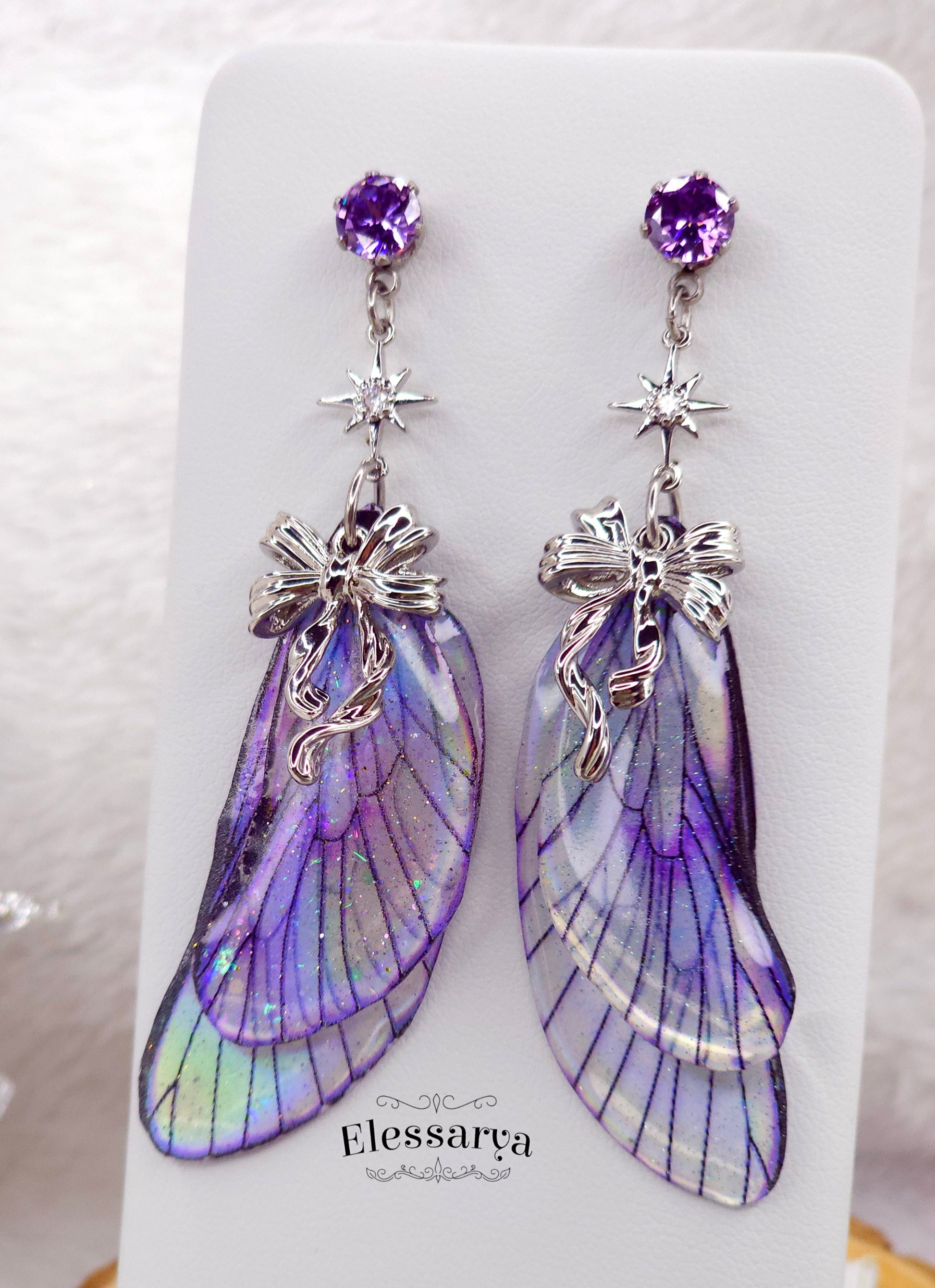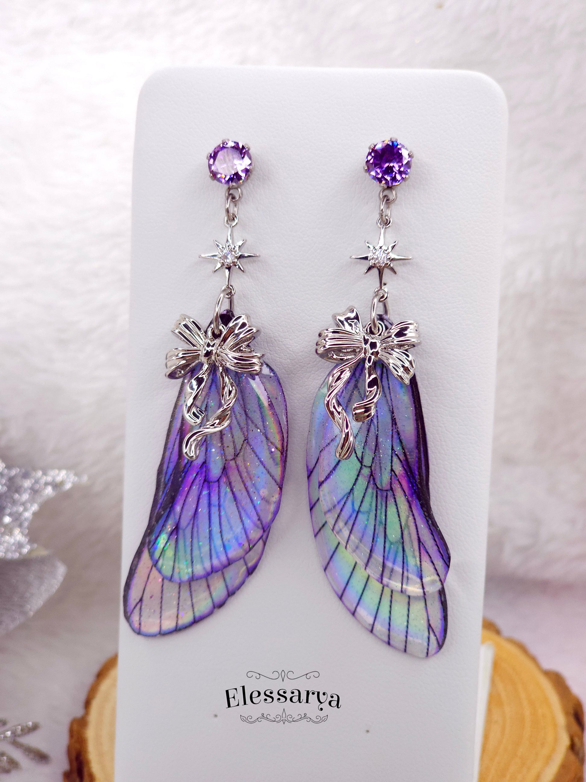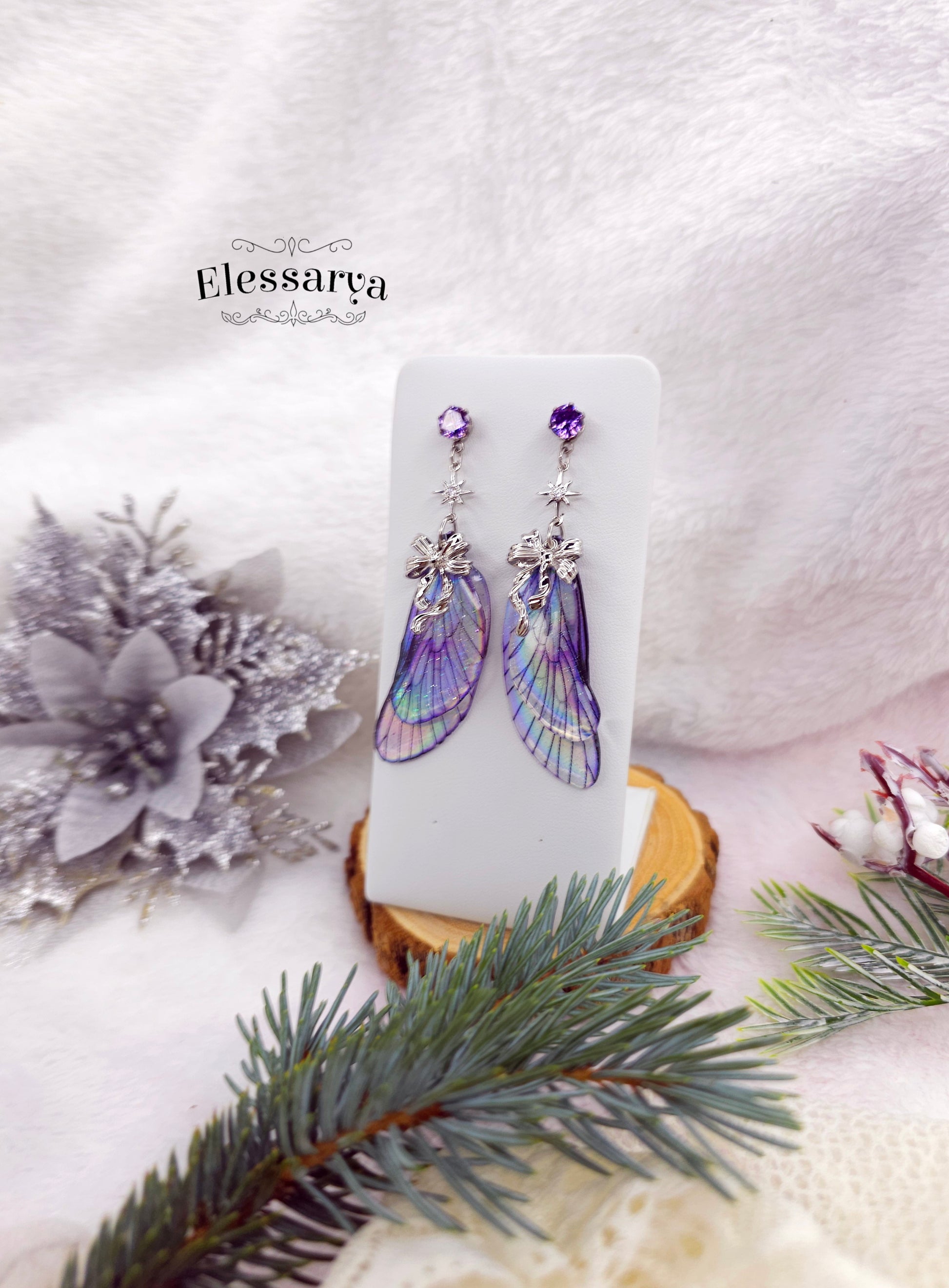 O pereche de cercei luminoși și extrem de feminini, creați din aripi realizate manual din rășină nontoxică, cu reflexii de curcubeu și nuanțe de mov pal, liliachiu și albastru irizat. Aripile sunt mobile, ceea ce înseamnă că se mișcă delicat la fiecare pas și prind imediat lumina, oferind un efect feeric.