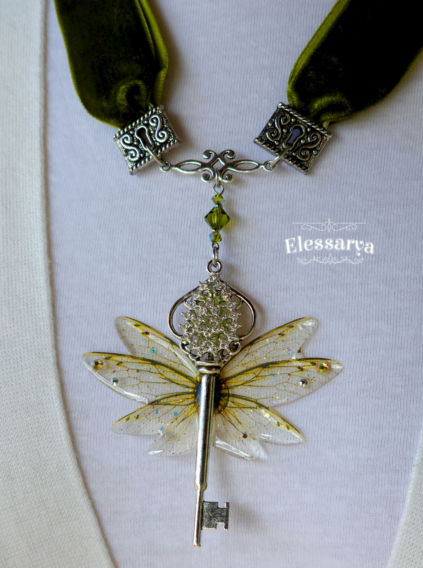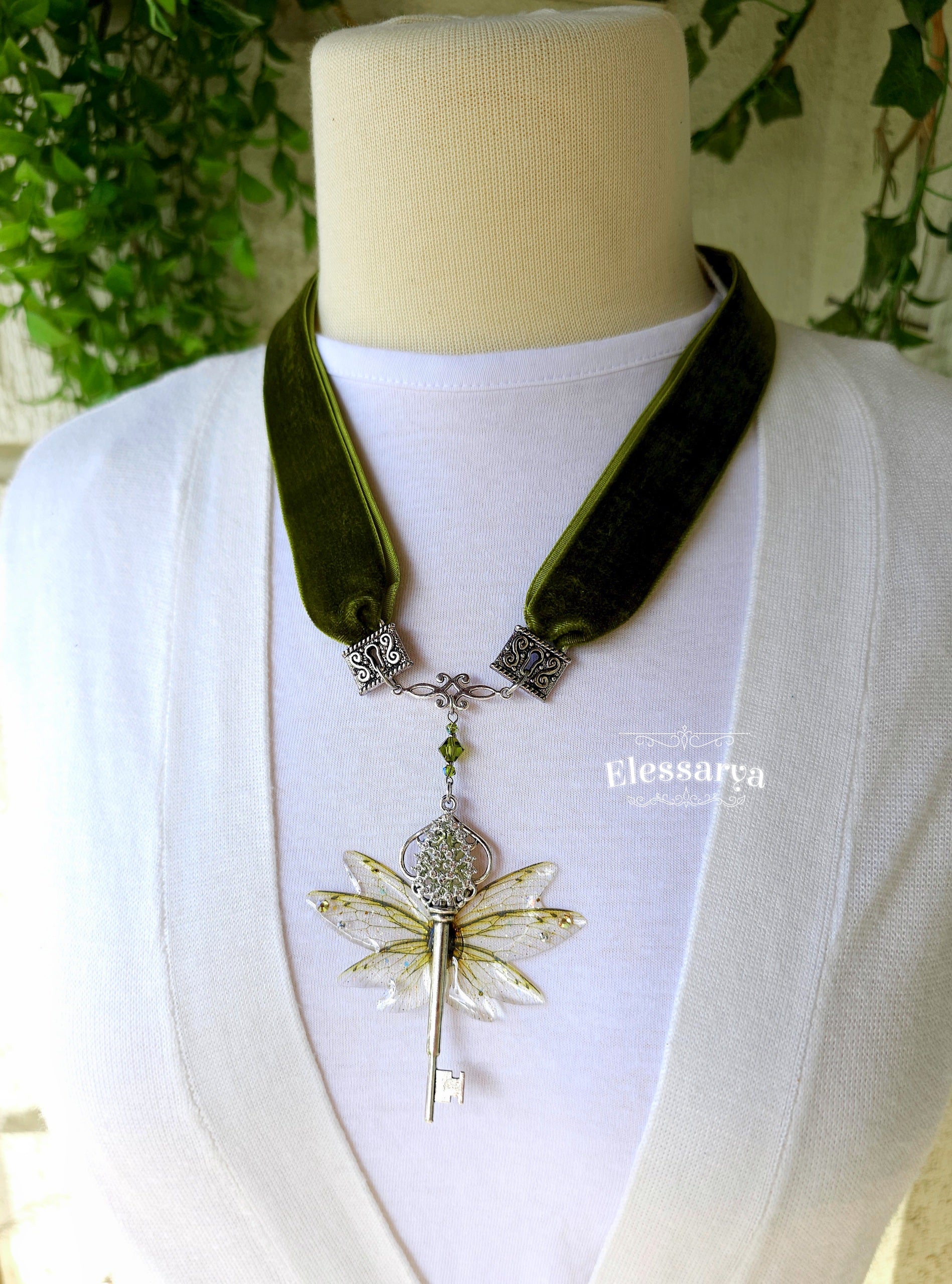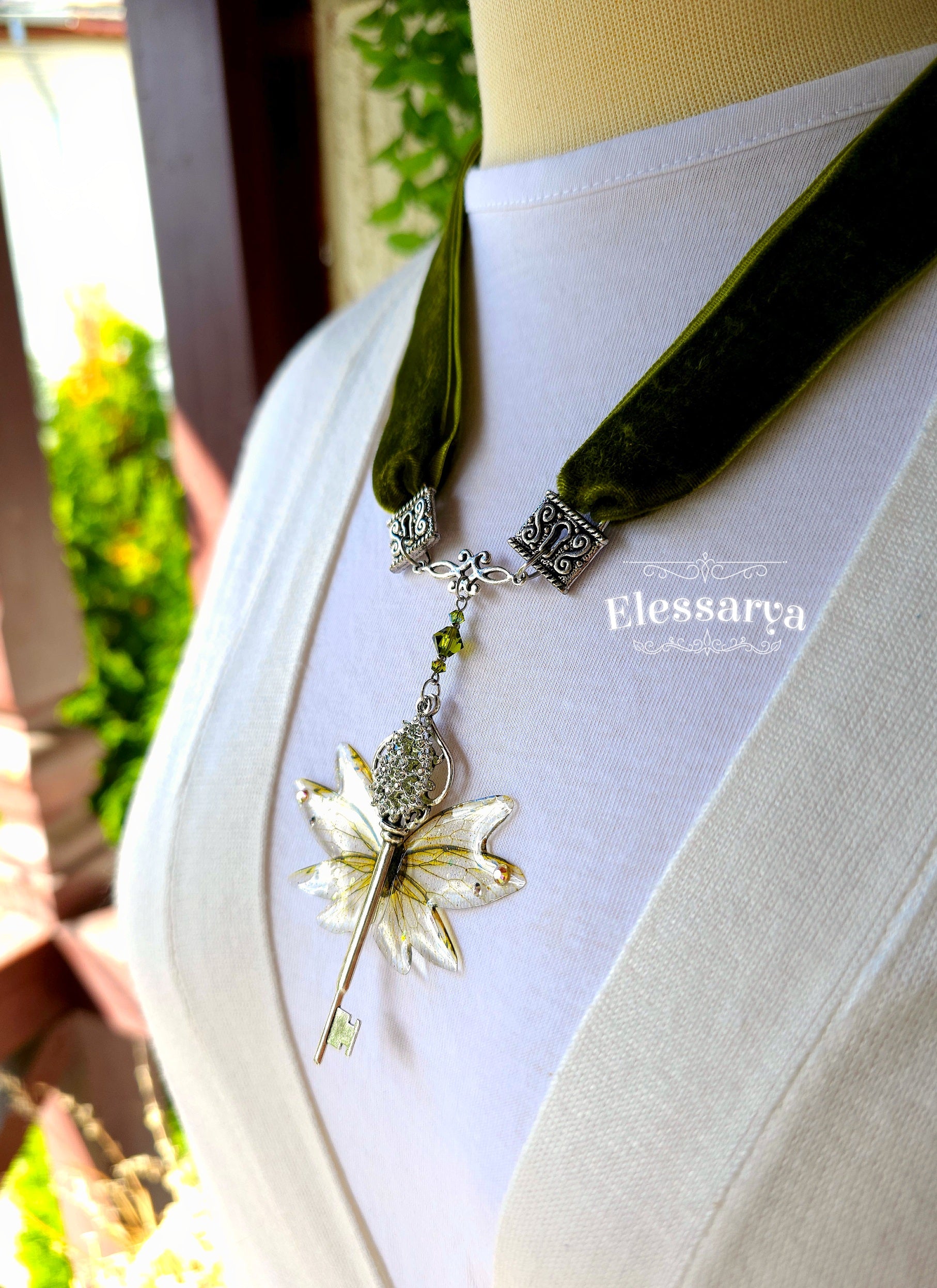 Colier regal cu catifea verde măslinie și zână a toamnei, o bijuterie impunătoare, plină de farmec mistic și detalii elaborate. Este o creație cu aer victorian, concepută pentru femeile care iubesc magia discretă a detaliilor și misterul naturii.