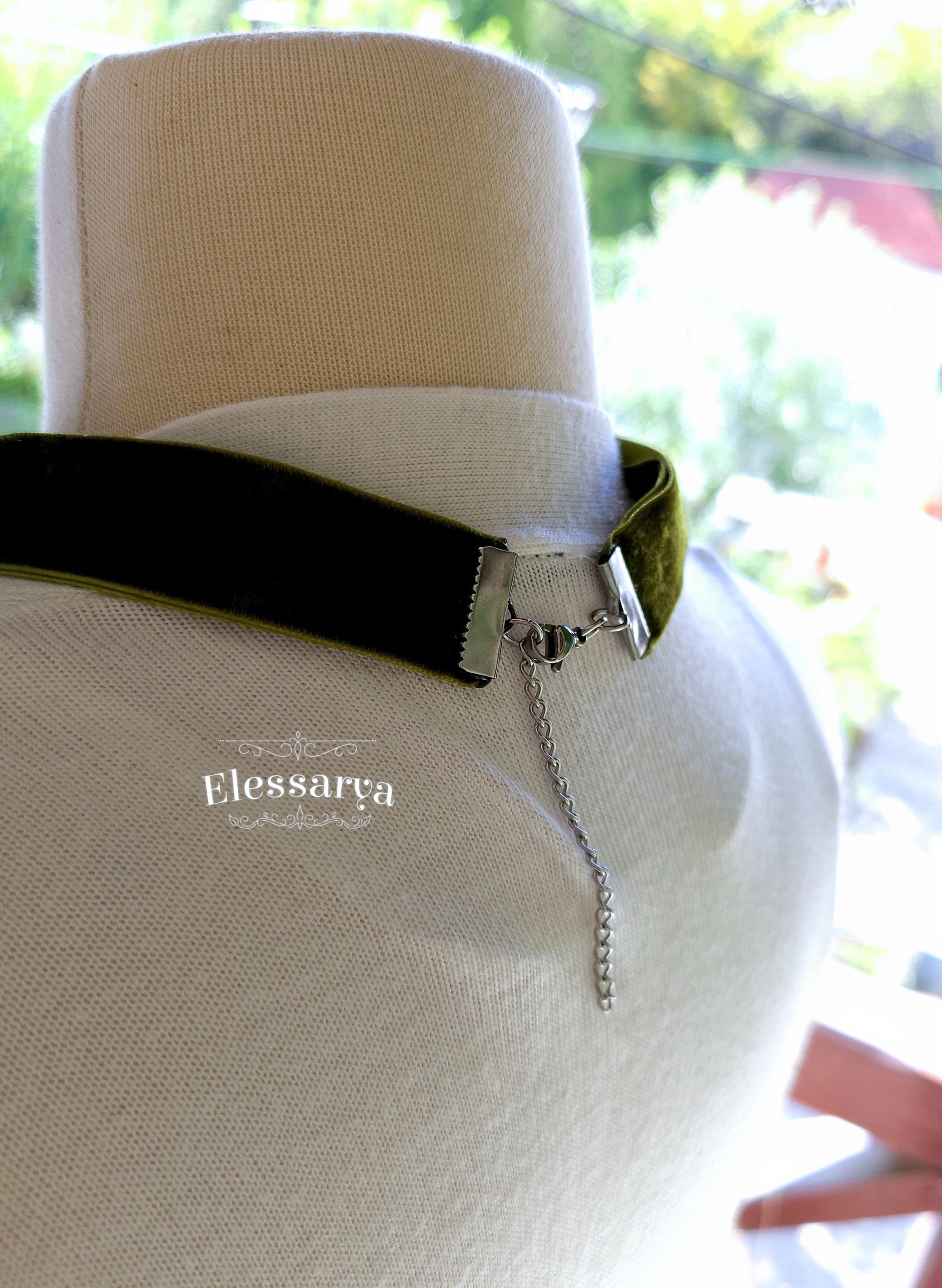 Banda de catifea verde moale se prinde elegant la spate cu închizătoare și prelungire din oțel inoxidabil, iar în față este fixată cu două lăcățele decorative din aliaj, care dau colierului o notă nobilă, de piesă de colecție.