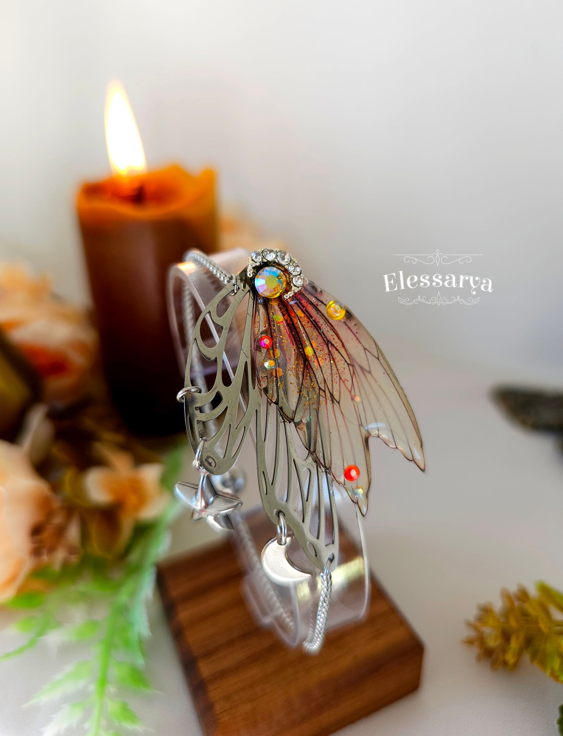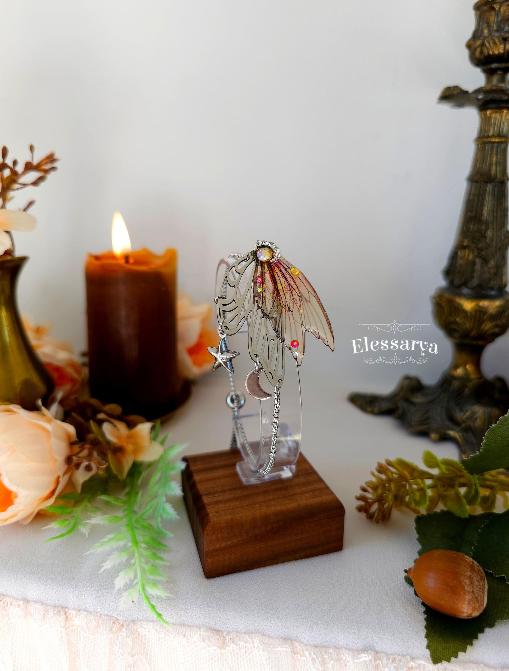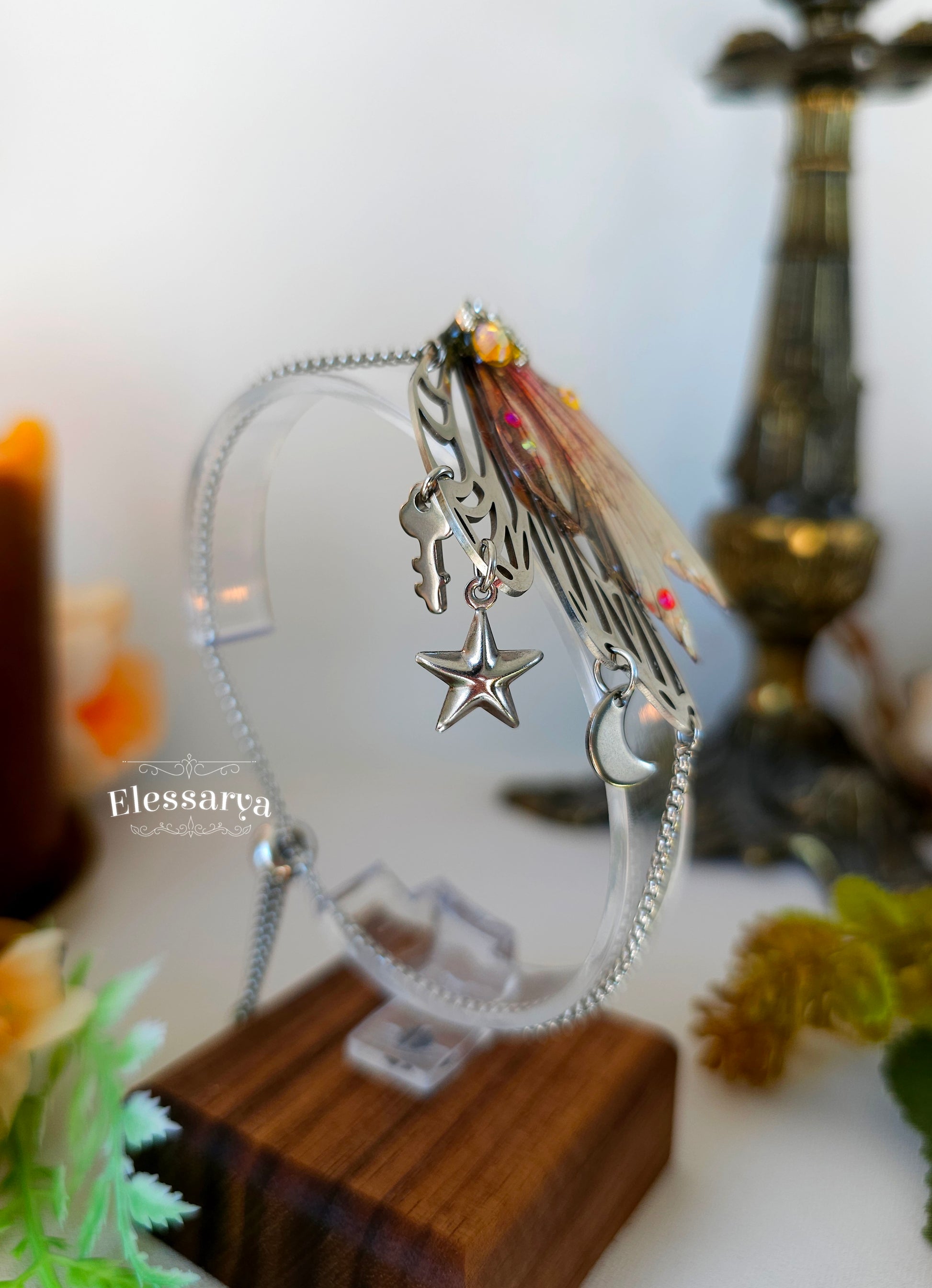Piesa centrală este o aripă de zână realizată manual, translucidă, decorată cu strasuri fine care captează lumina asemenea picăturilor de rouă. Aripa este însoțită de charmuri simbolice — o semilună, o steluță și o cheiță, toate din oțel inoxidabil, ca amintire a legăturii dintre vis, lumină și mister.