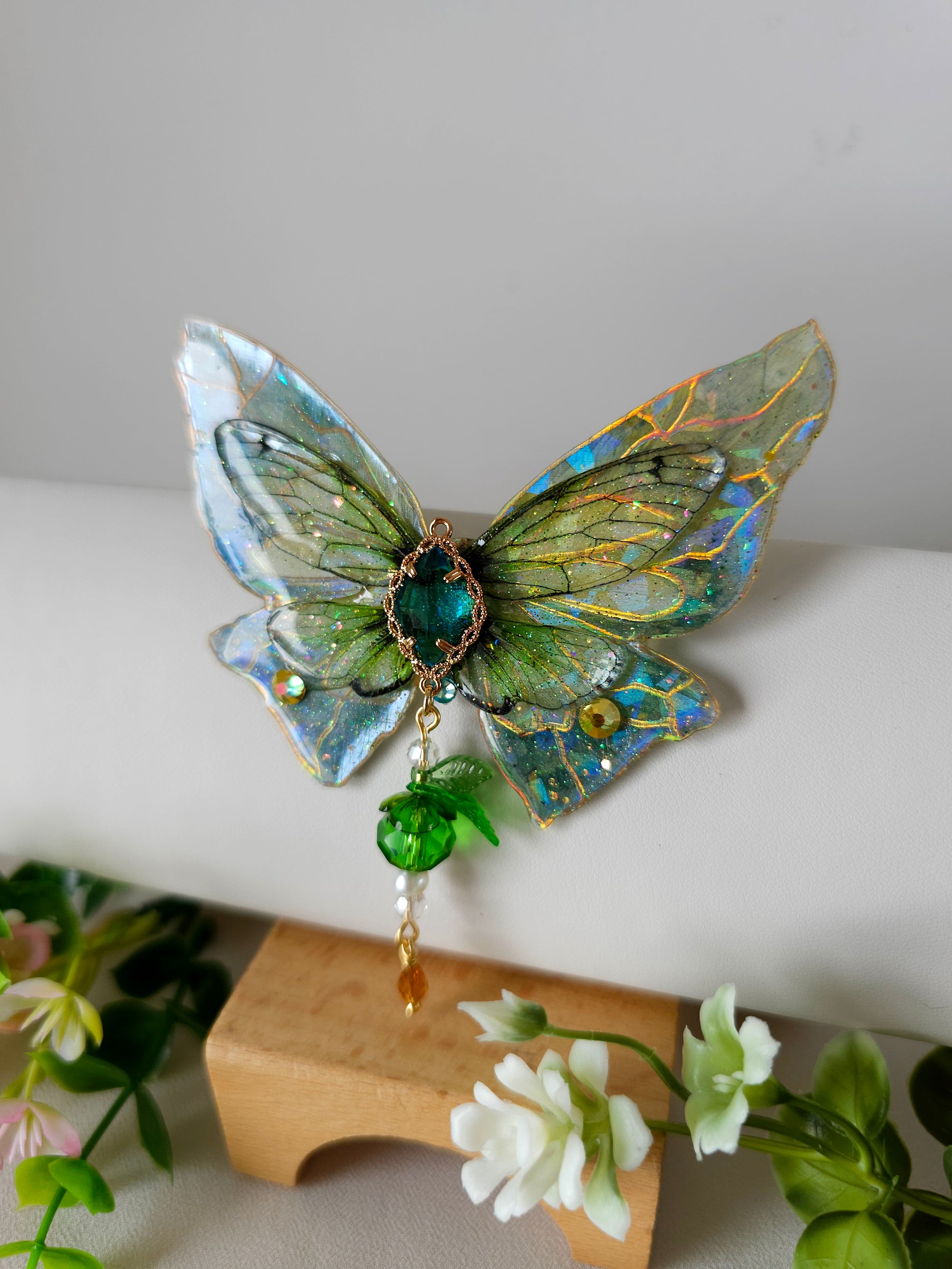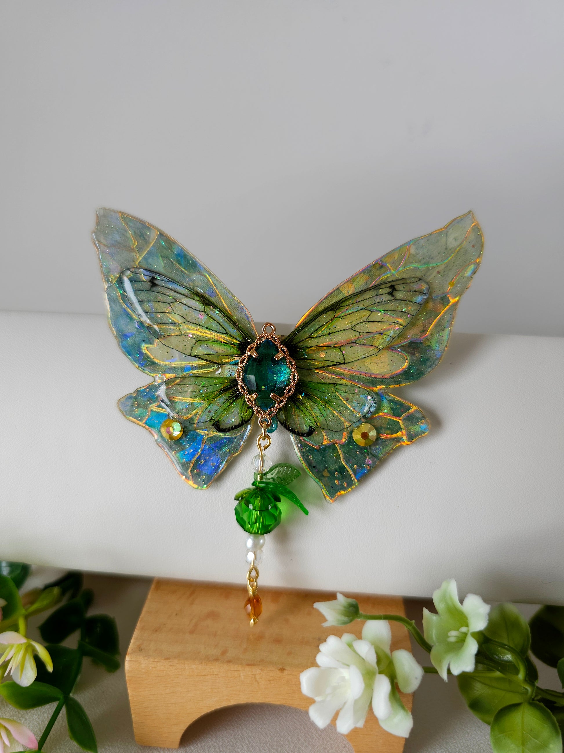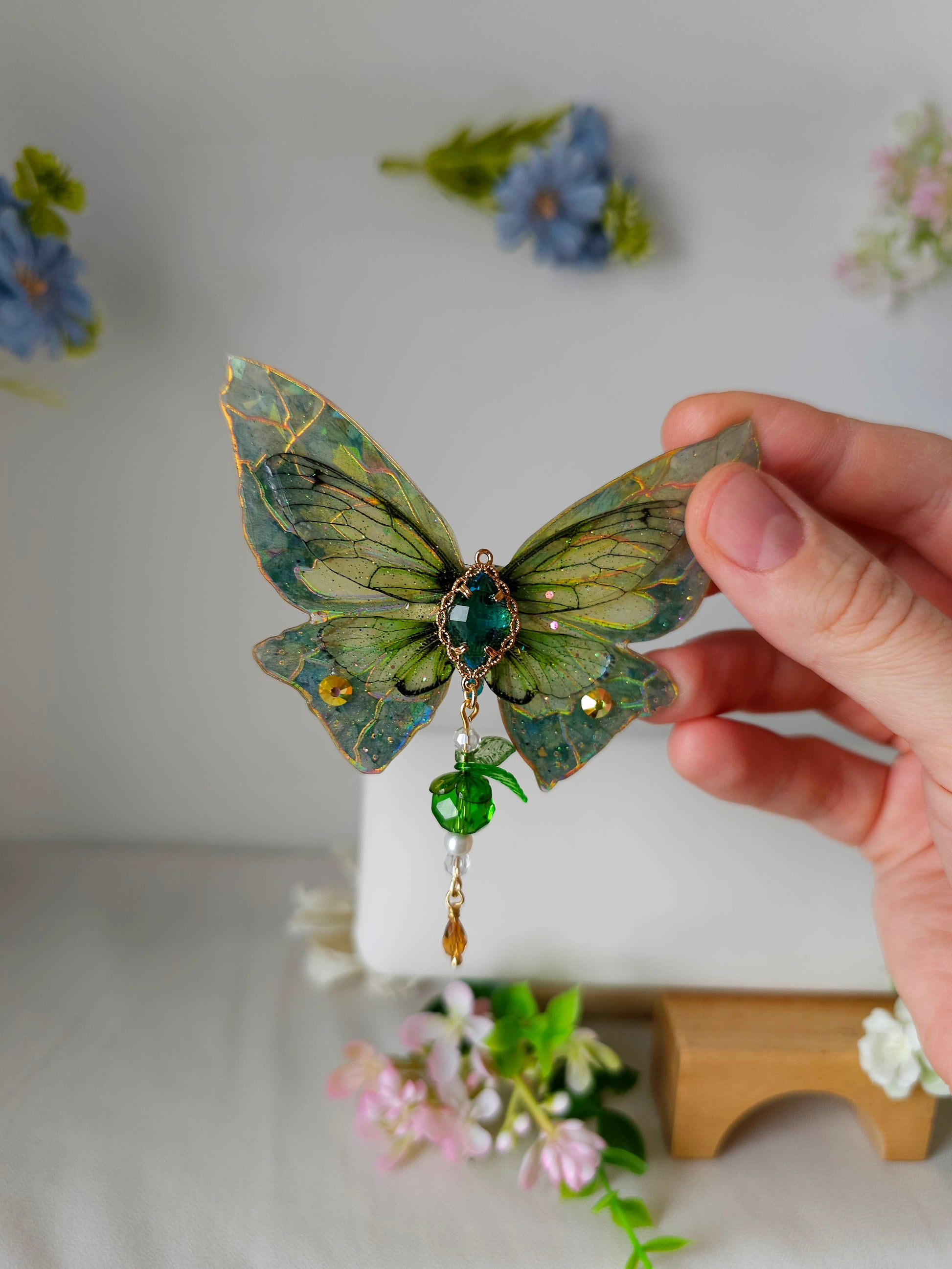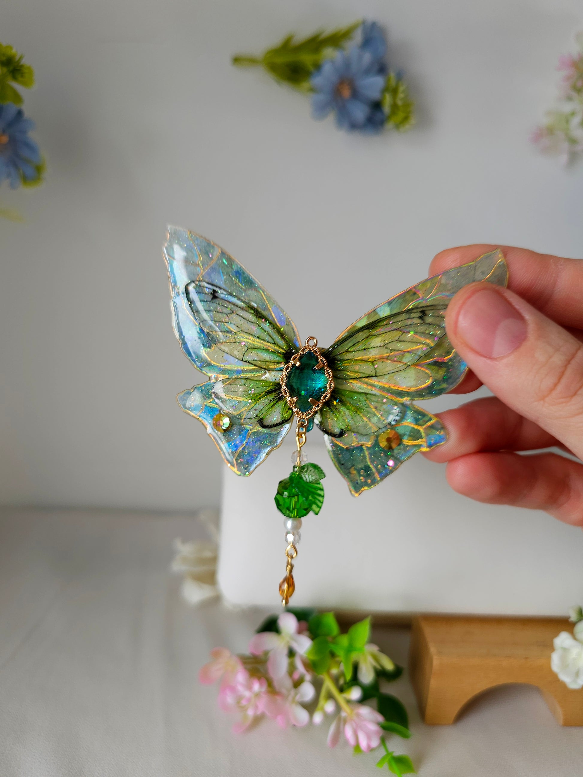 Aripile sunt realizate din rășină non-toxică, ușoară și rezistentă, decorate manual cu pigmenți irizanți, reflexii multicolore și strasuri strălucitoare ce captează lumina din orice unghi.