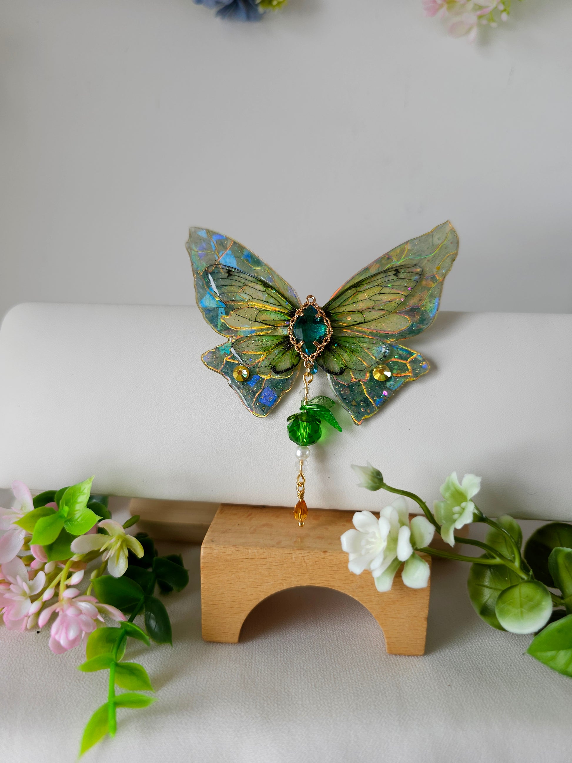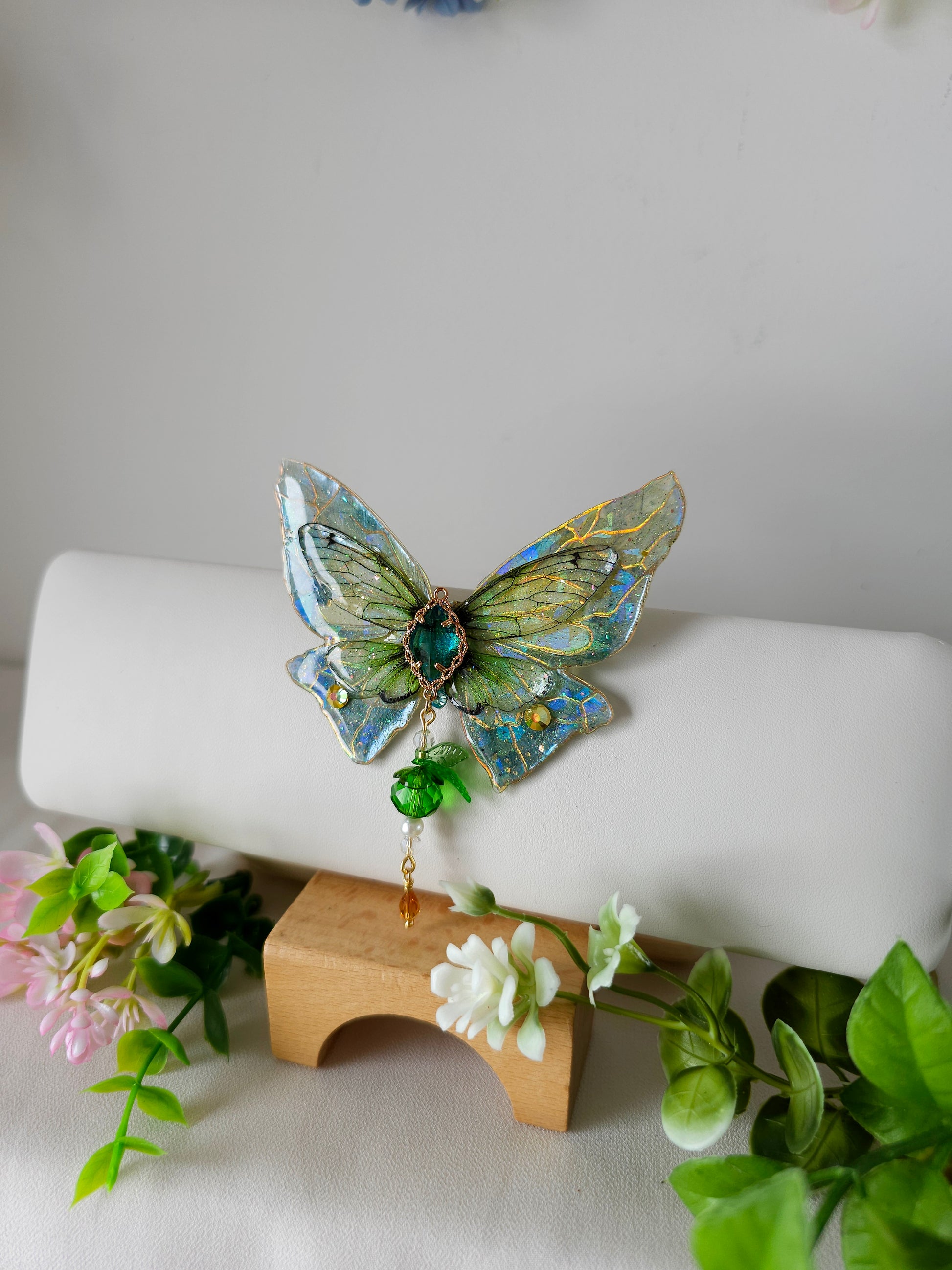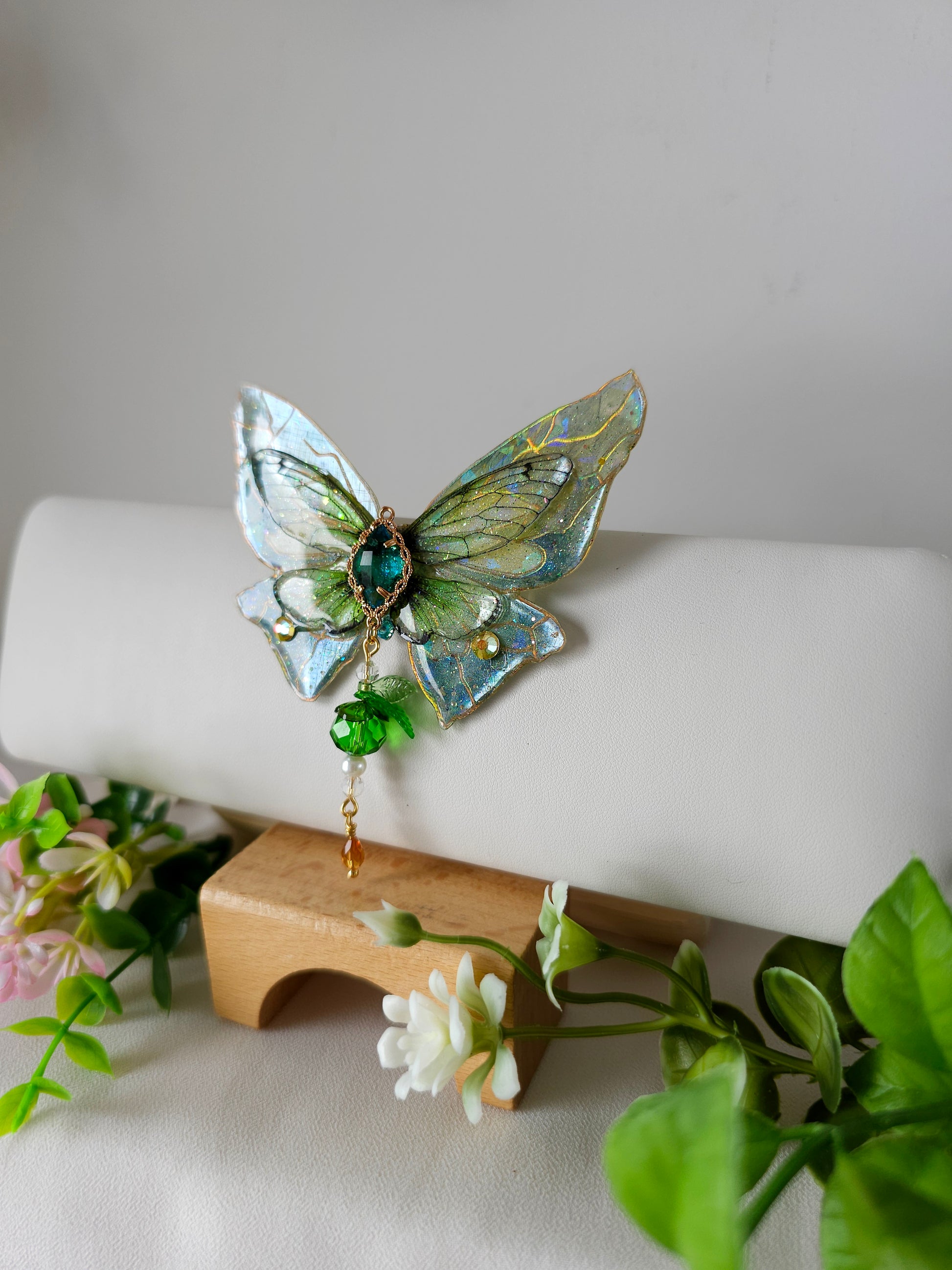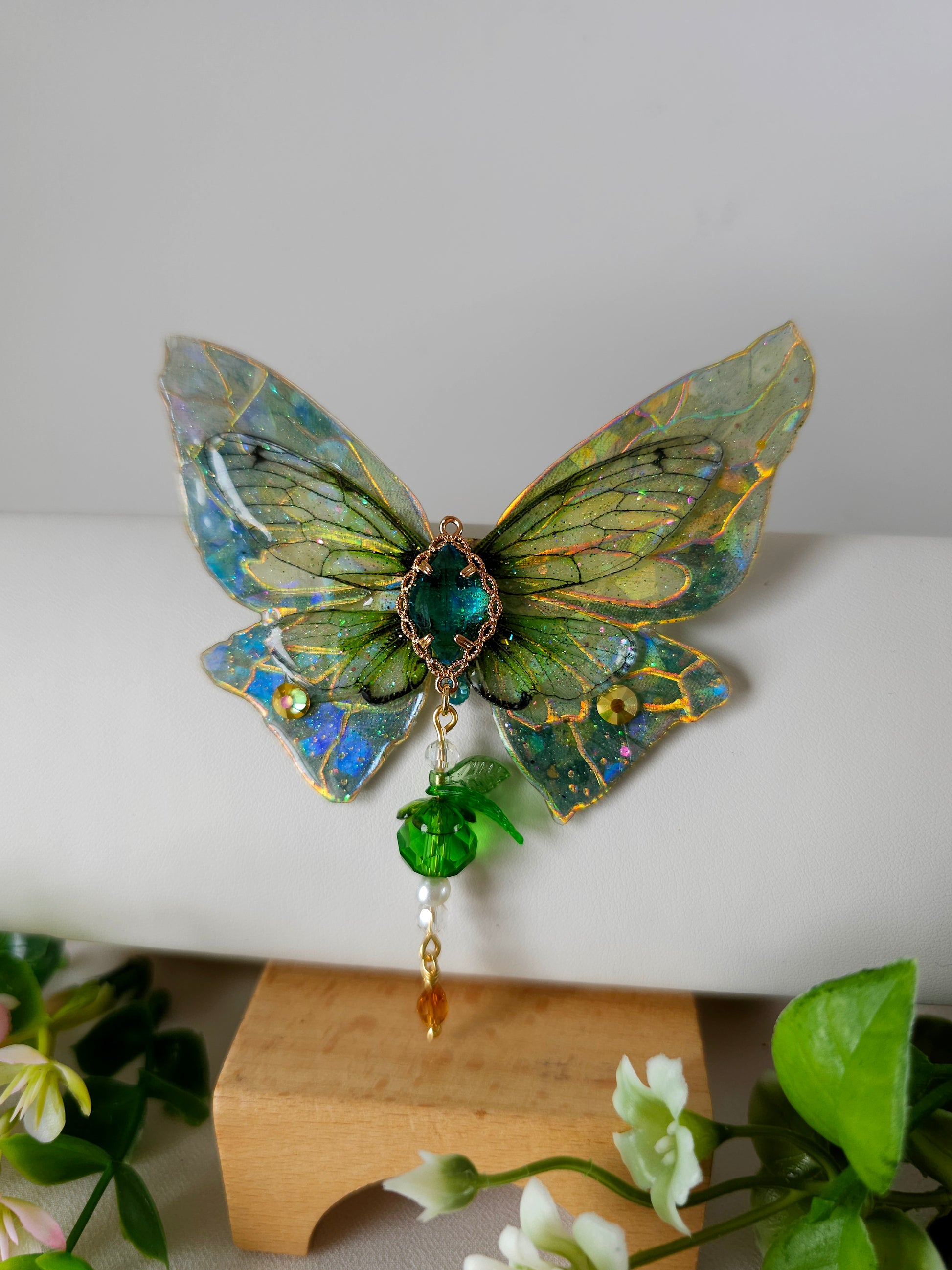 Aripile sunt realizate din rășină non-toxică, ușoară și rezistentă, decorate manual cu pigmenți irizanți, reflexii multicolore și strasuri strălucitoare ce captează lumina din orice unghi.