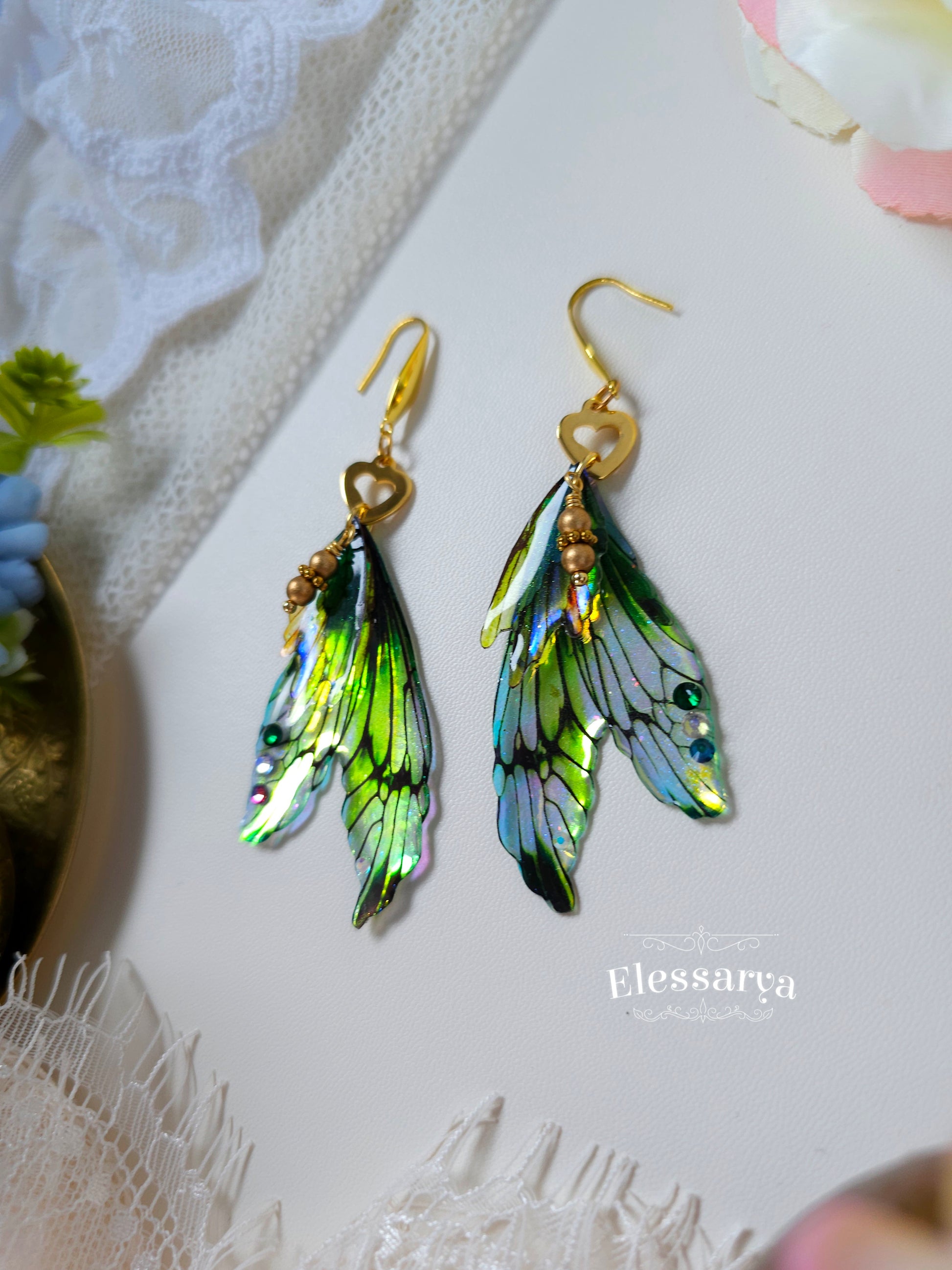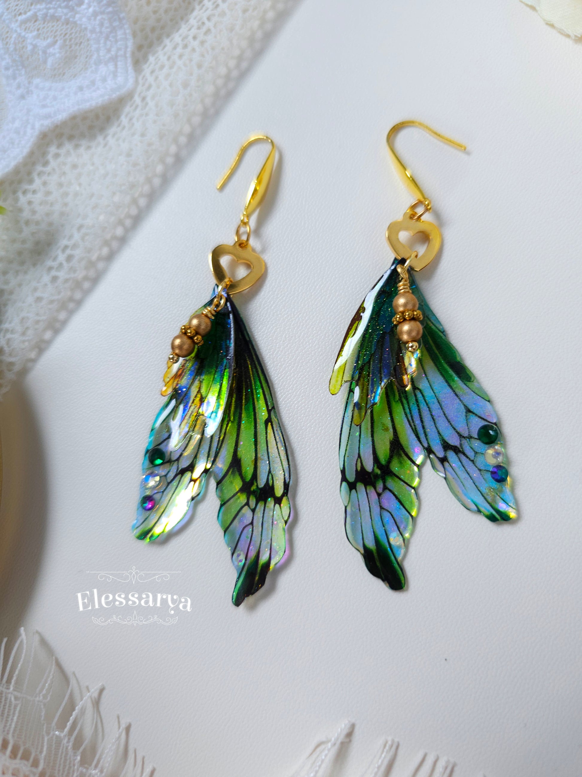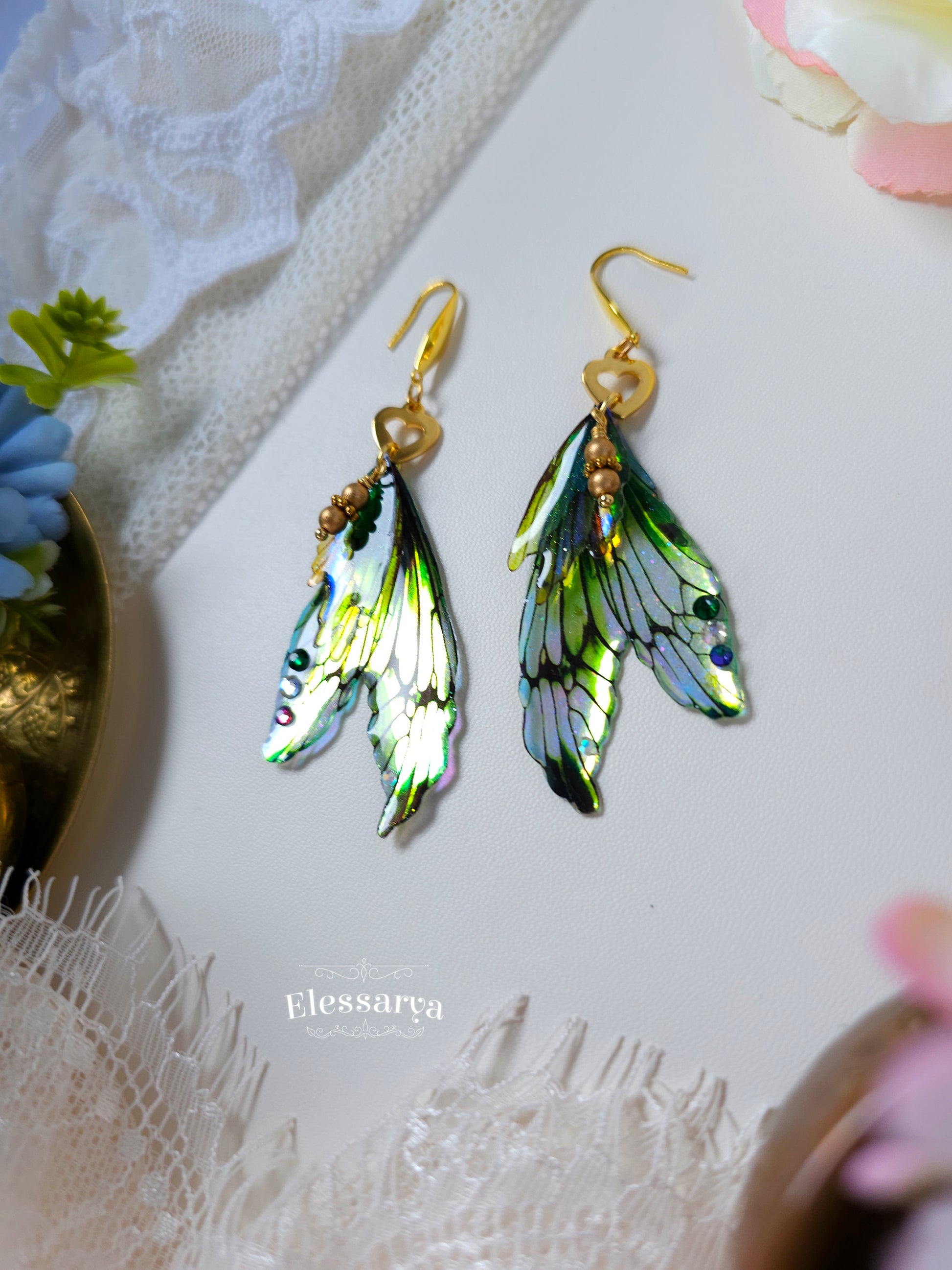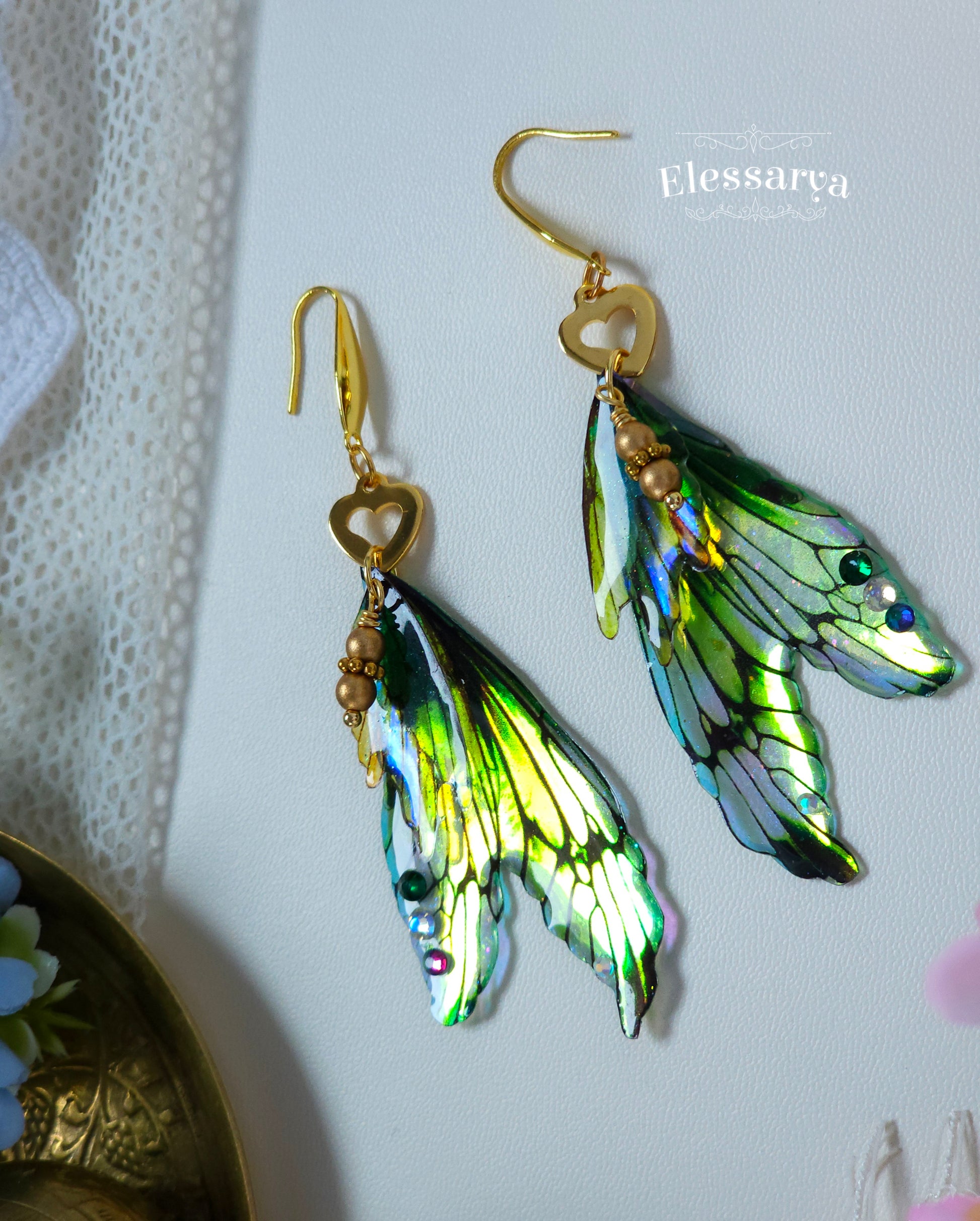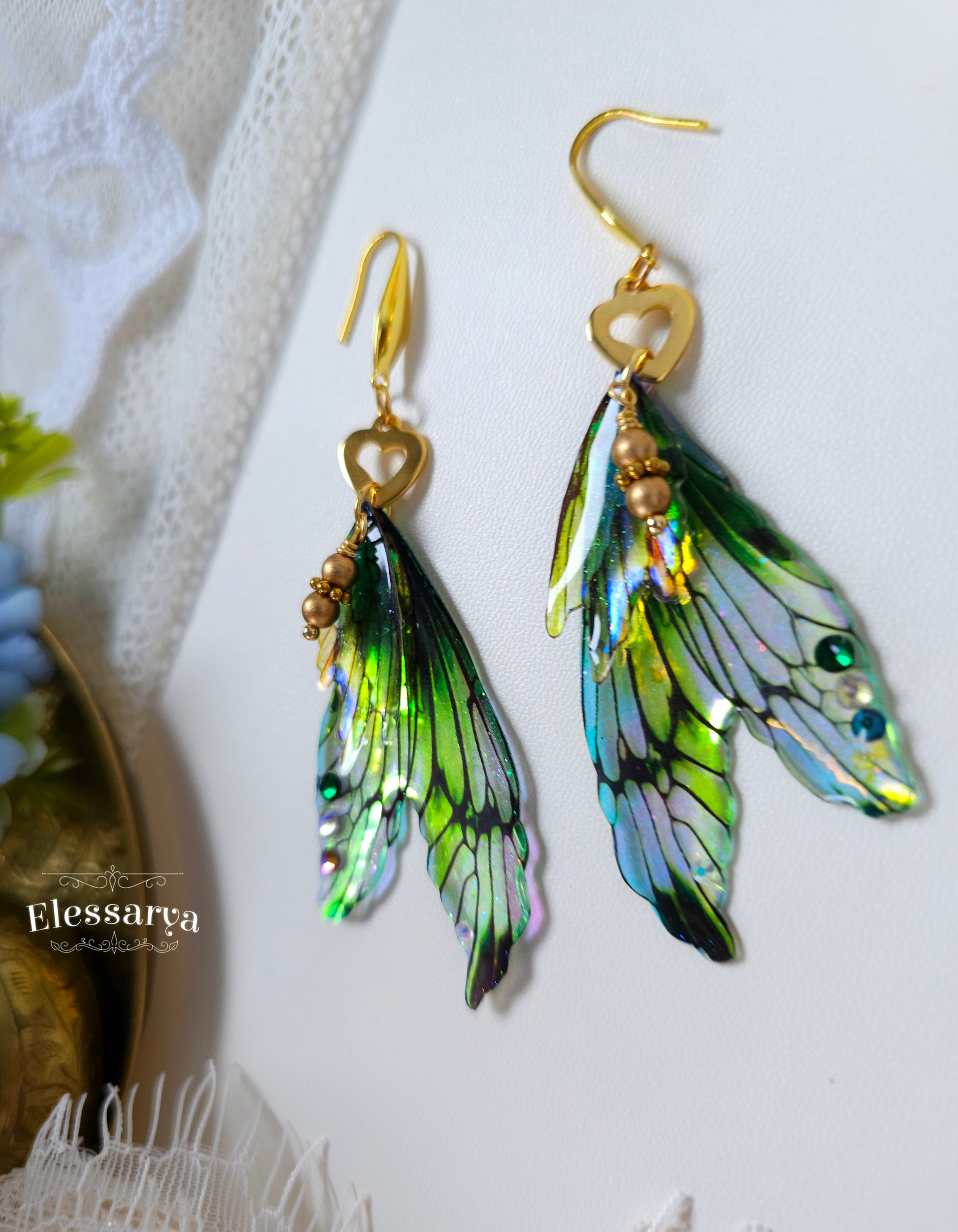 Acești cercei poartă aripi translucide din rășină non-toxică, scăldate în reflexii vii de verde, care se transformă subtil în funcție de lumină și unghi. Nuanțele lor amintesc de frunziș tânăr, smarald și licăriri de aur verde, ca o dragoste care nu stă pe loc, ci evoluează și respiră.