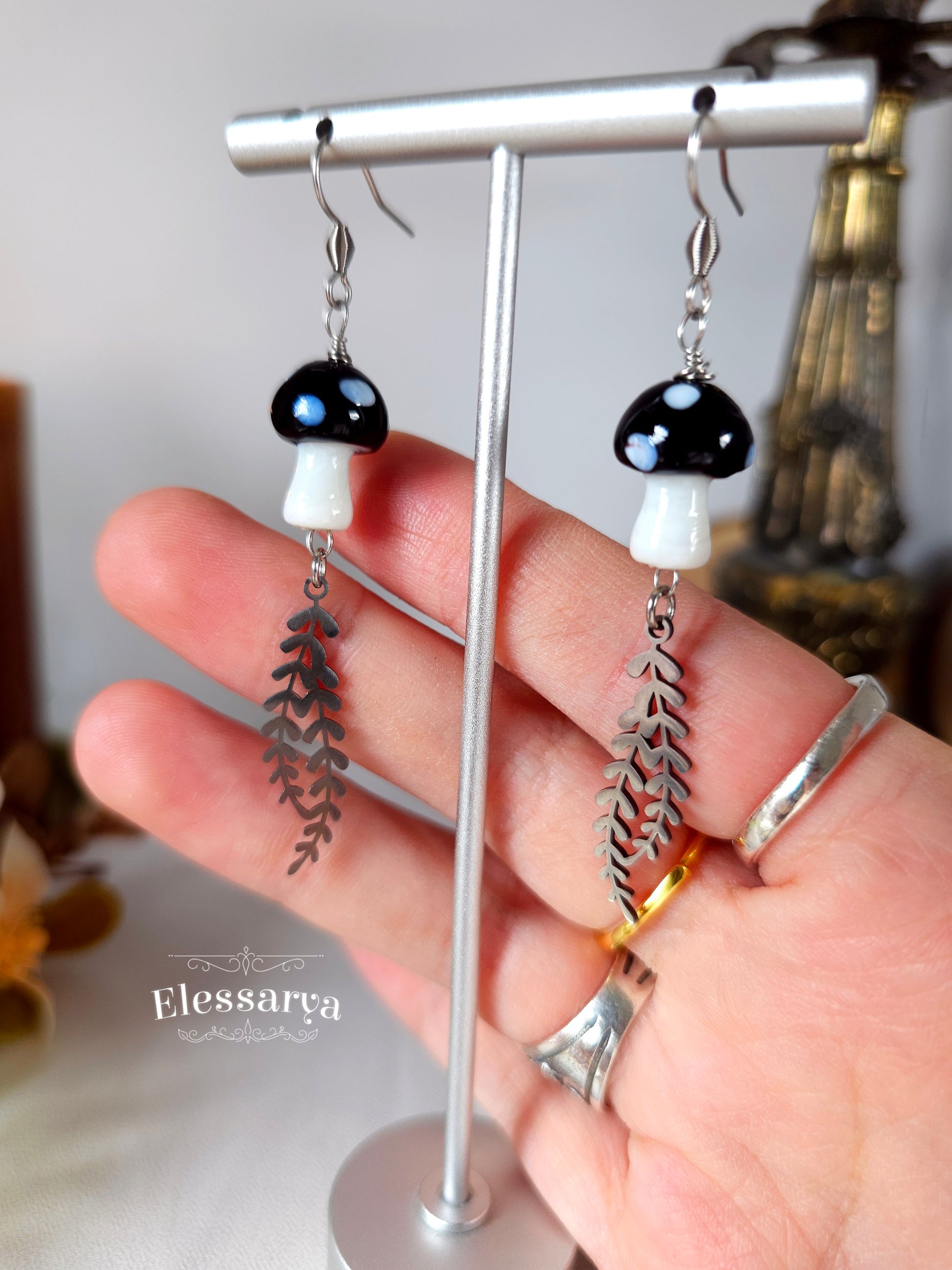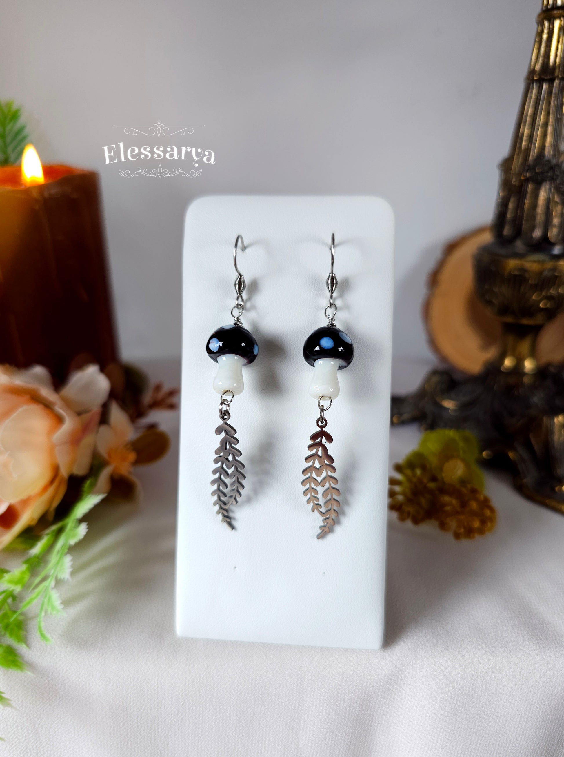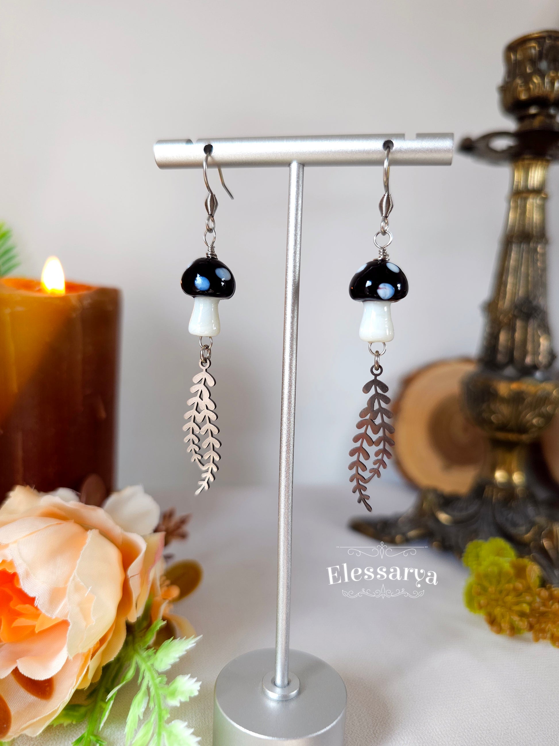Acești cercei par desprinși dintr-o pădure de toamnă, unde ferigile argintii foșnesc printre ciupercuțe ascunse în iarbă.