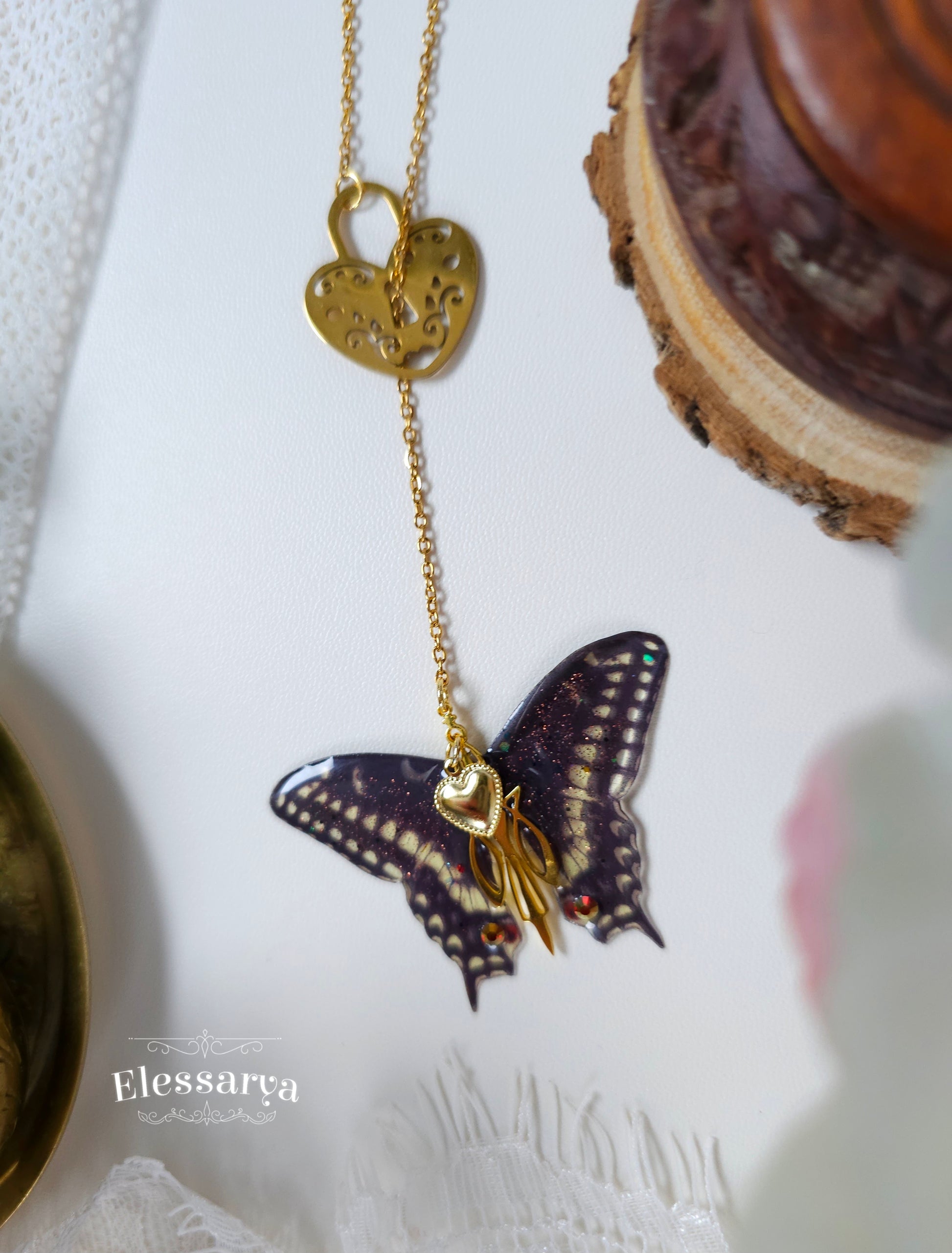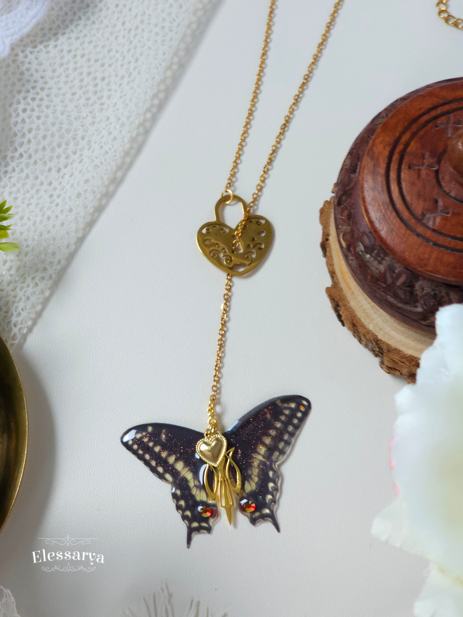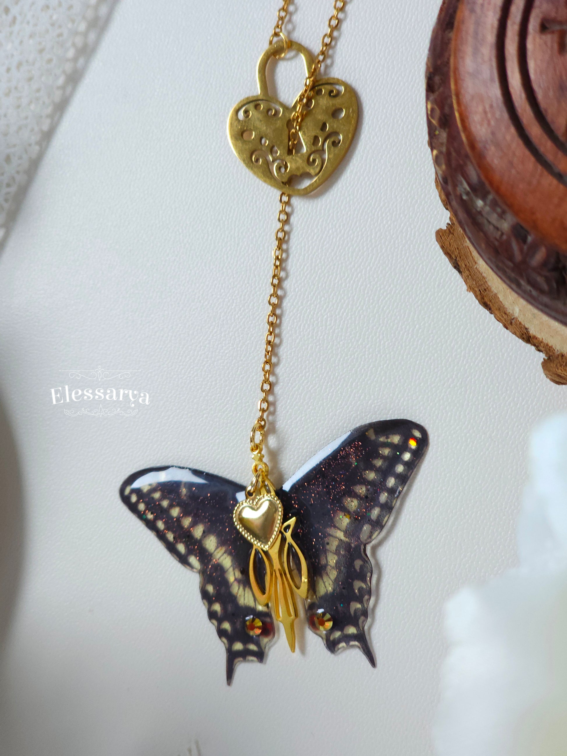 Pandantivul în formă de fluture, realizat din rășină non-toxică, are un finisaj negru mat, profund și misterios. Contrastul dintre negrul catifelat și accentele aurii creează o bijuterie elegantă, cu aer simbolic: transformare, libertate și dragoste care nu constrânge. Micile detalii aurii completează compoziția cu rafinament, fără a-i lua din delicatețe.