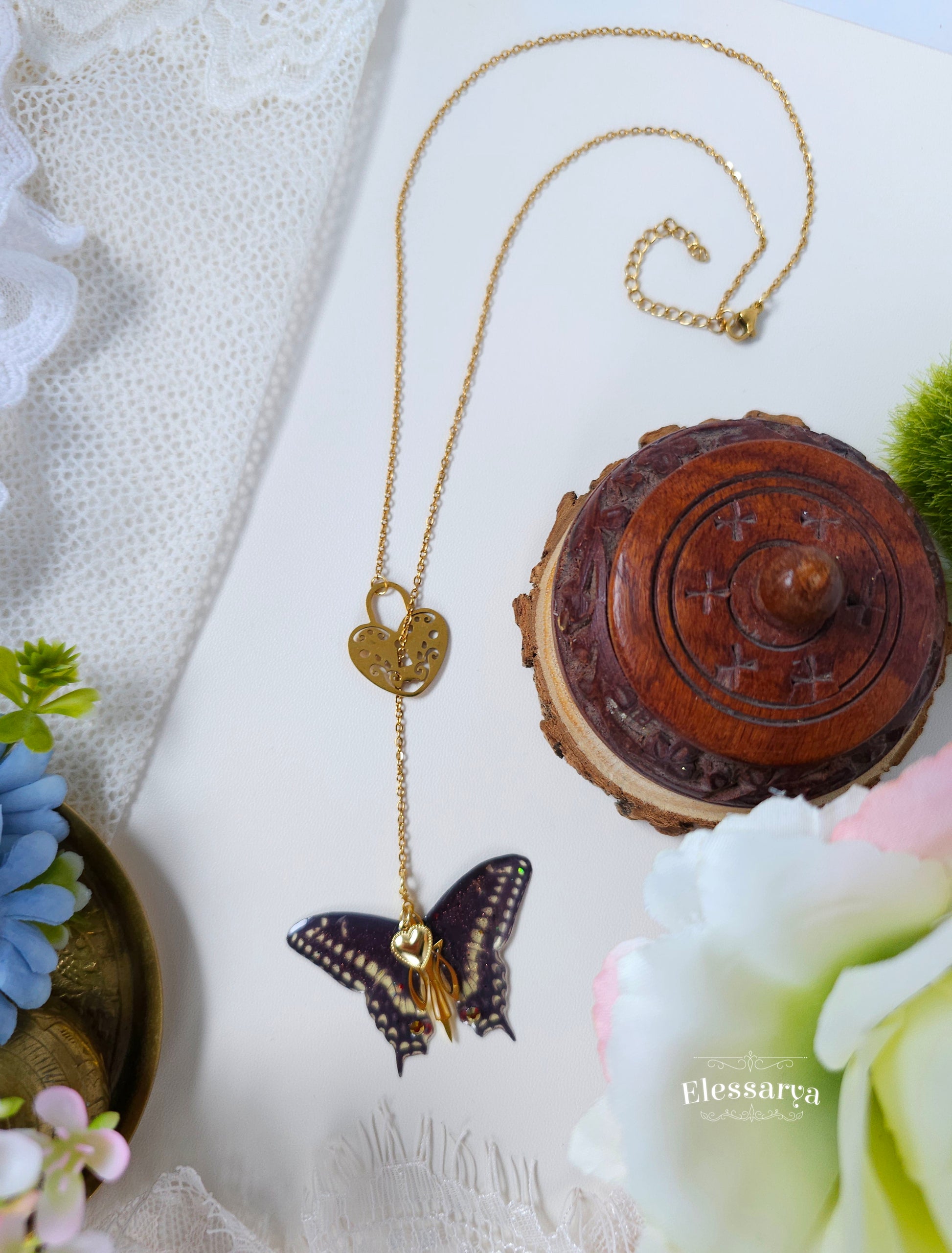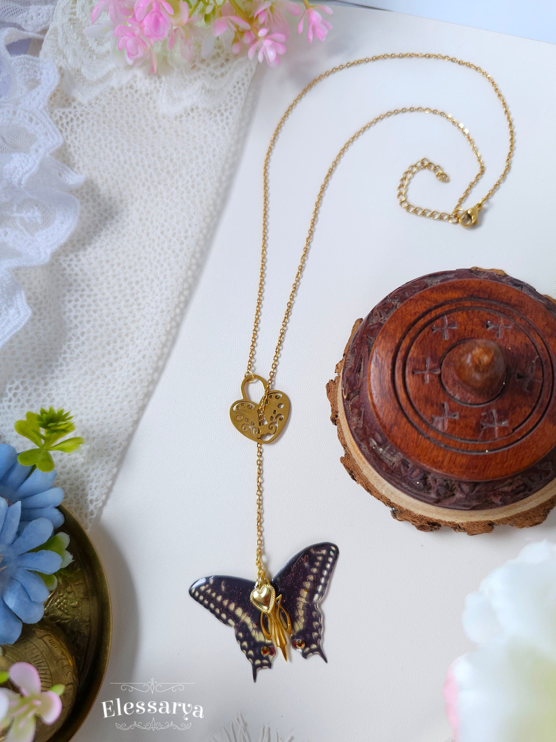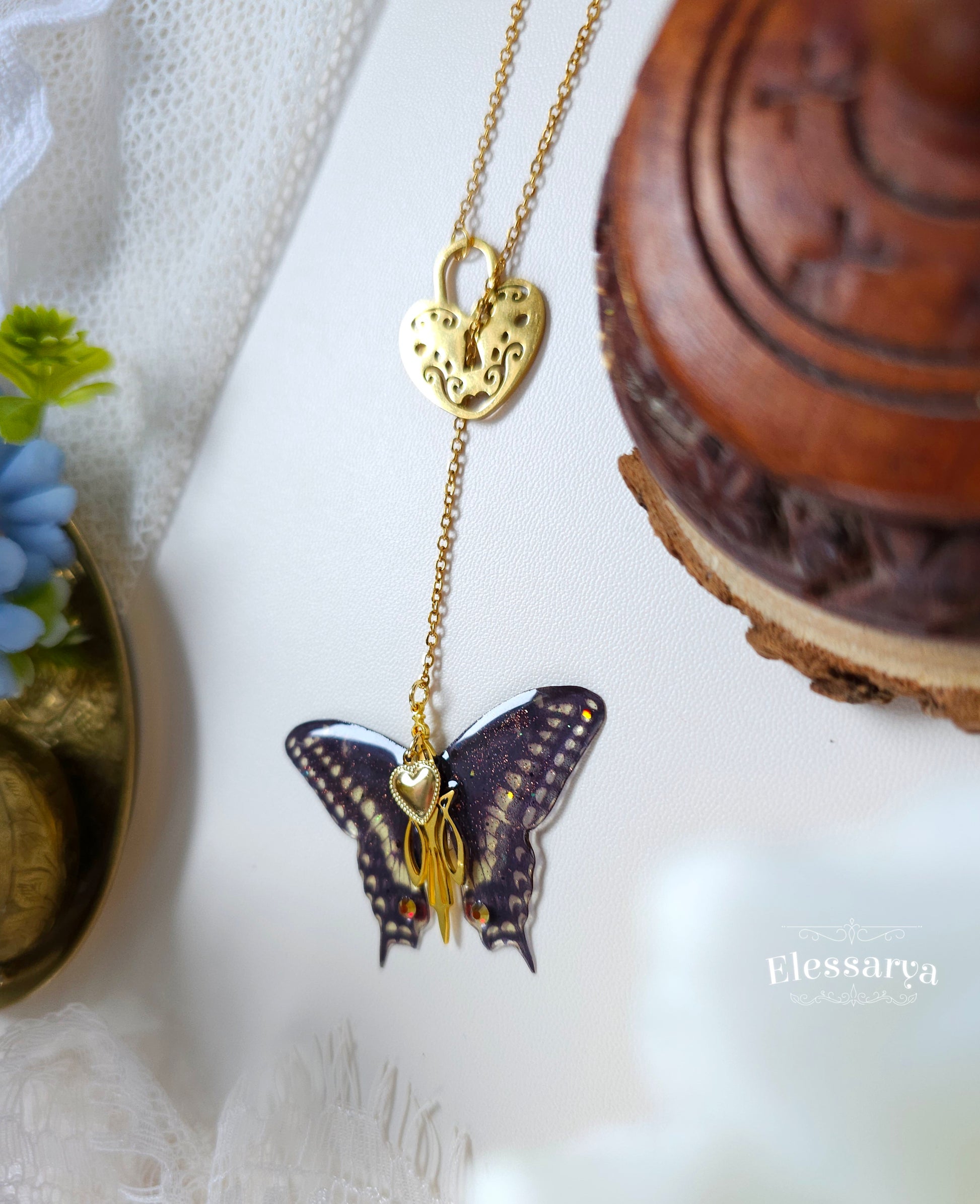Pandantivul în formă de fluture, realizat din rășină non-toxică, are un finisaj negru mat, profund și misterios. Contrastul dintre negrul catifelat și accentele aurii creează o bijuterie elegantă, cu aer simbolic: transformare, libertate și dragoste care nu constrânge. Micile detalii aurii completează compoziția cu rafinament, fără a-i lua din delicatețe.