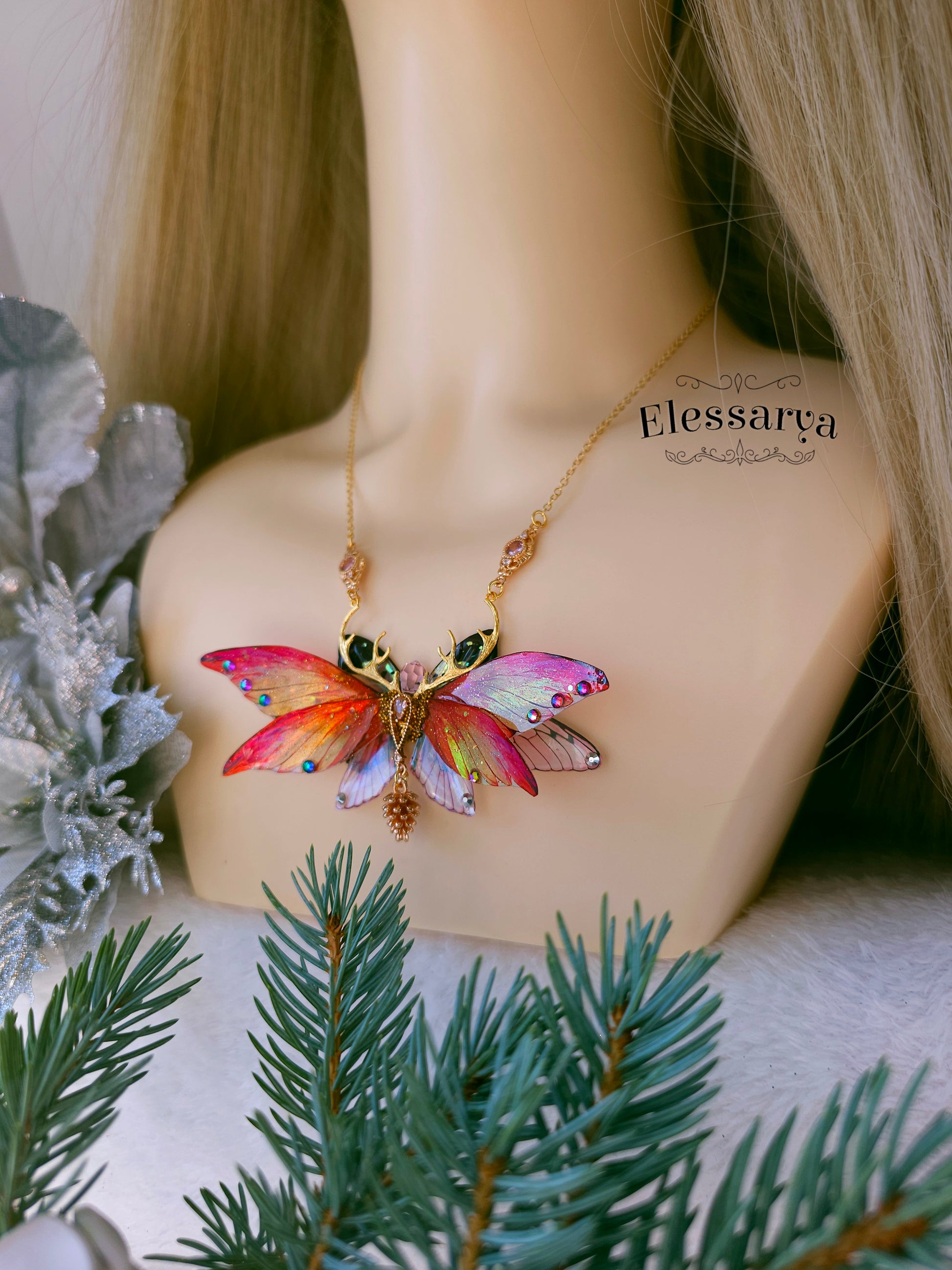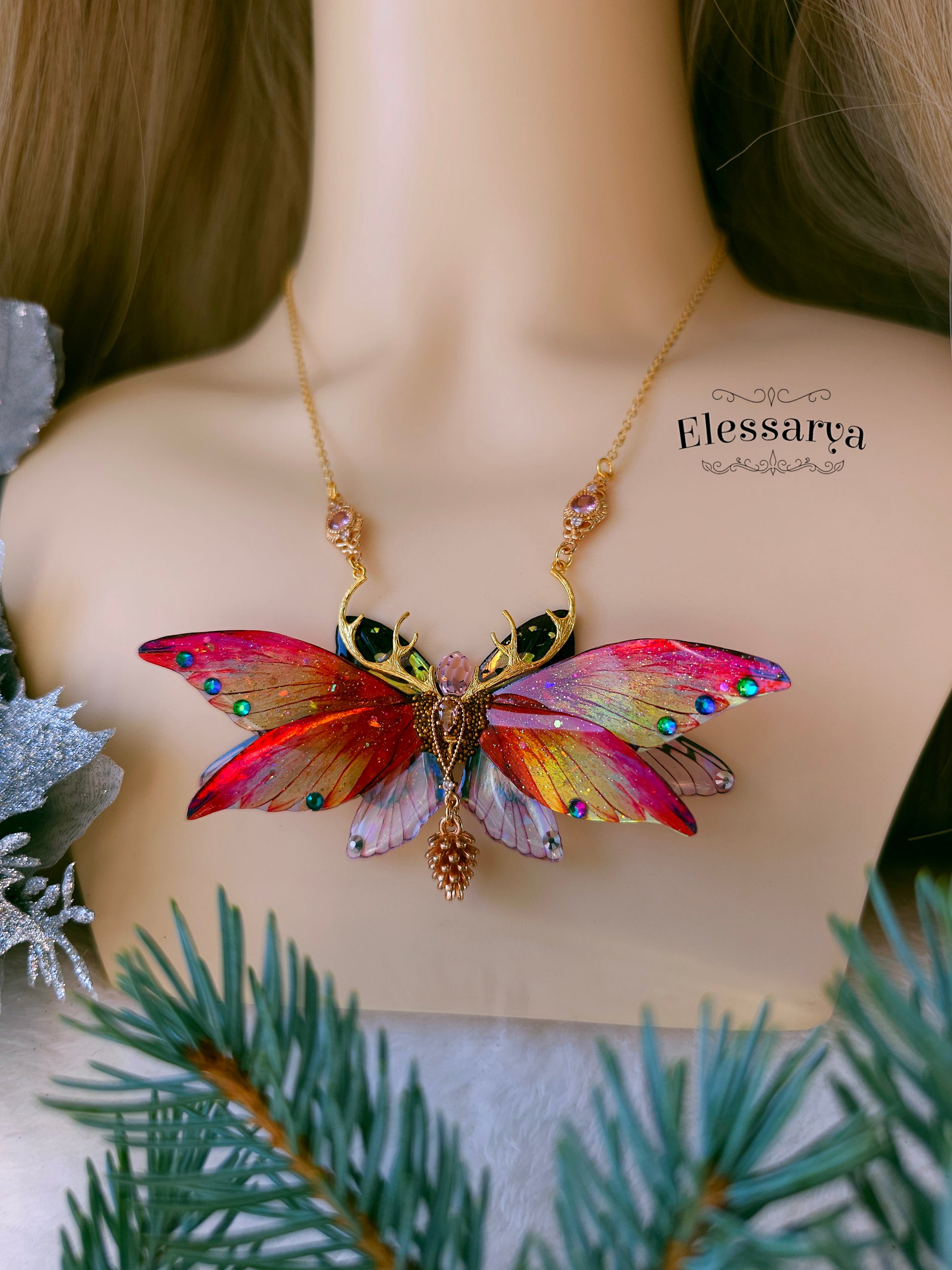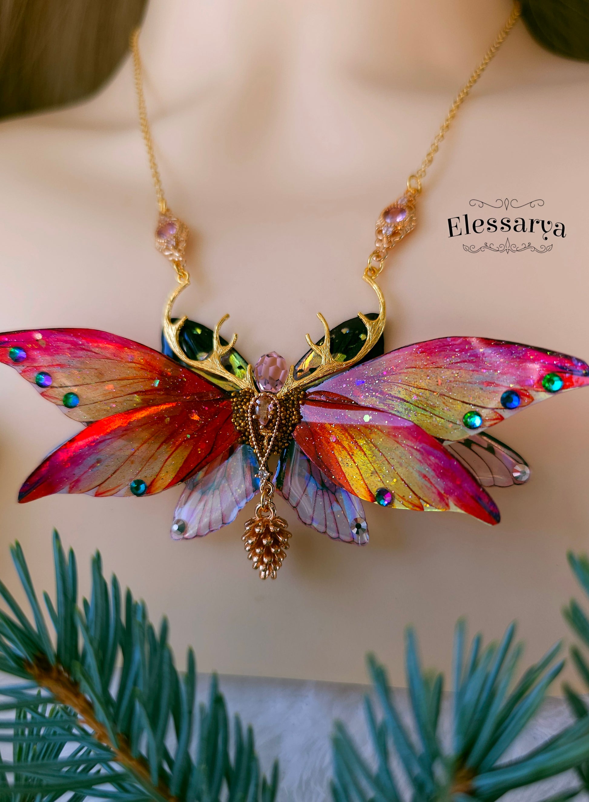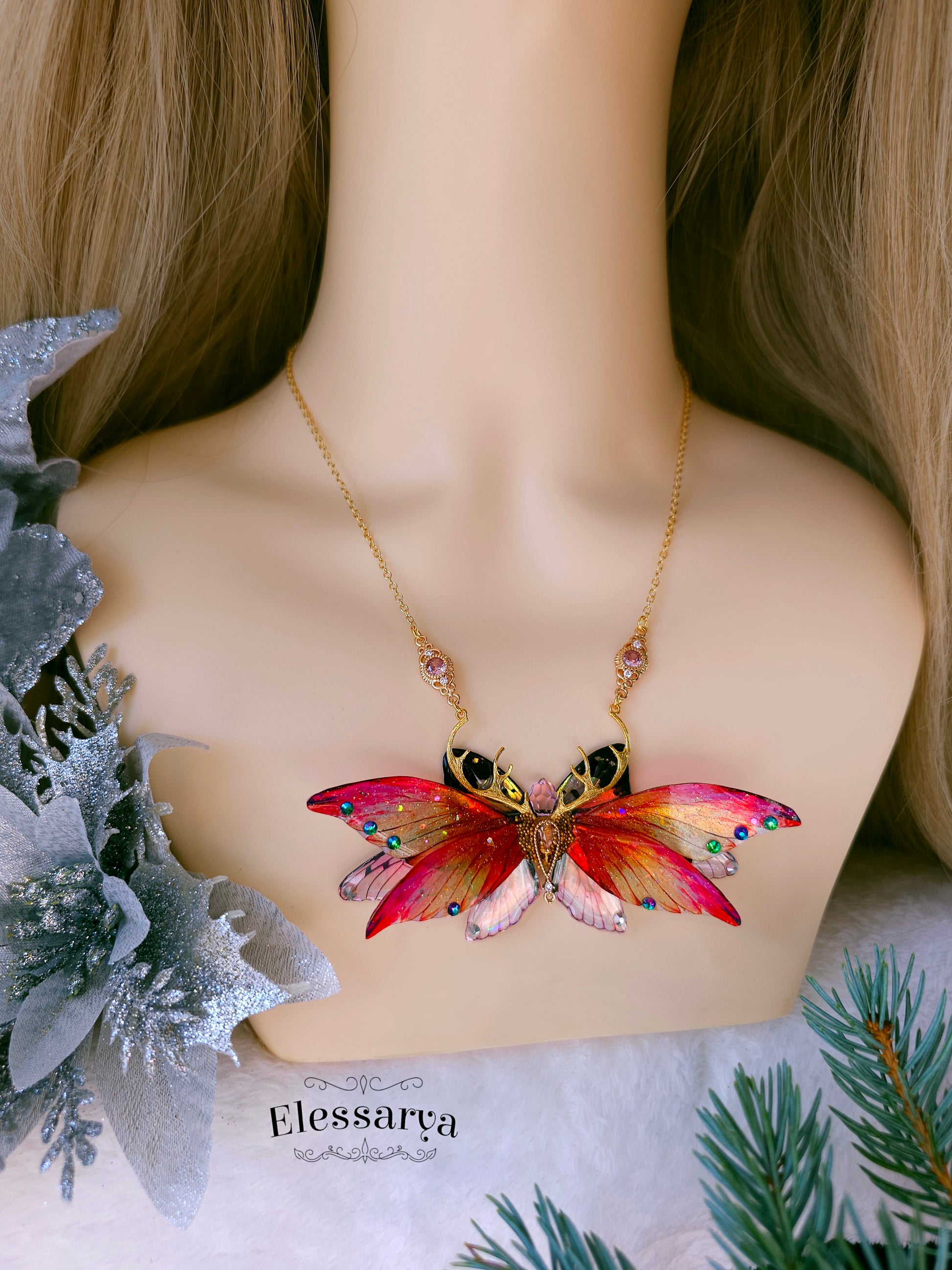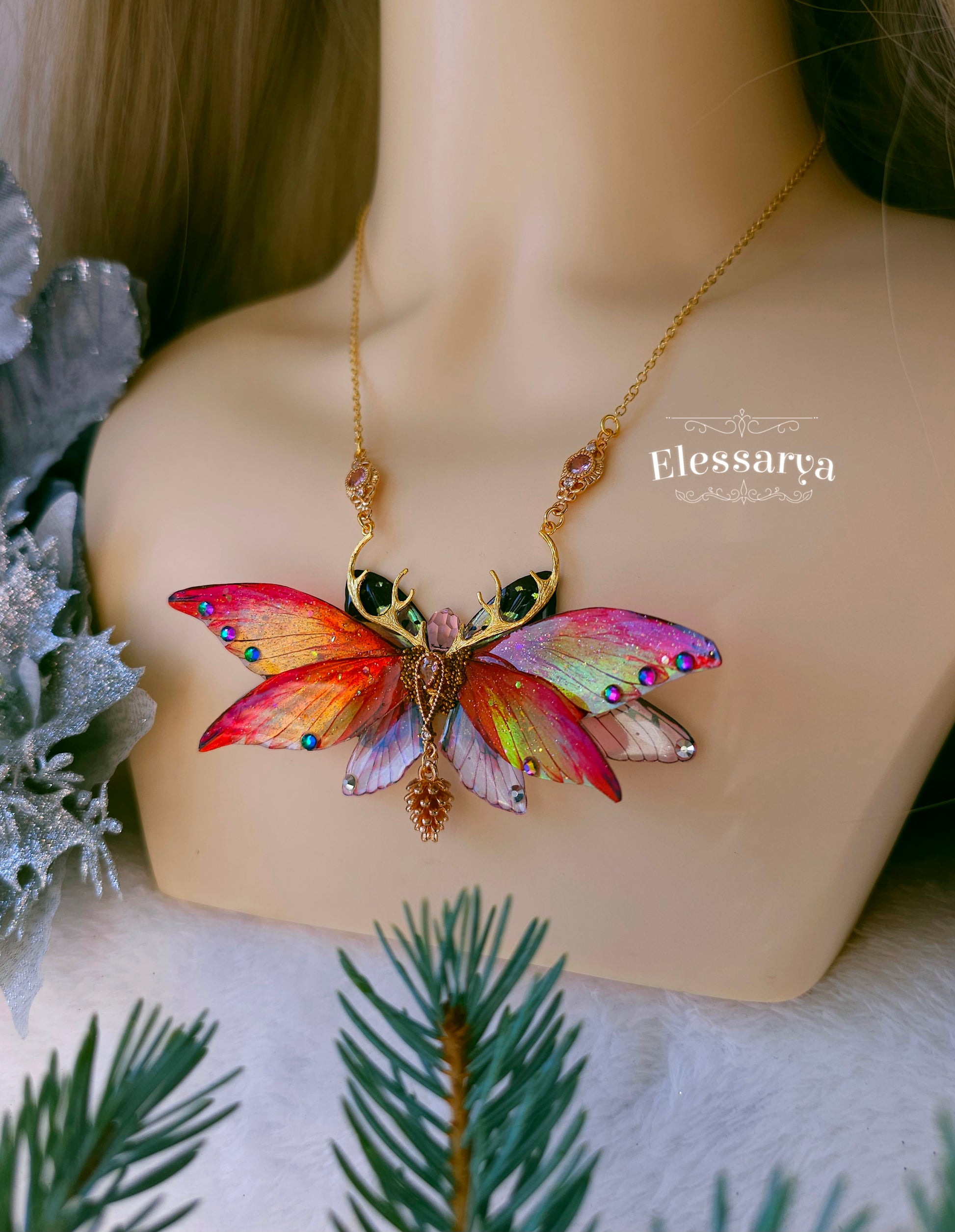 Colier absolut spectaculos, cu aripi de zână suprapuse 3D, lucrate manual din rășină non-toxică. Aripile sunt iridiscente și captează lumina cu reflexii de curcubeu, trecând de la roz intens la portocaliu și roșu – exact ca jarul cald al unui foc de iarnă.