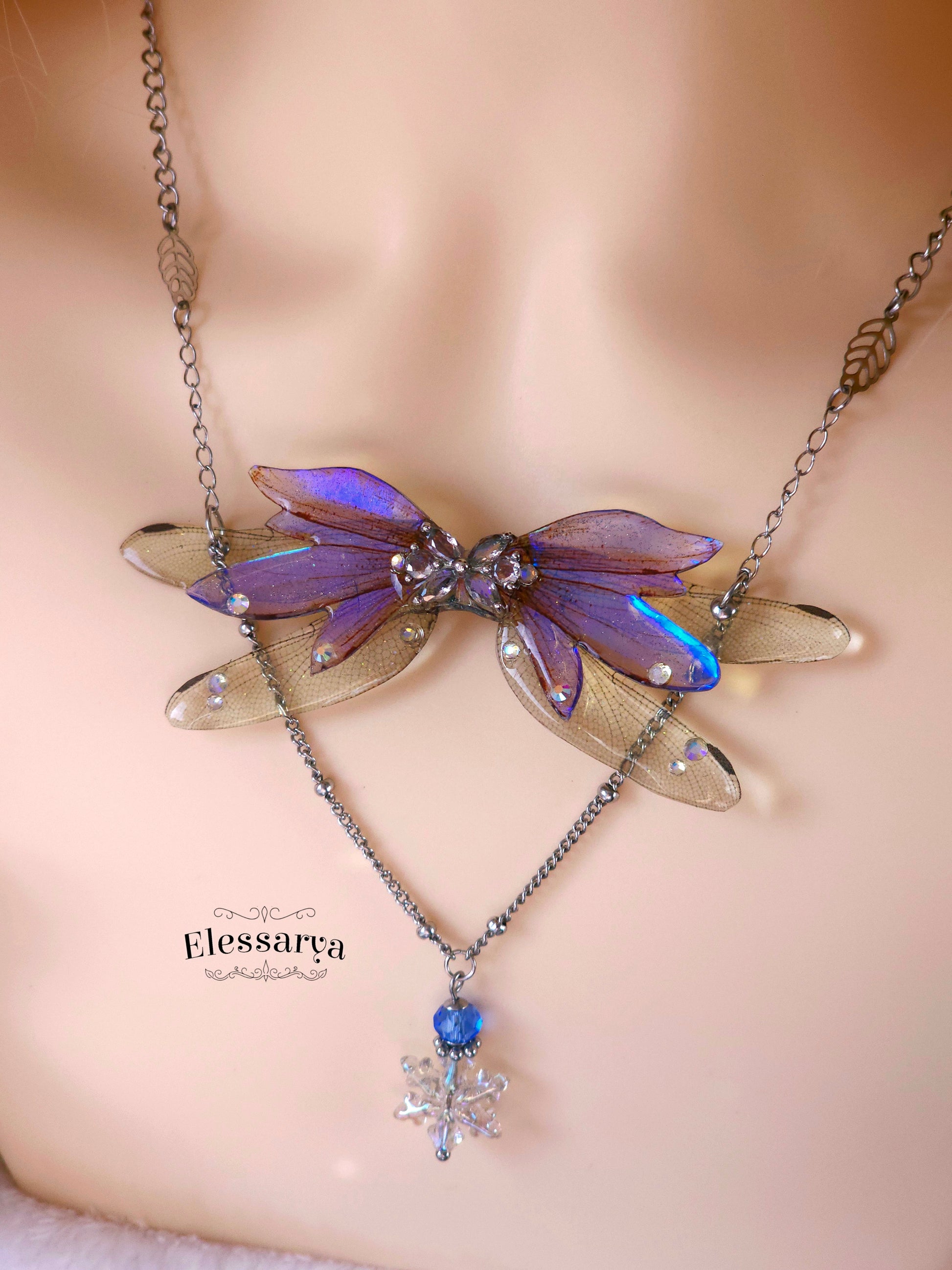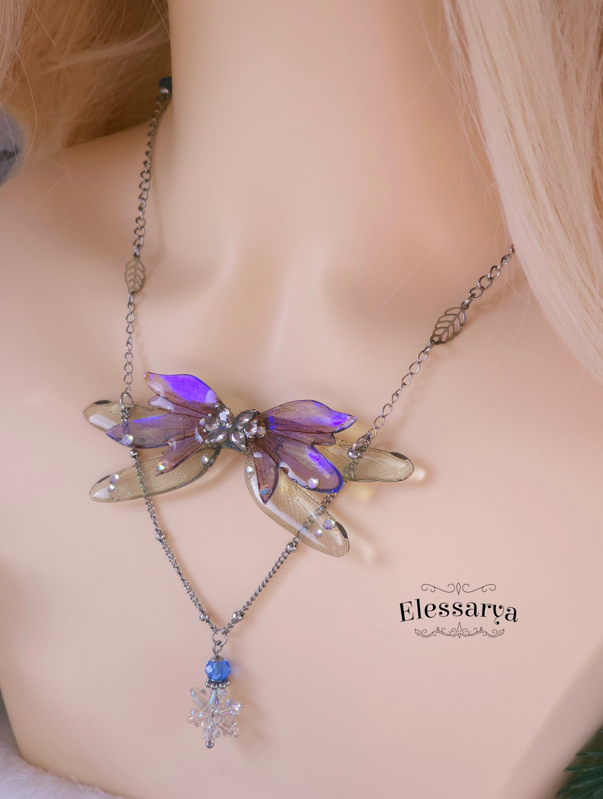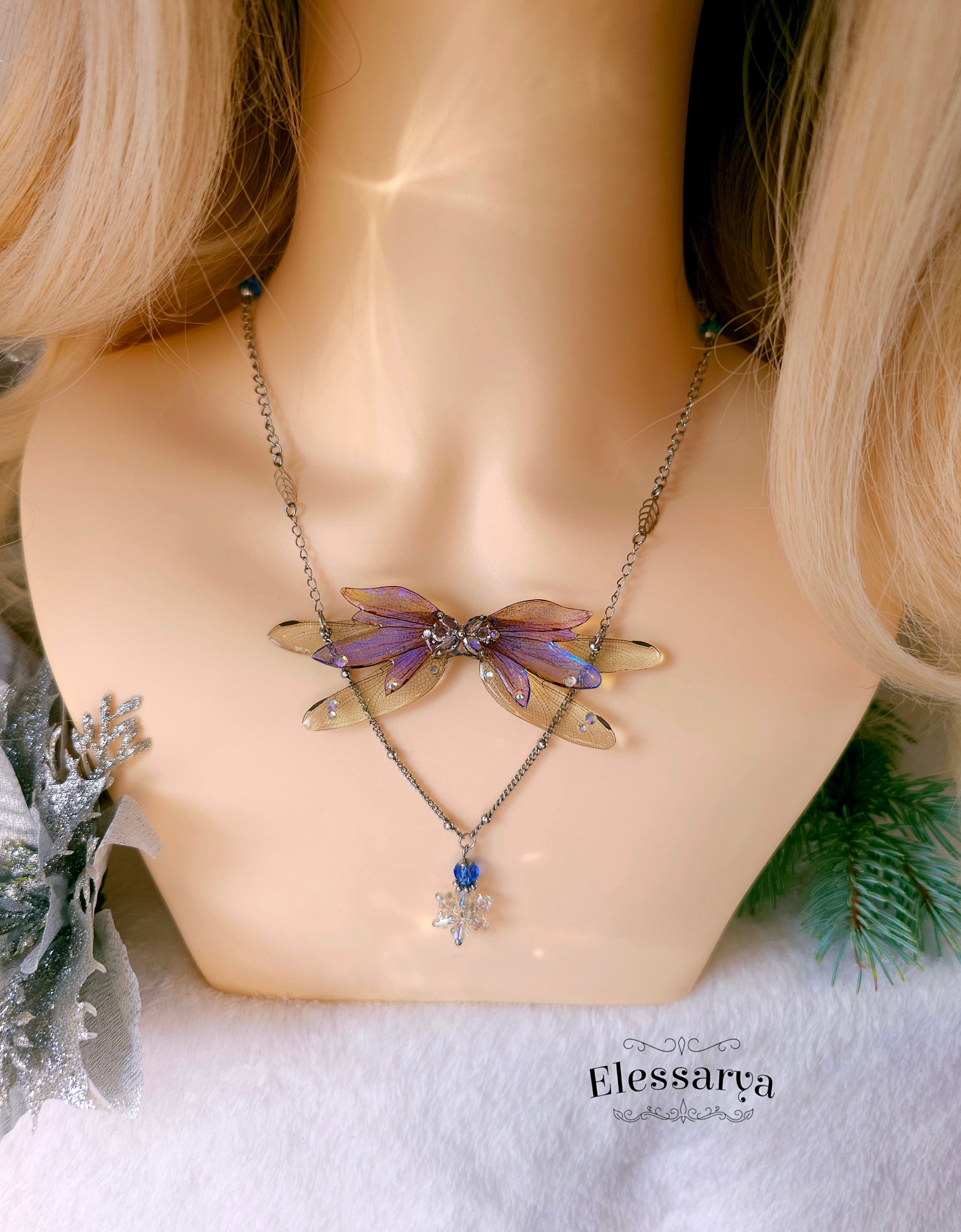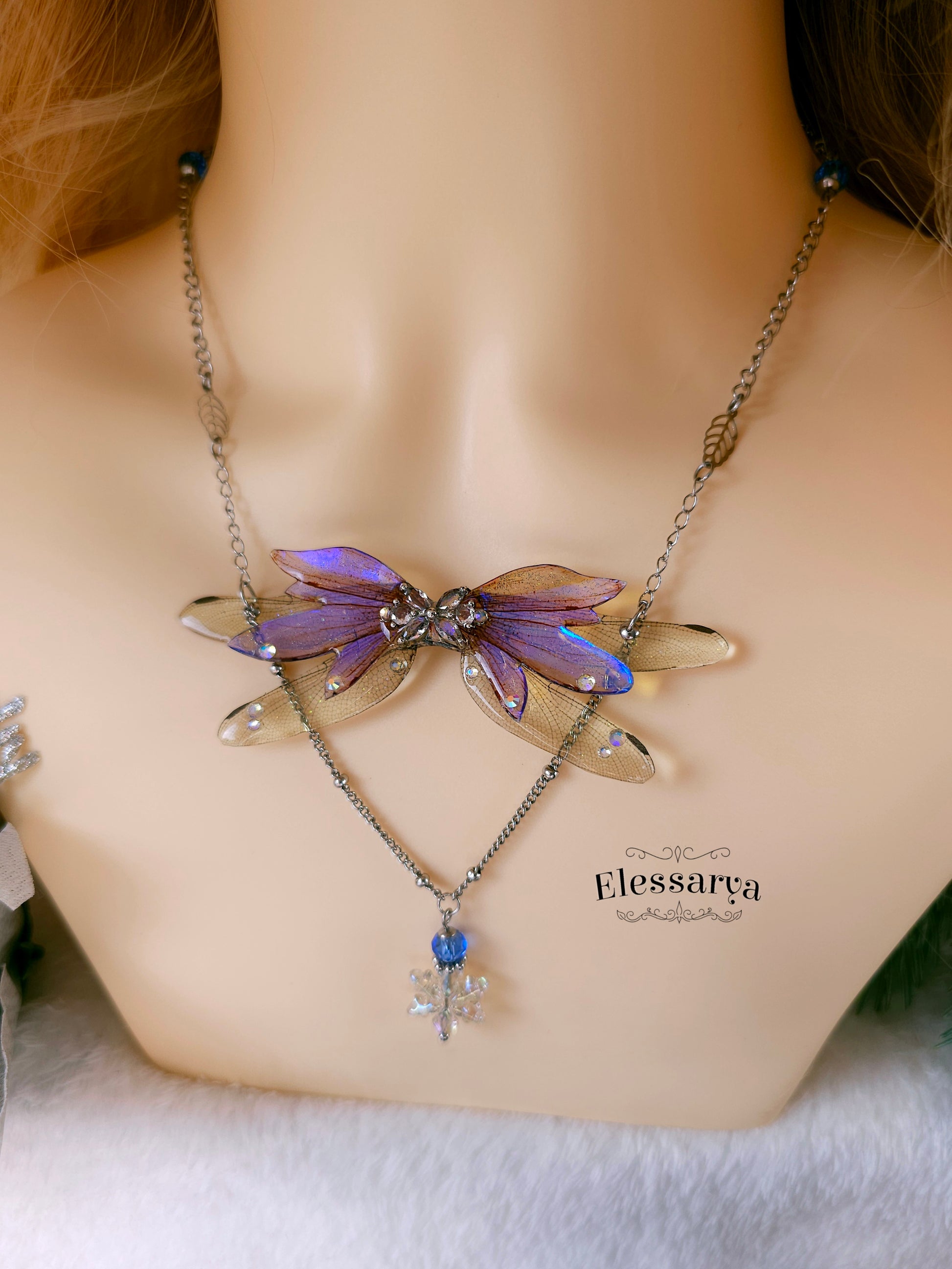 Un colier cu aer de basm iernatic, creat în jurul unei zâne-libelulă reinterpretate, cu aripi delicate lucrate manual din rășină non-toxică.