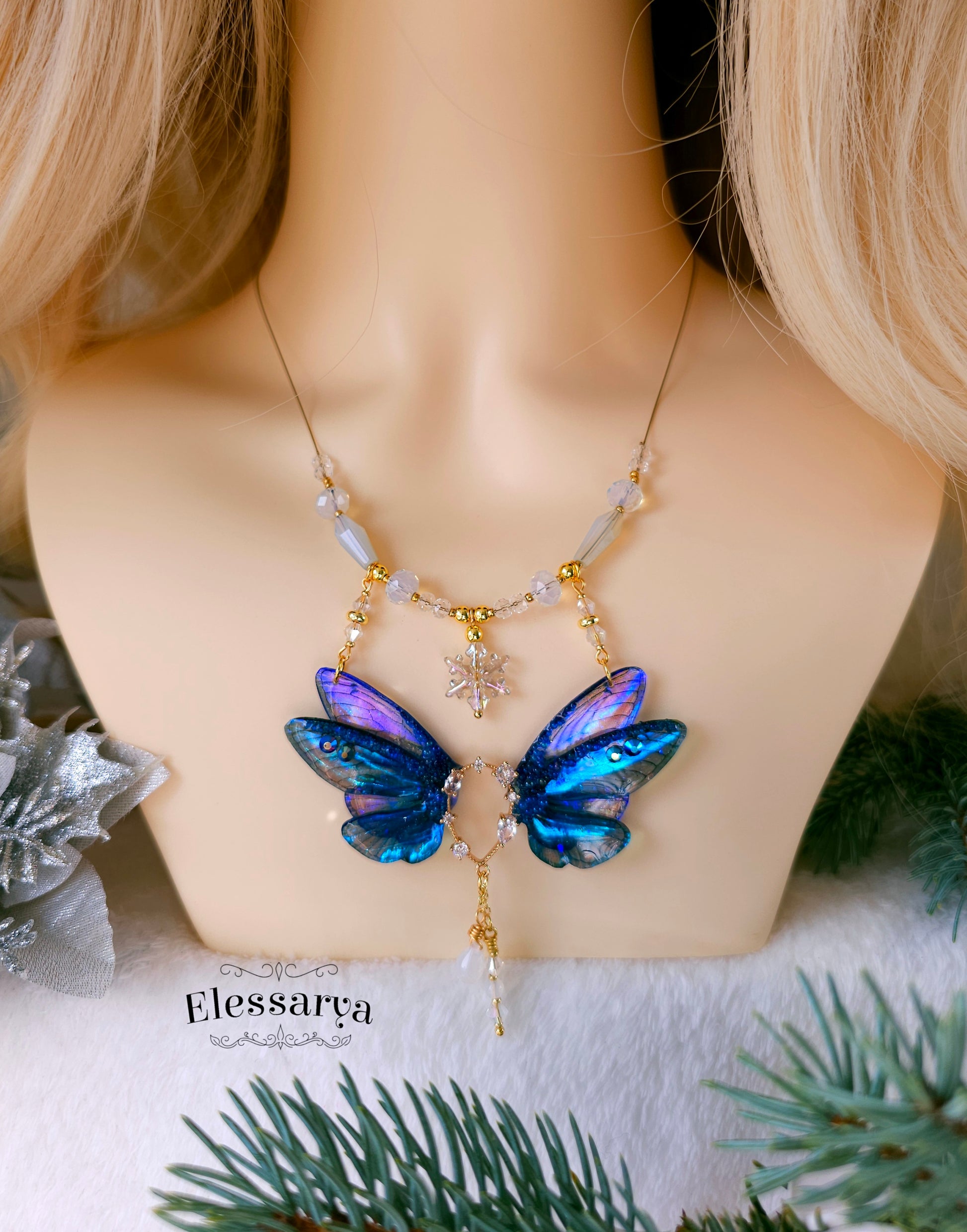 Un colier spectaculos, perfect pentru cine iubește combinația dintre albastru intens, accente aurii și magia discretă a detaliilor de iarnă.