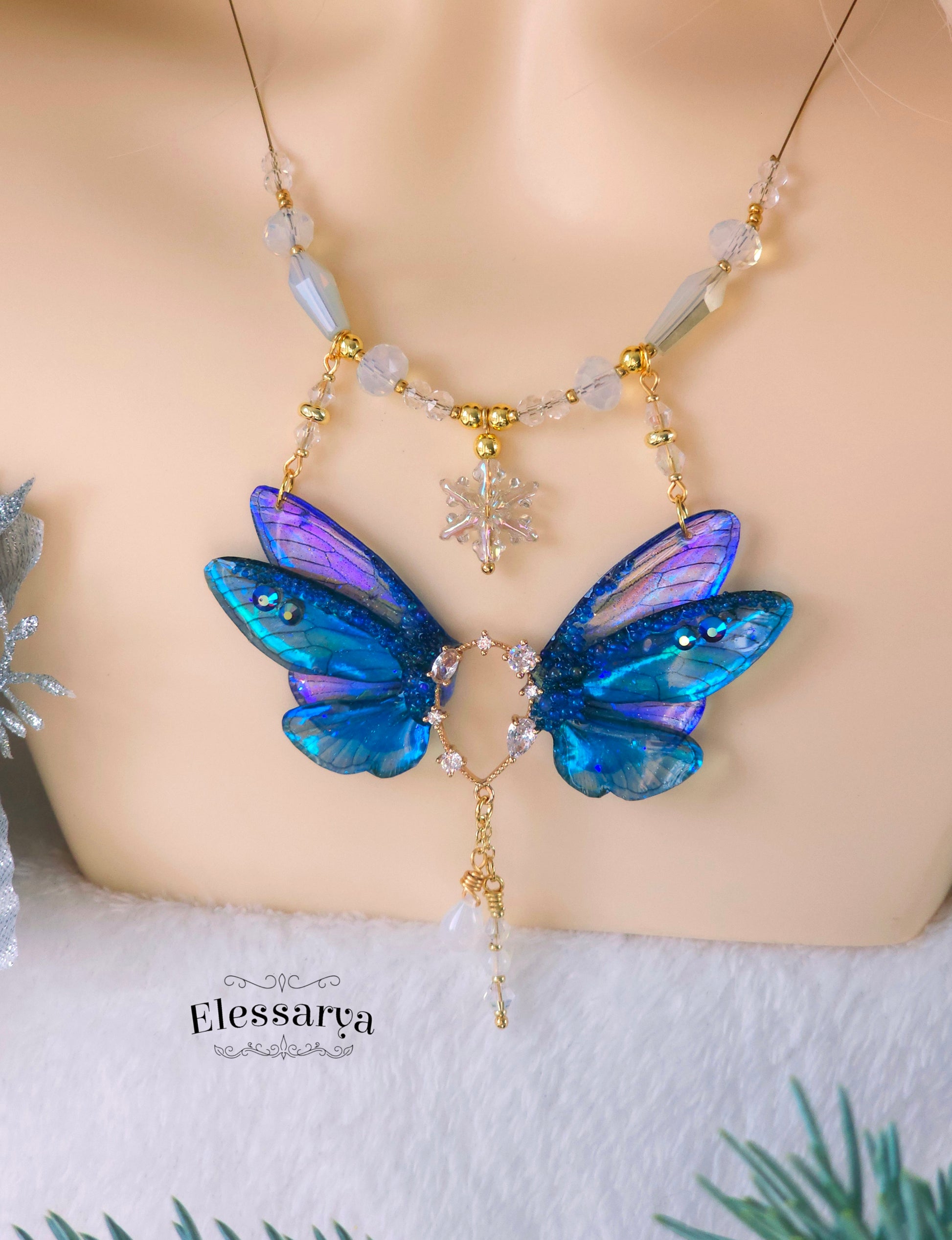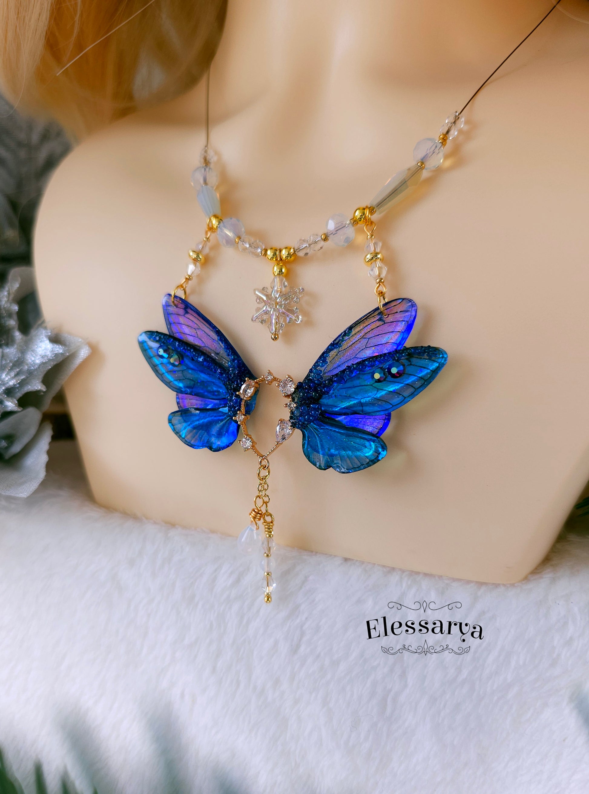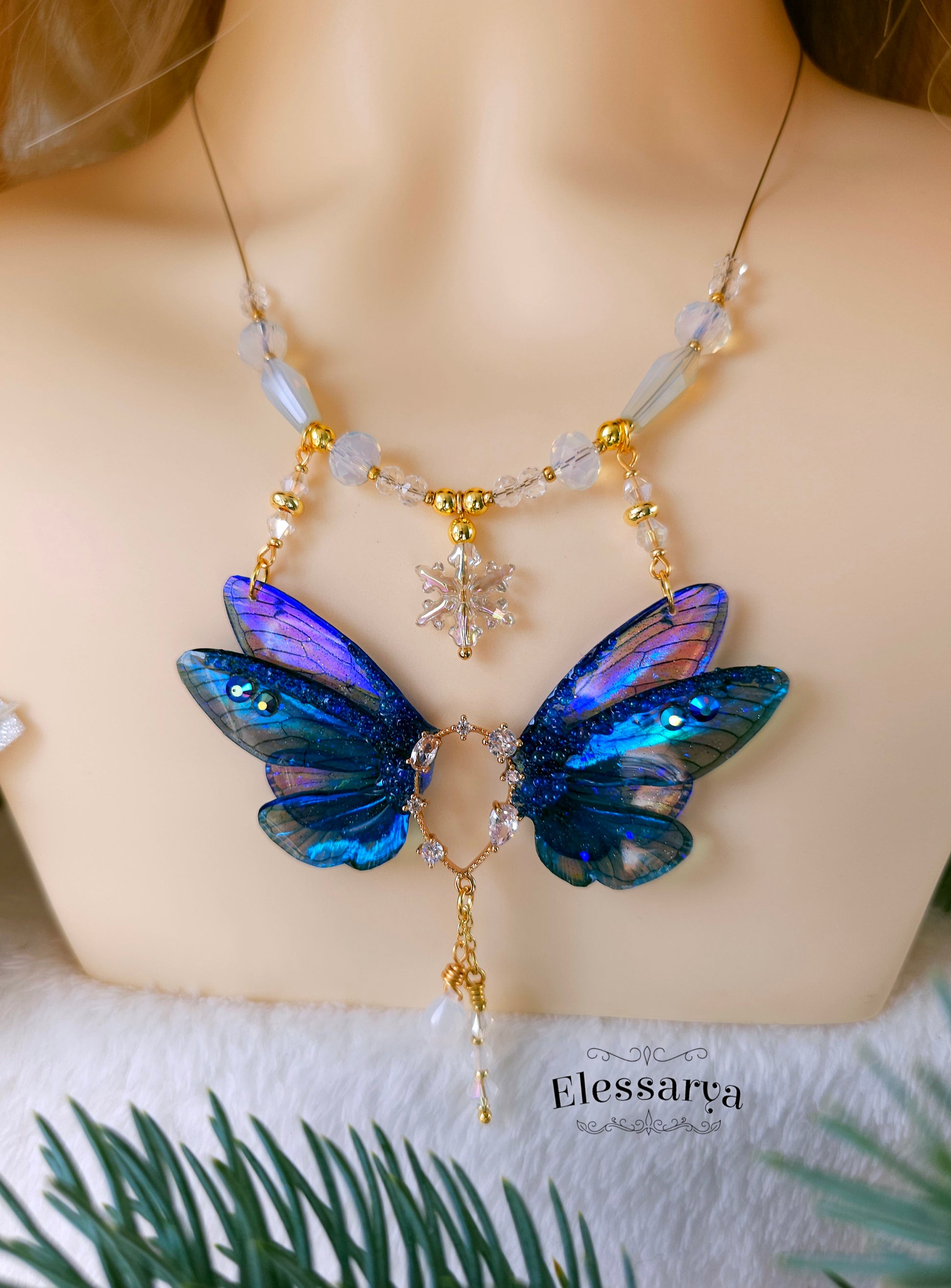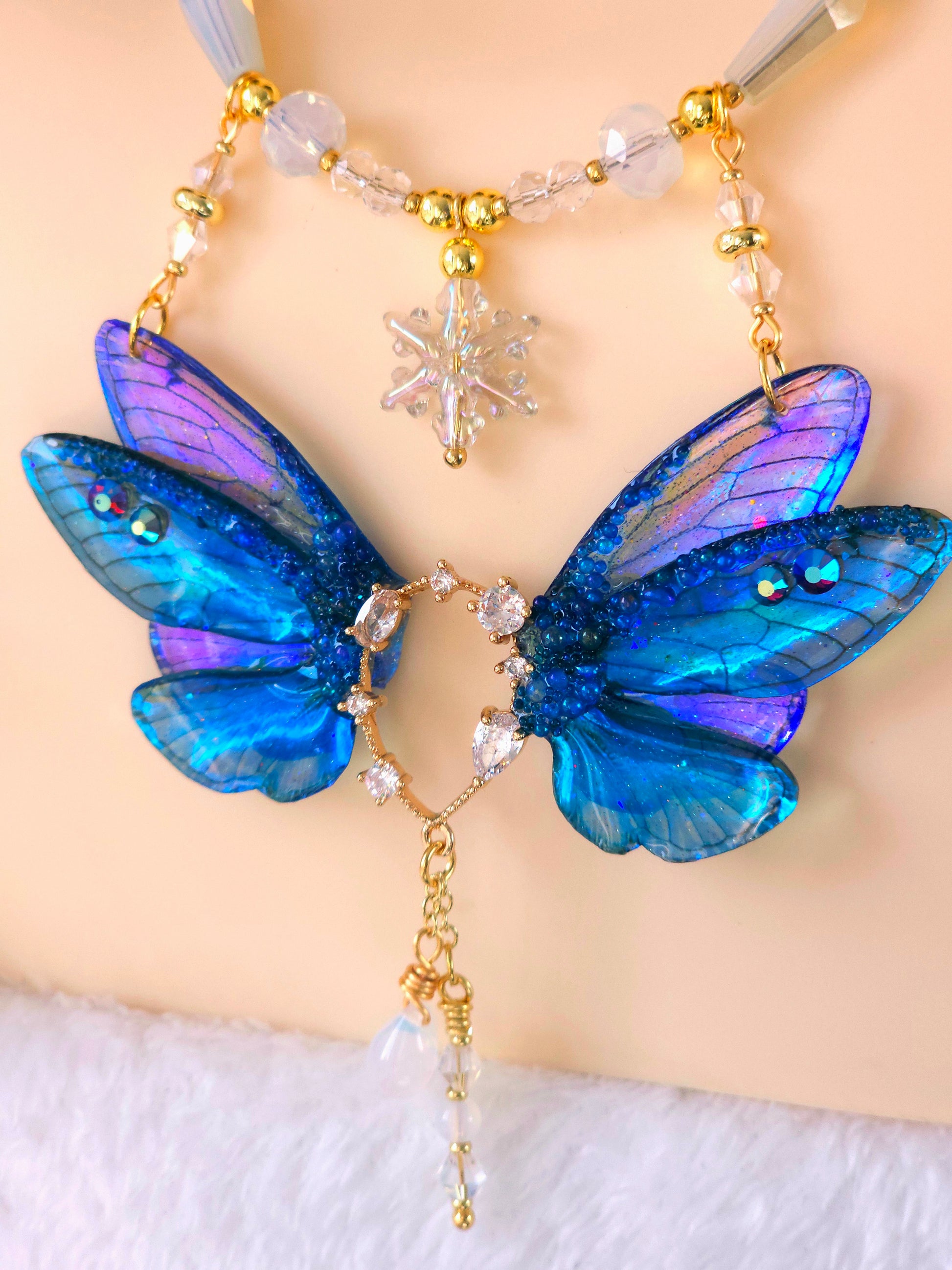 Un colier intens și regal, cu aripi de zână realizate din rășină non-toxică, în nuanțe de albastru închis, aproape Indigo. Culorile se schimbă în funcție de unghi și lumină, trecând de la albastru profund la reflexii luminoase care par să danseze pe suprafața aripilor. Detaliile sunt decorate cu mici pietricele tip rhinestone care adaugă strălucire fină.