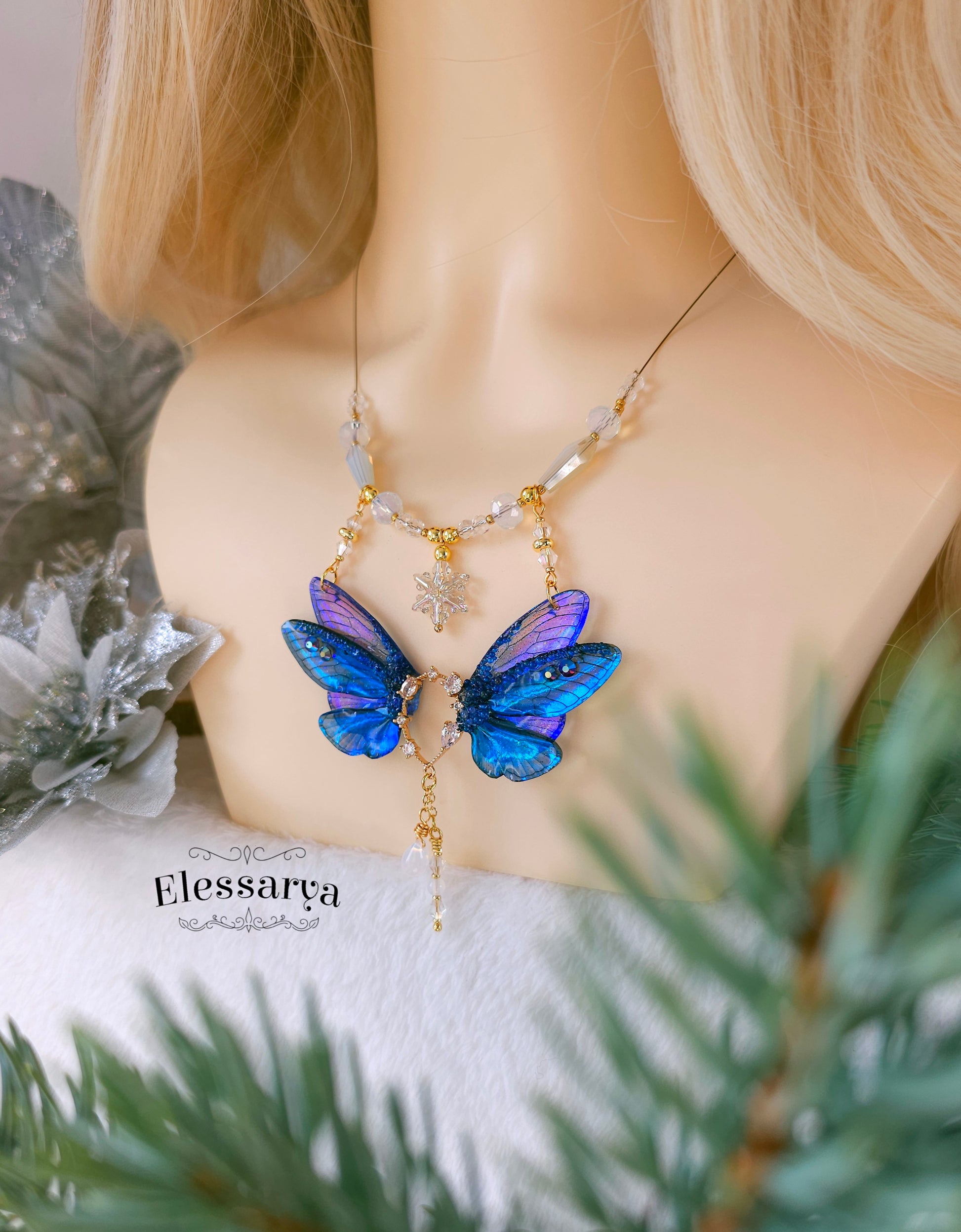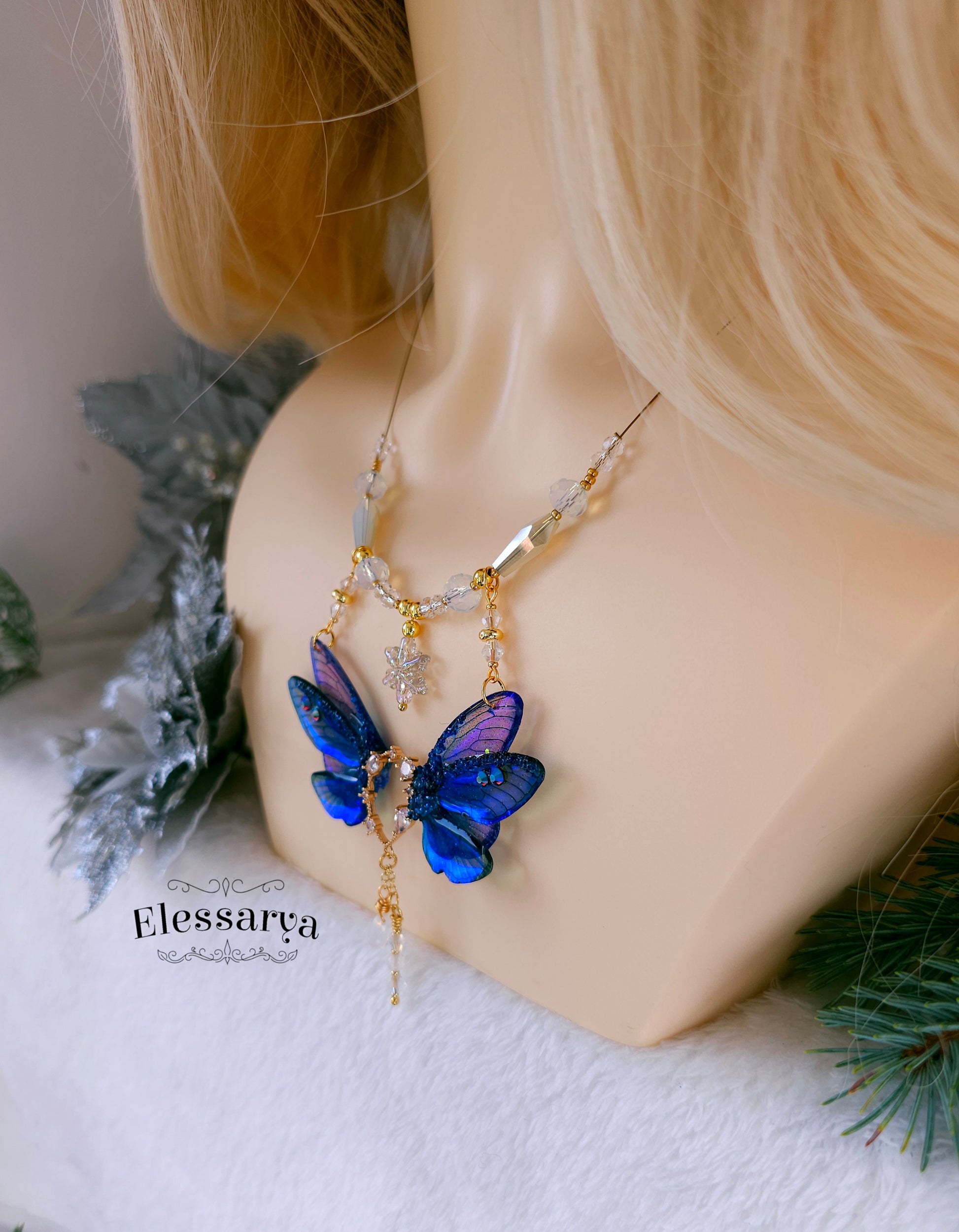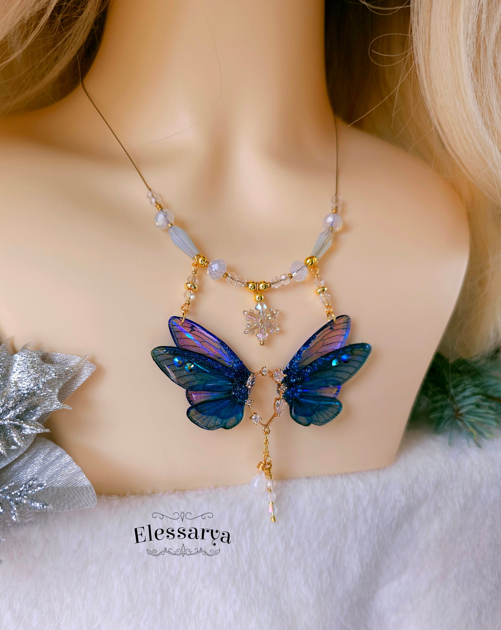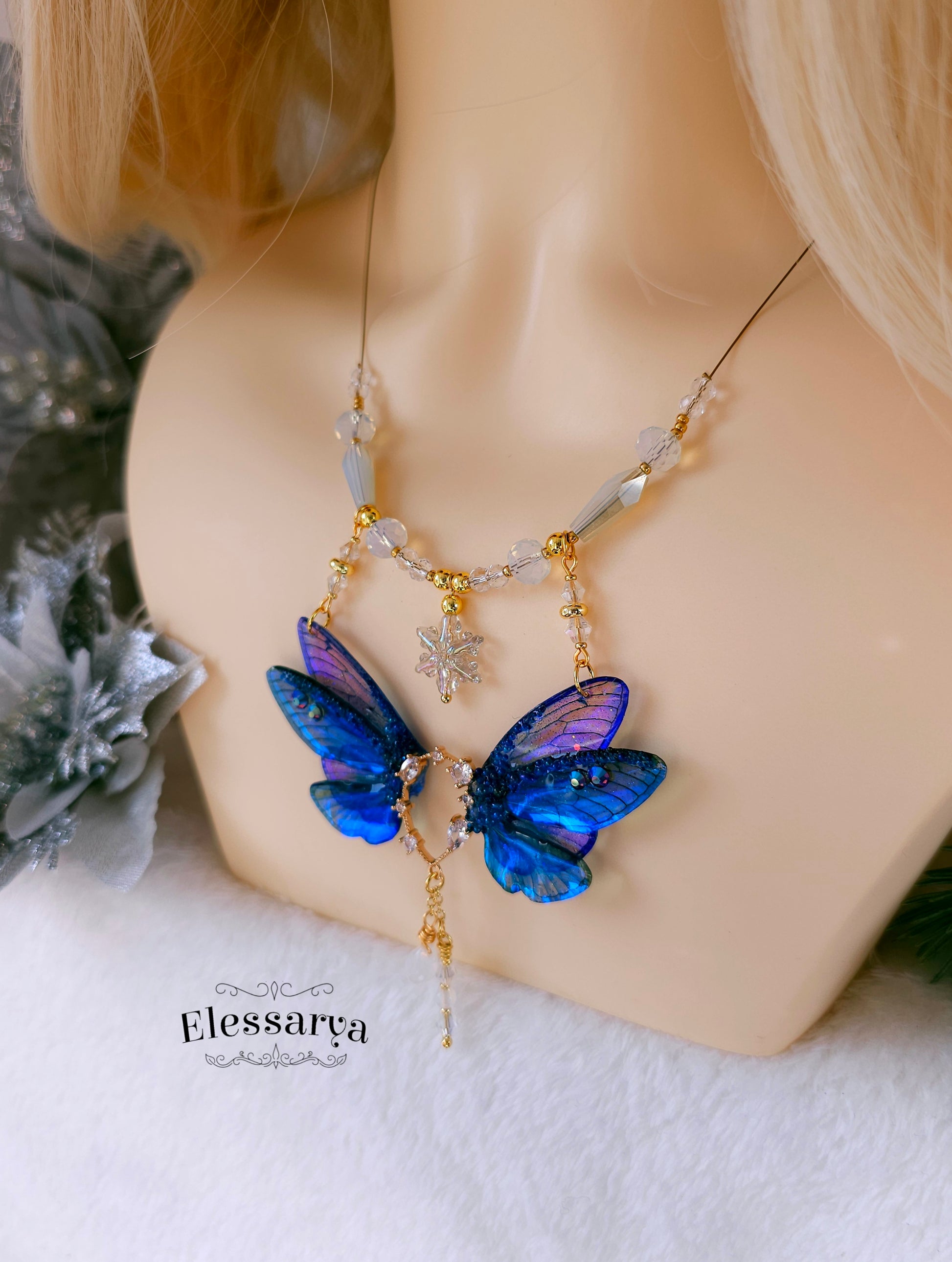 Un colier intens și regal, cu aripi de zână realizate din rășină non-toxică, în nuanțe de albastru închis, aproape Indigo. Culorile se schimbă în funcție de unghi și lumină, trecând de la albastru profund la reflexii luminoase care par să danseze pe suprafața aripilor. Detaliile sunt decorate cu mici pietricele tip rhinestone care adaugă strălucire fină.