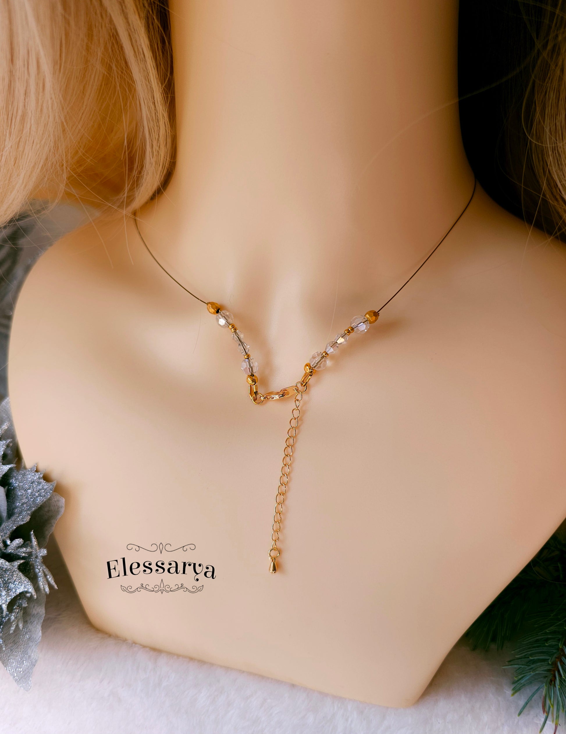 Mărgeluțele sunt un amestec de sticlă și elemente din alamă placată cu aur, toate înșirate pe un fir subțire, răsucit, din oțel inoxidabil auriu. Firul este suplu și rezistent, iar mărgelele sin sticlă din spate adaugă un detaliu frumos exact în zona închiderii.