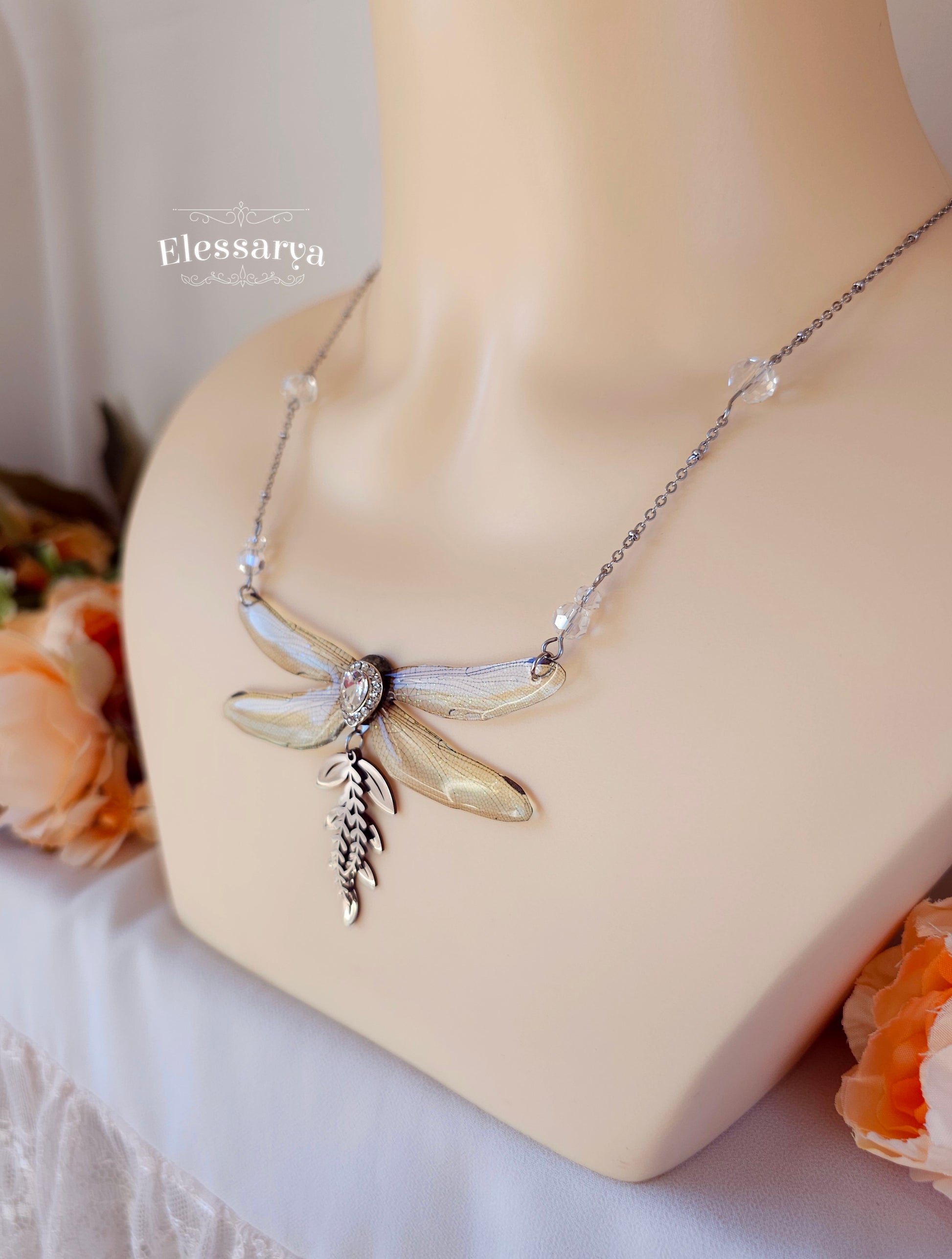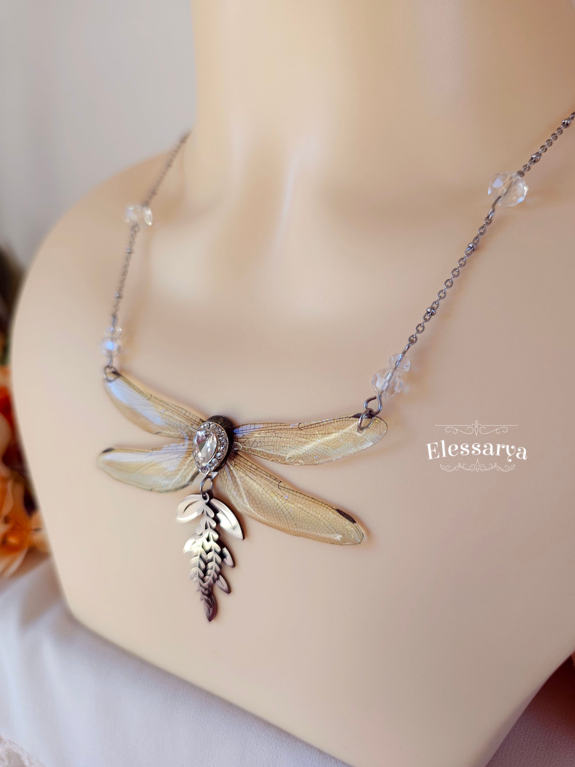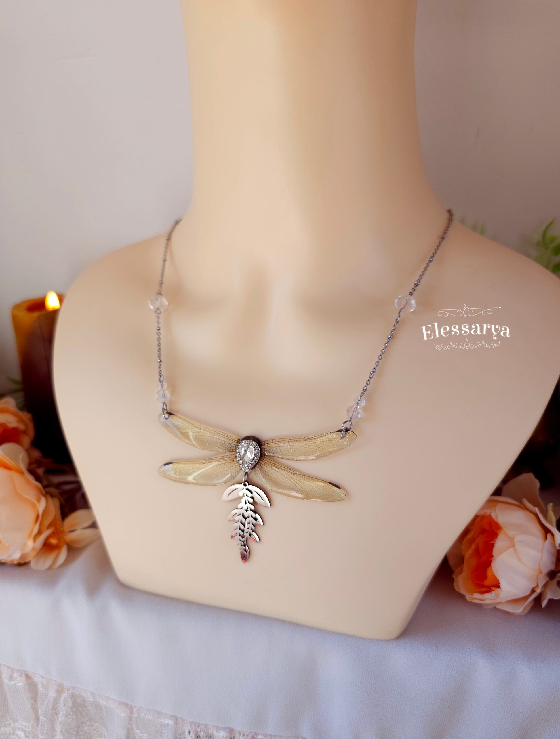 Colier delicat și rafinat, realizat din oțel inoxidabil hipoalergenic, cu un design inspirat din grația libelulelor și eleganța luminii naturale.