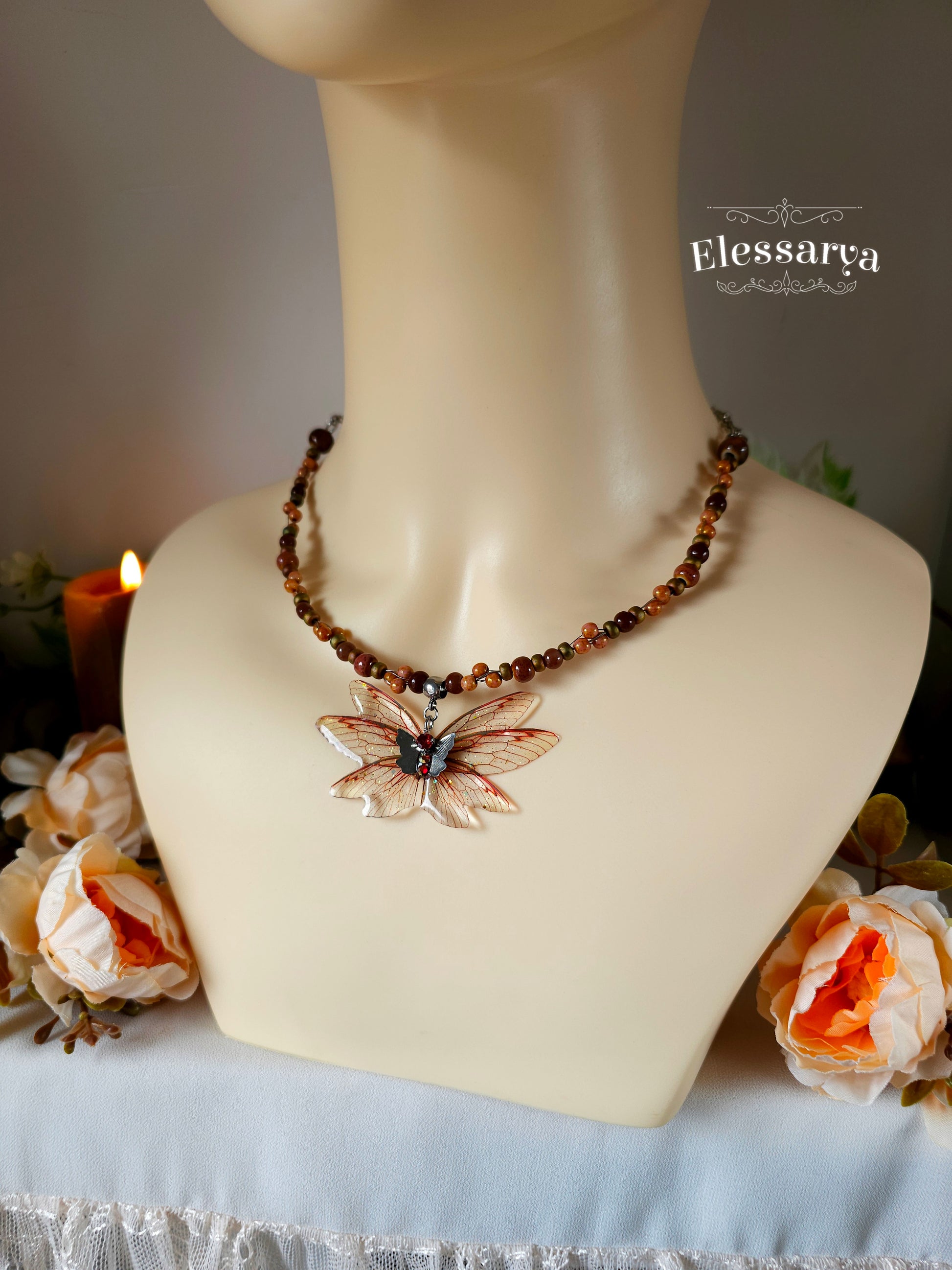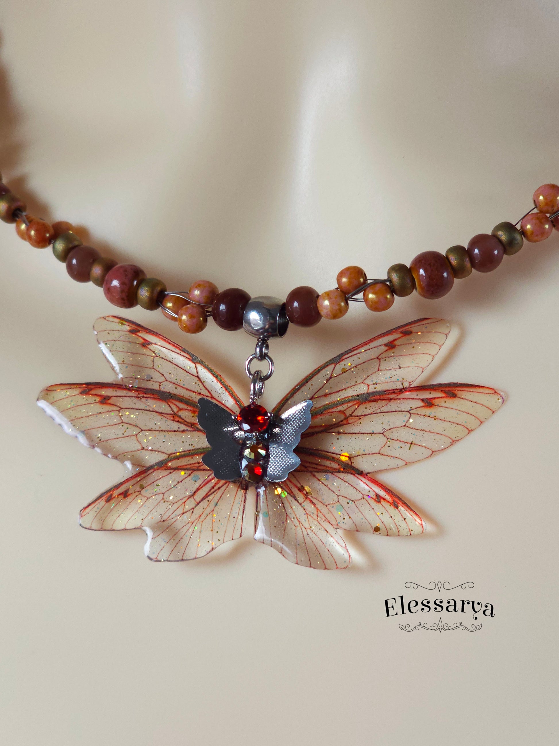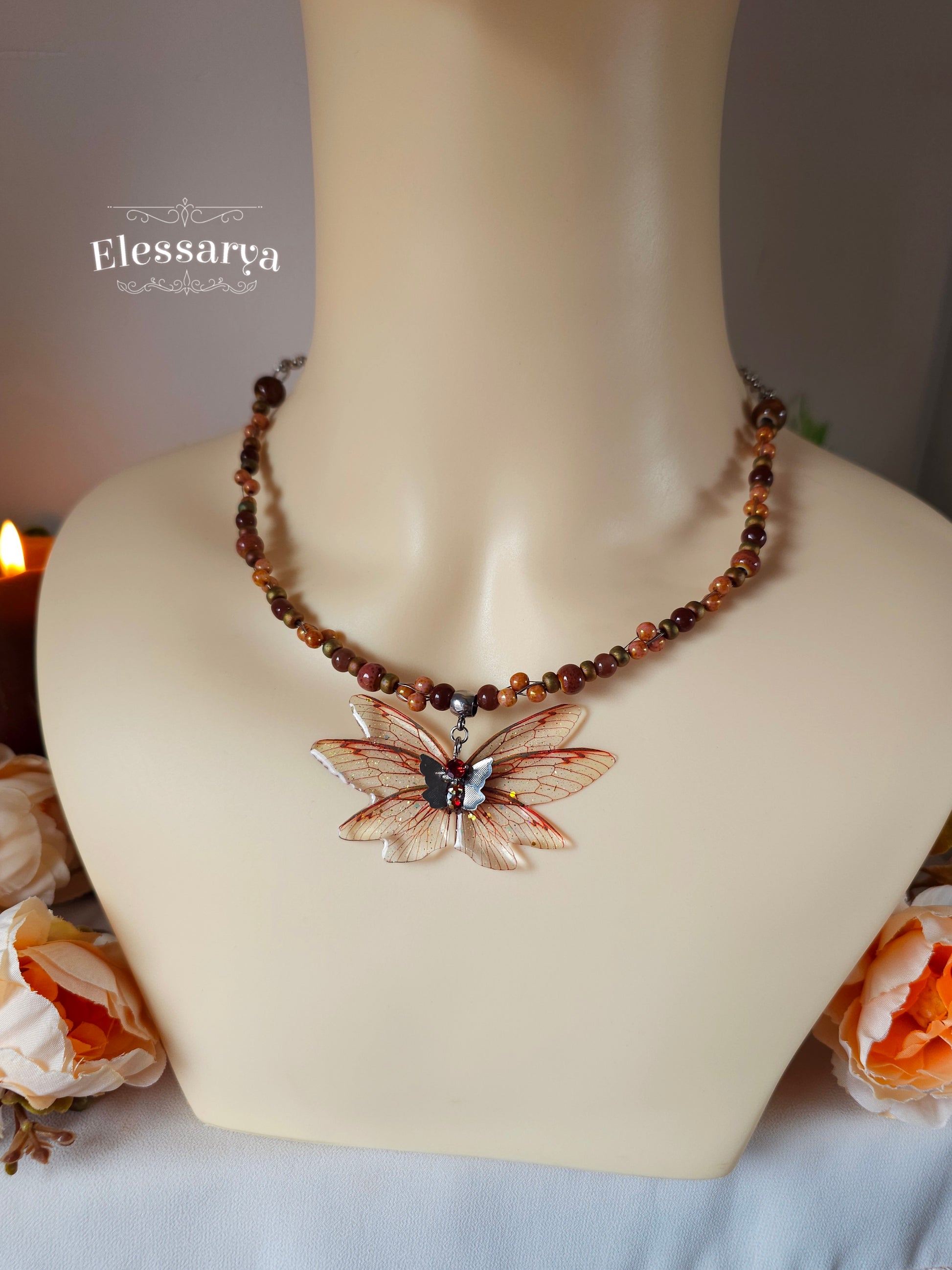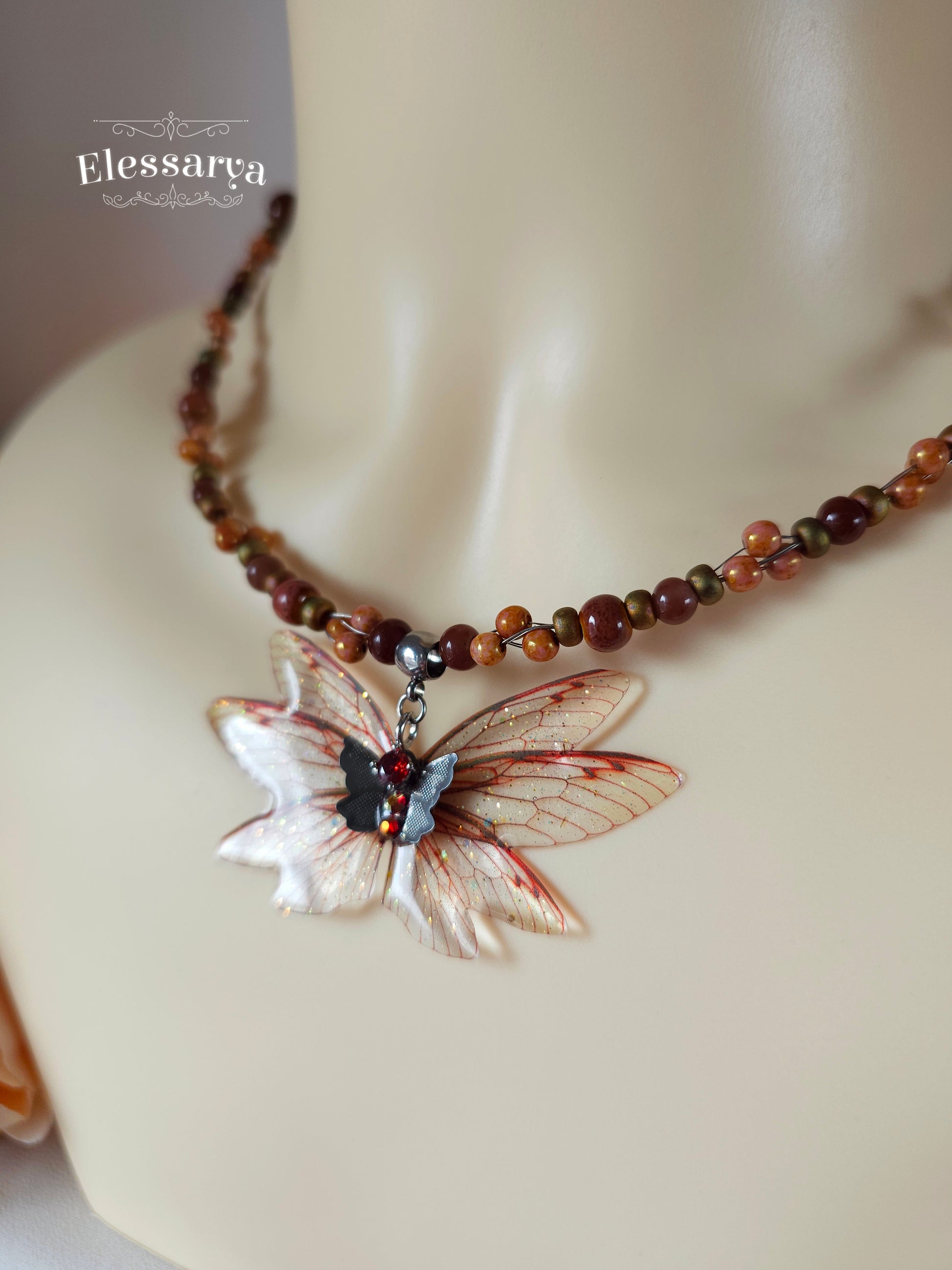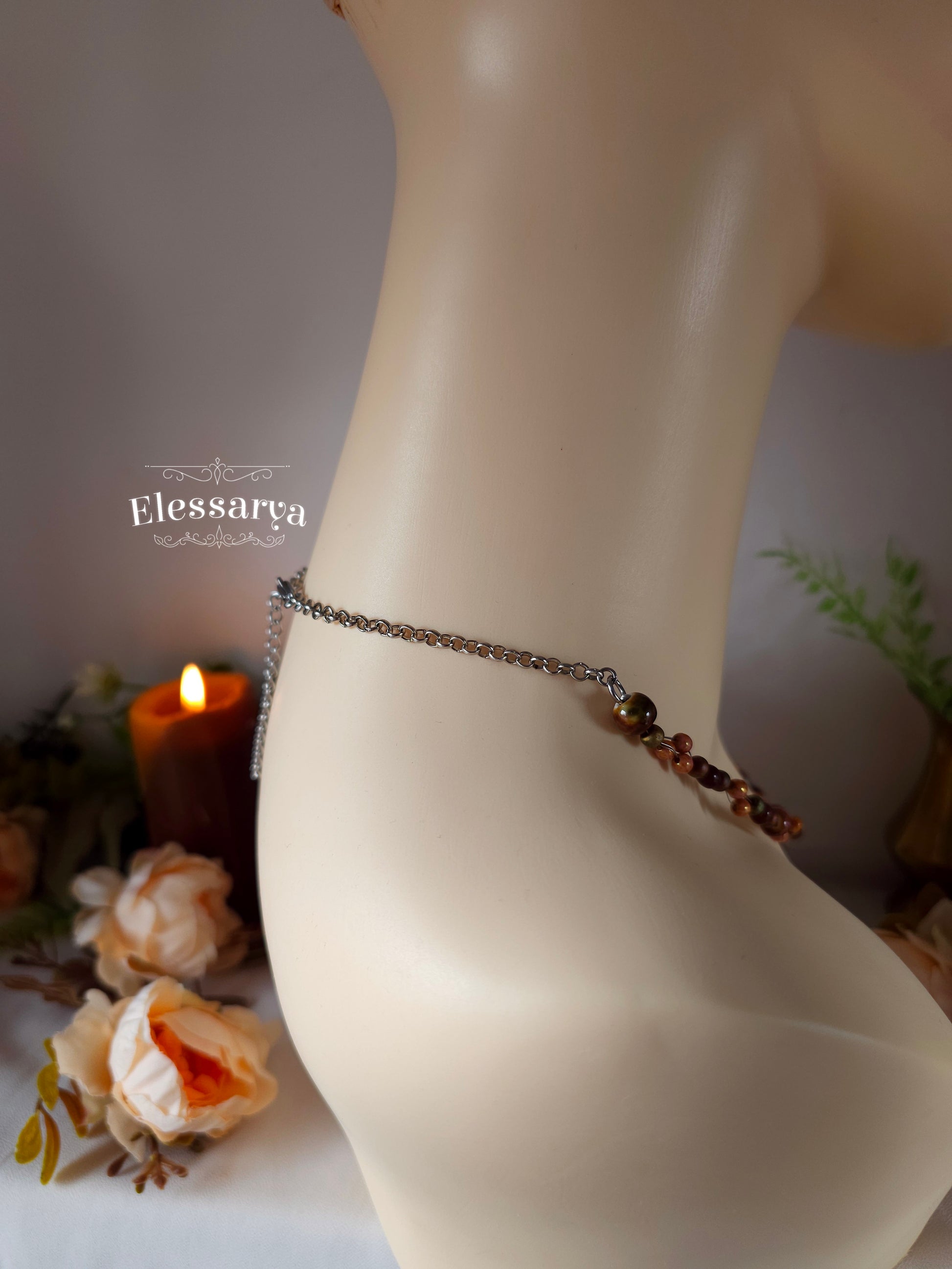 Colier realizat cu măiestrie în nuanțe calde de toamnă, îmbinând mărgele Fire Polish, Miyuki și mărgele ceramice, toate atent înșirate pe sârmă de oțel inoxidabil pentru un aspect elegant și durabil.