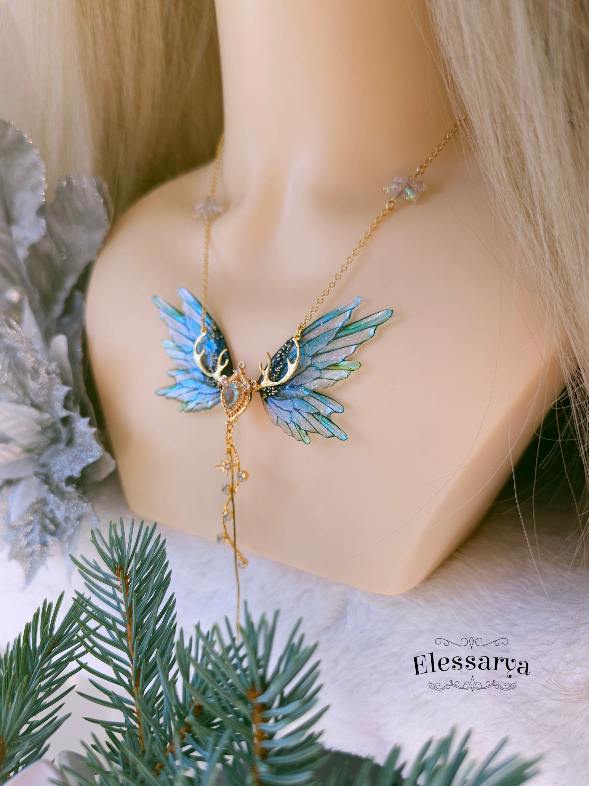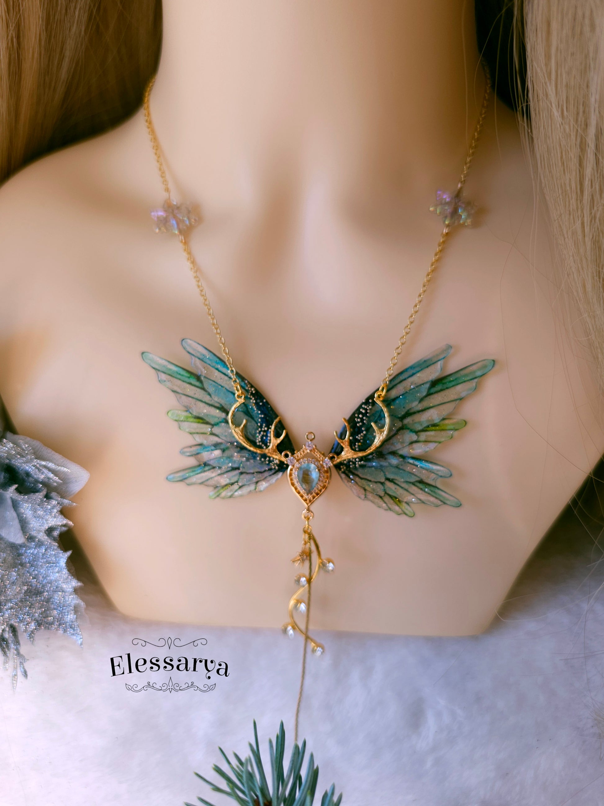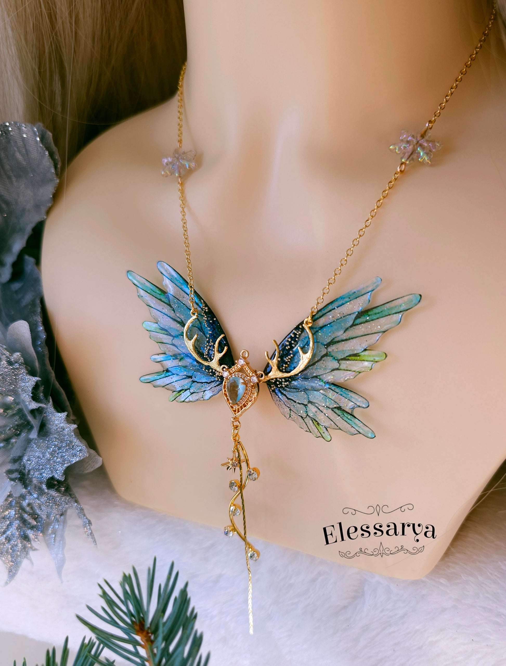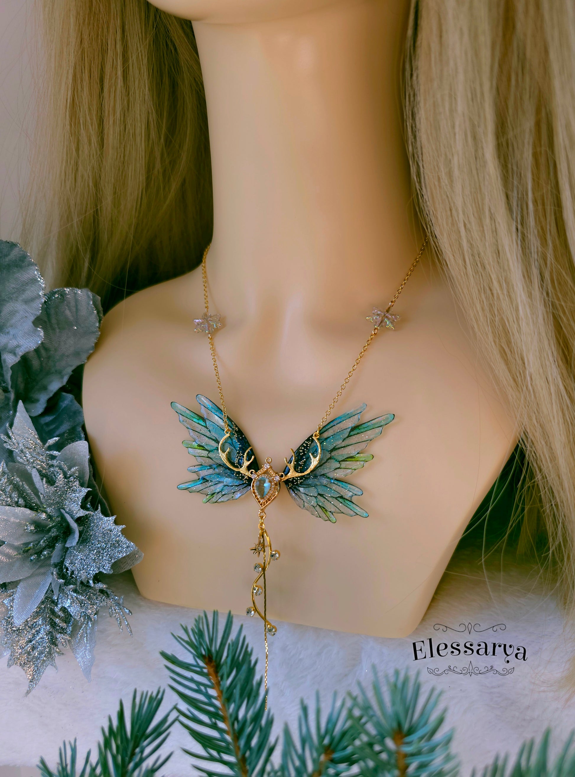 Colier cu aripi de zână, lucrate din rășină non-toxică, decorate cu fulgi iridiscenți care strălucesc superb în lumina soarelui. Aripile au nuanțe reci de albastru-verde, cu accente sclipitoare ca zăpada proaspătă.