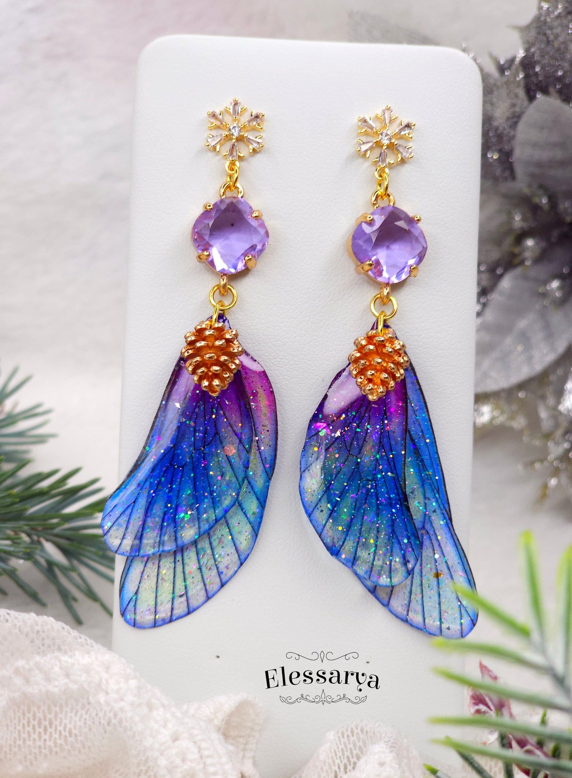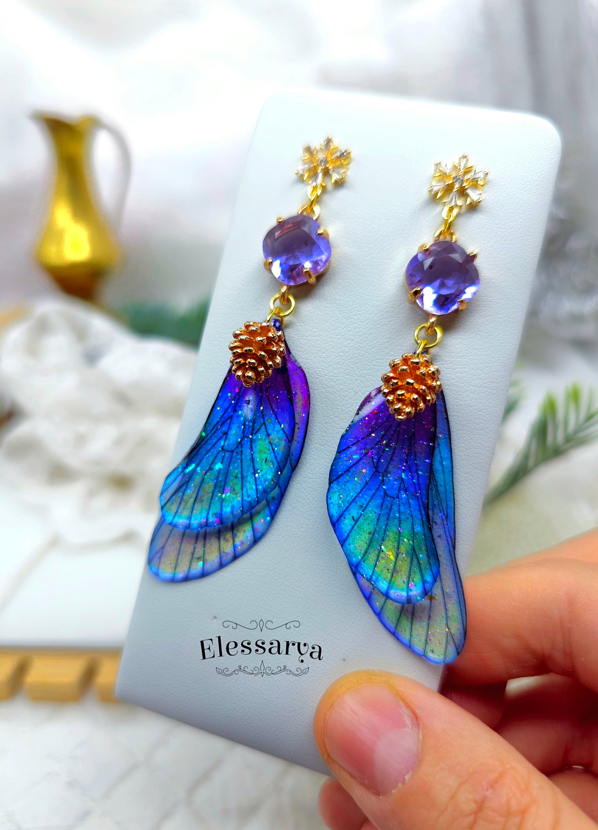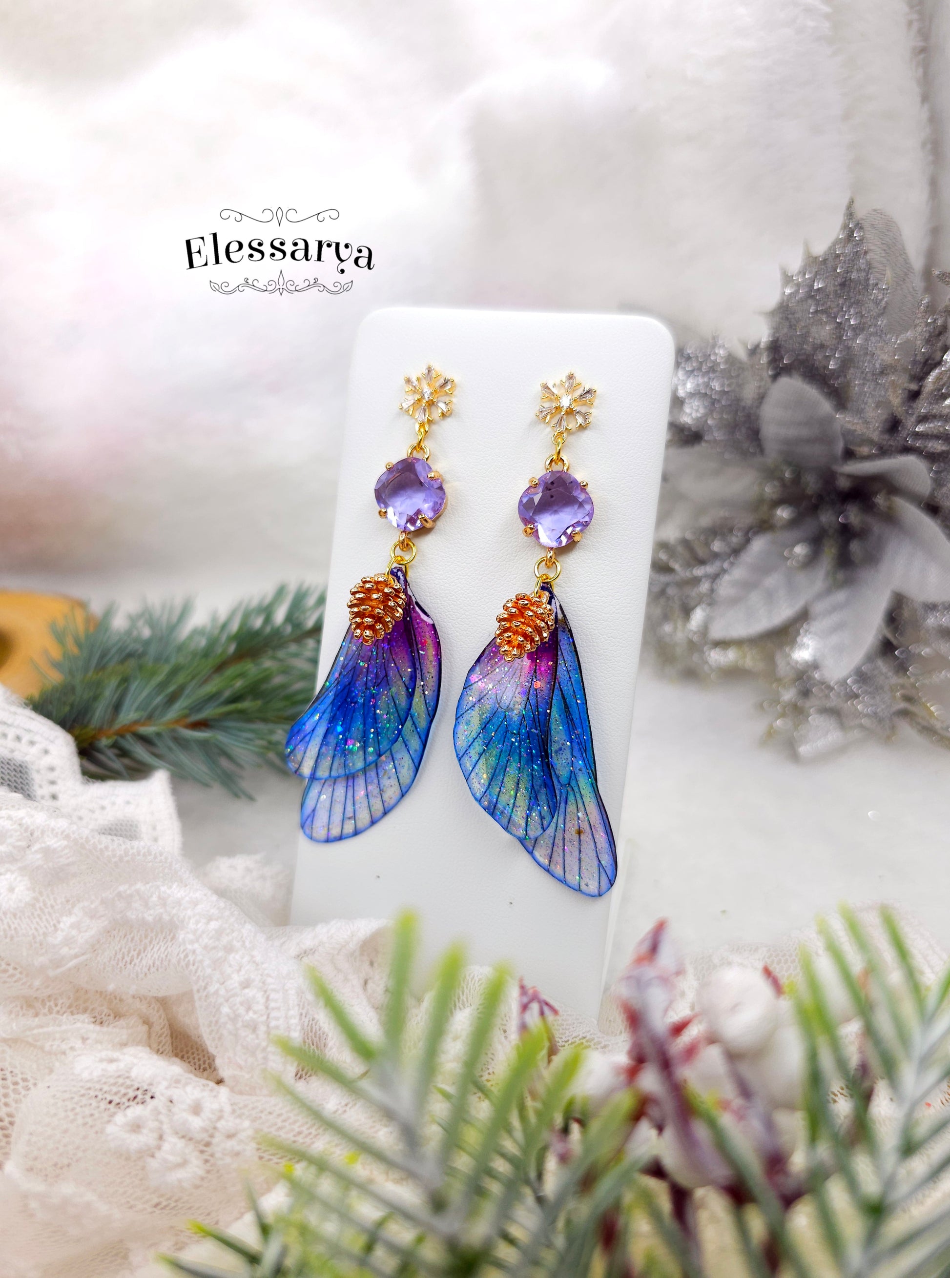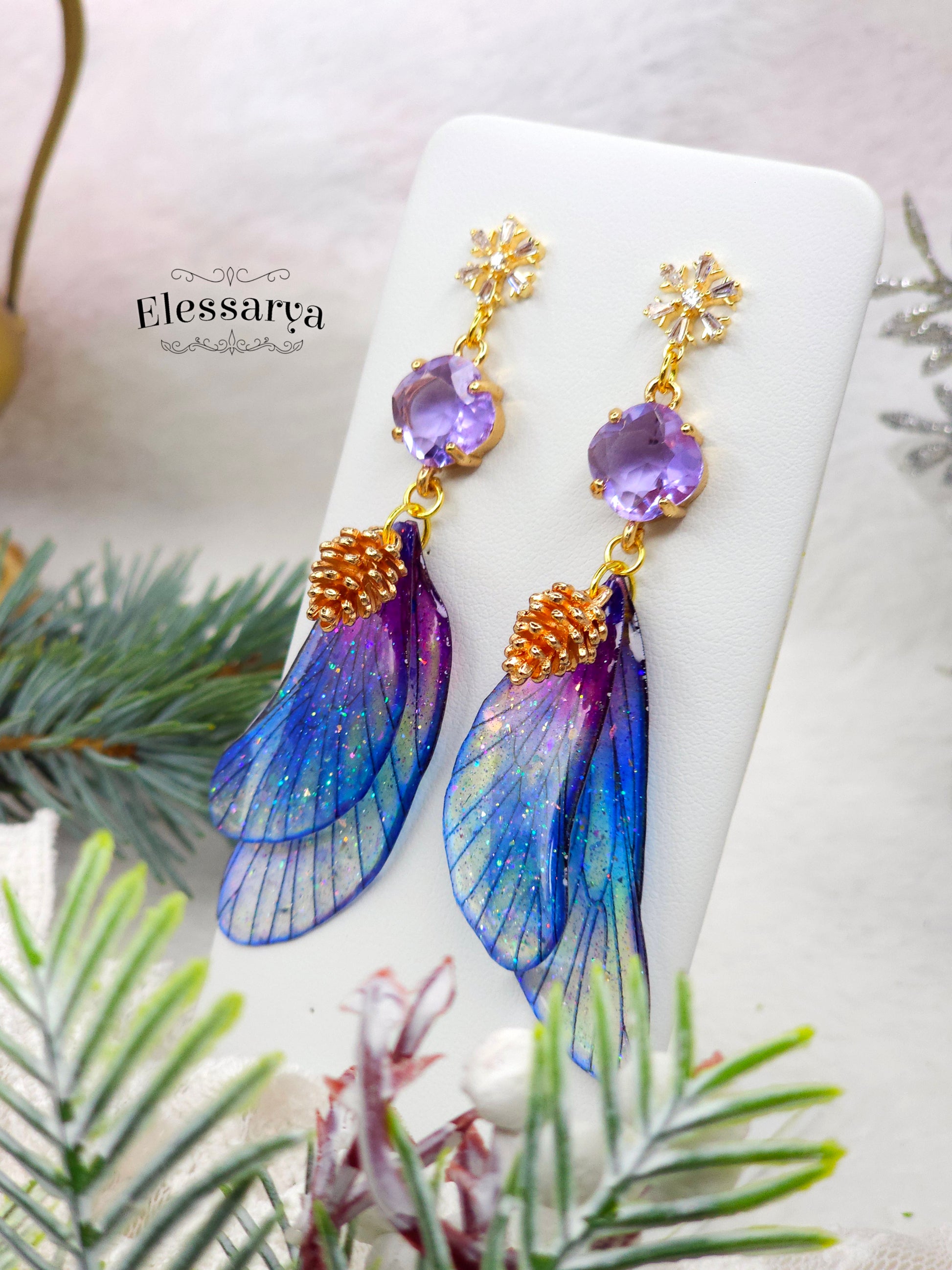O pereche de cercei spectaculoși, cu aripi de zână realizate din rășină non-toxică, în nuanțe intense de violet, albastru și turcoaz. Aripile au reflexii de curcubeu vizibile în lumină puternică, iar mici irizații AB strălucesc ca fulgii de zăpadă în miezul iernii.