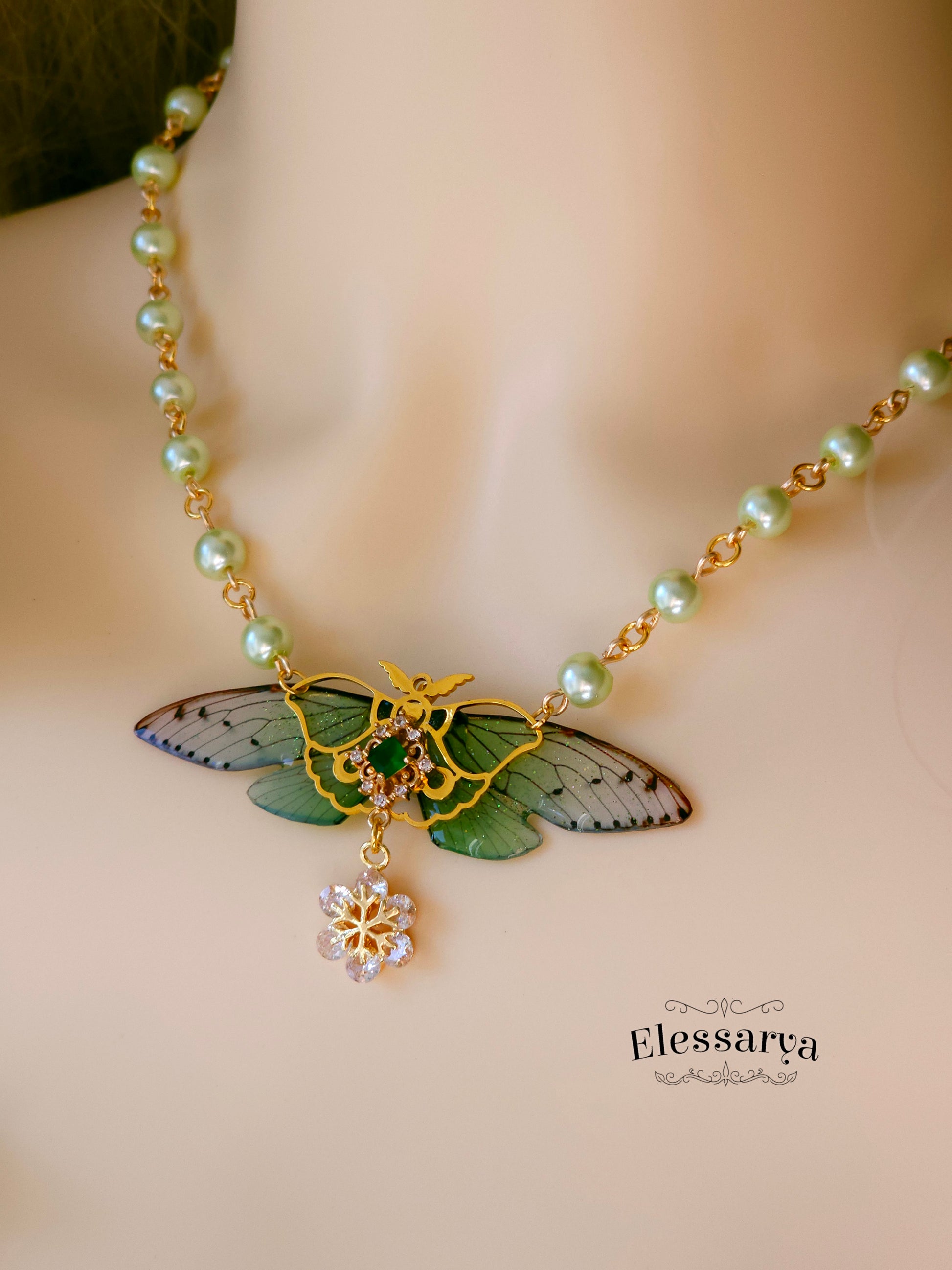 În centru se află un fluturaș rafinat, cu structura metalică din oțel inoxidabil placat cu aur, decorat cu zirconii mici, strălucitoare. Aripile fluturelui sunt realizate din rășină non-toxică, translucide, cu reflexii discrete verzi, delicate ca o aripă adevărată prinsă în lumina dimineții.