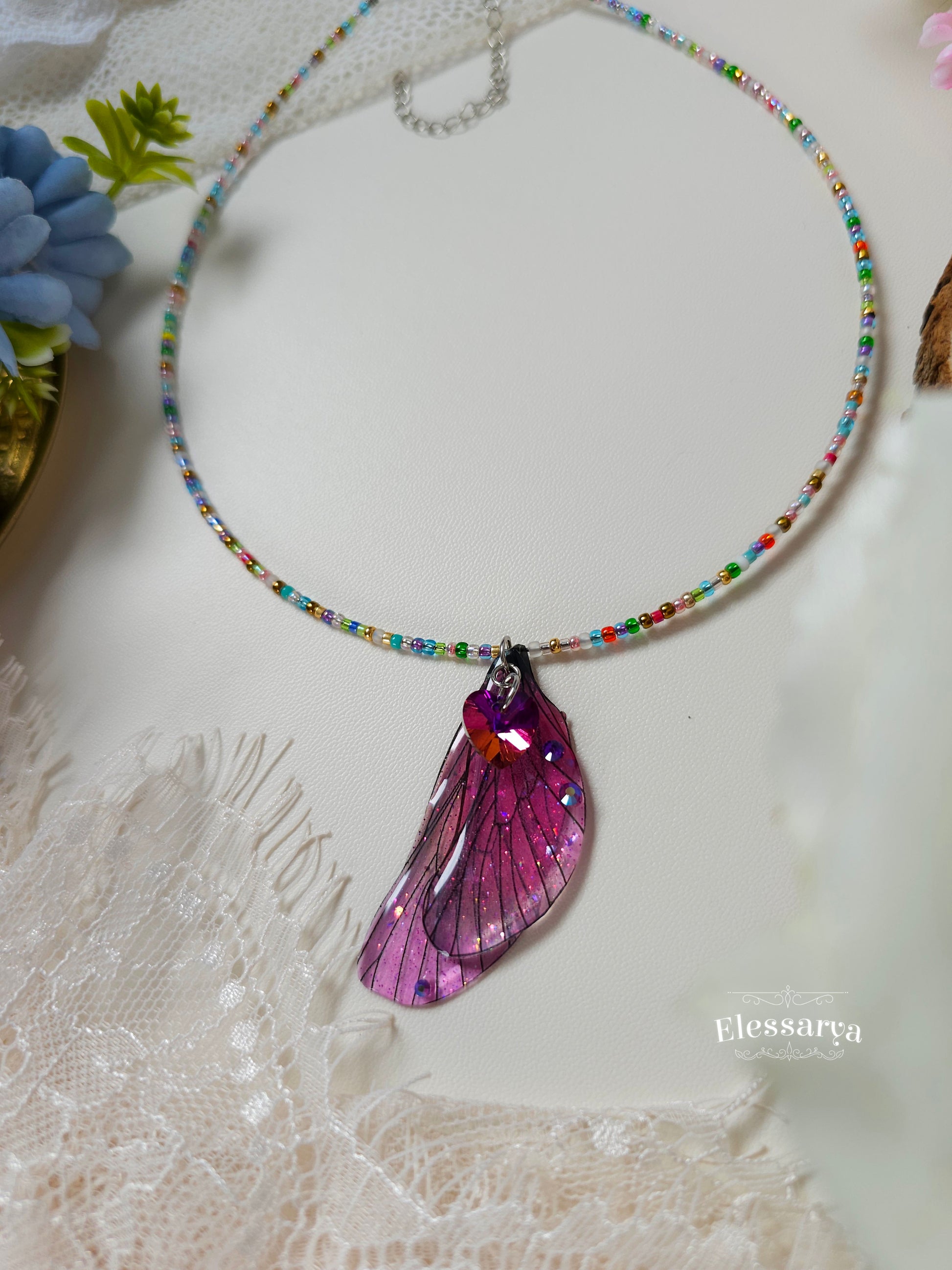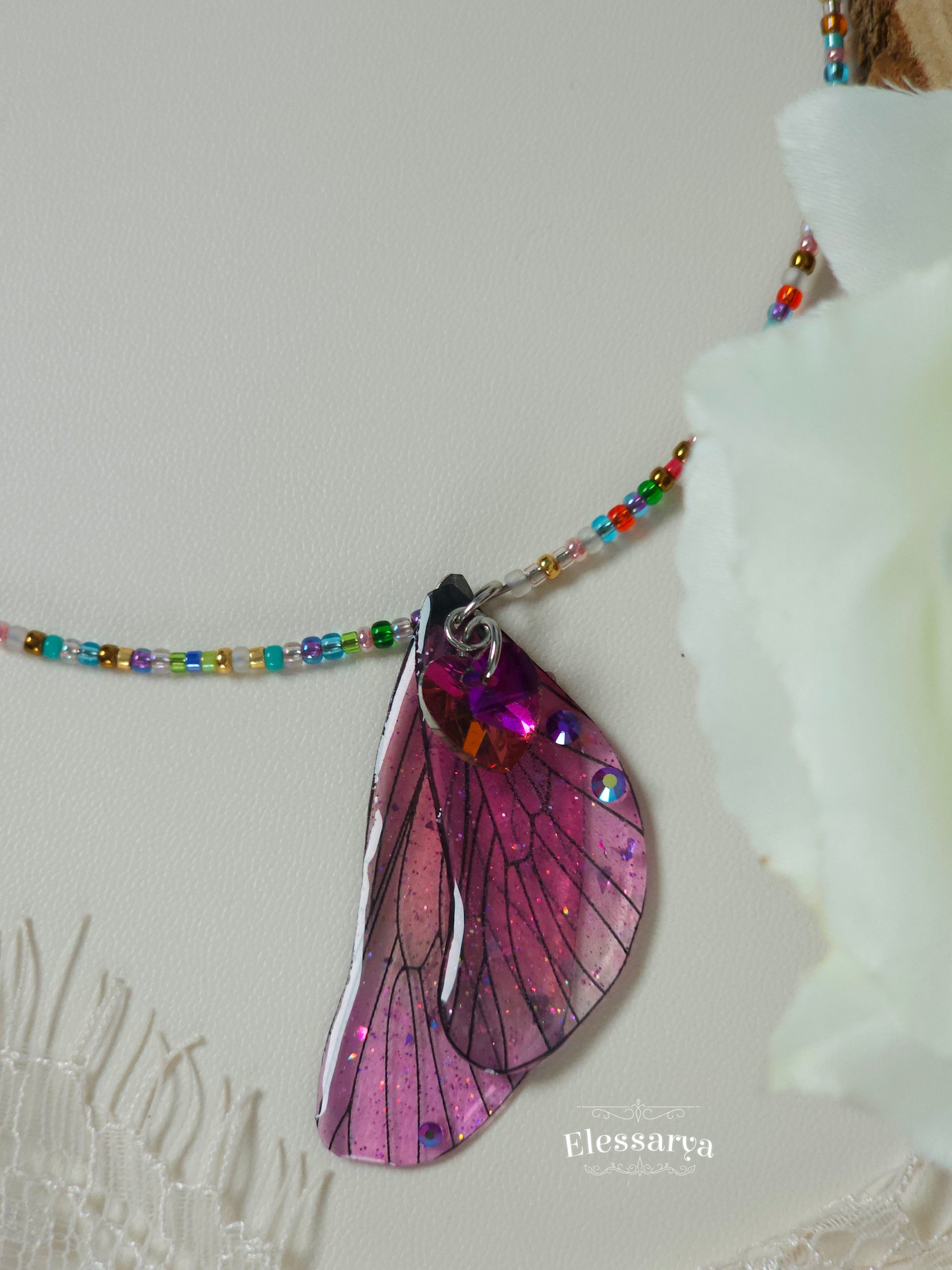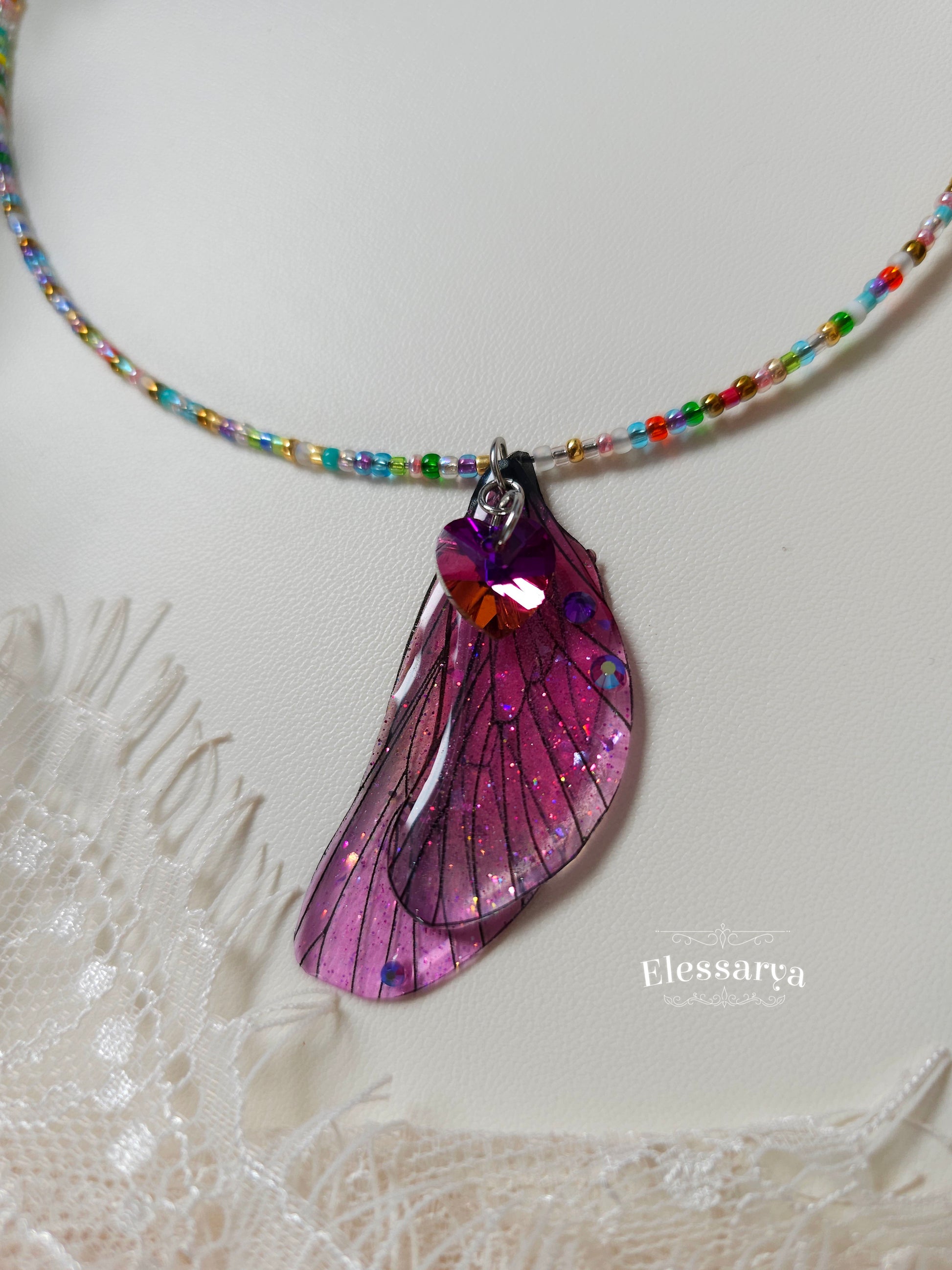 Pandantivul cu aripi roz intens, realizate din rășină non-toxică, este punctul central al colierului. Transparența lor vibrantă captează lumina, iar inimioara din sticlă roz, cu reflexii fine, se mișcă ușor odată cu aripile, adăugând un detaliu jucăuș și feminin. Este o piesă care nu vorbește despre promisiuni tăcute, ci despre dragostea trăită cu zâmbet și culoare.