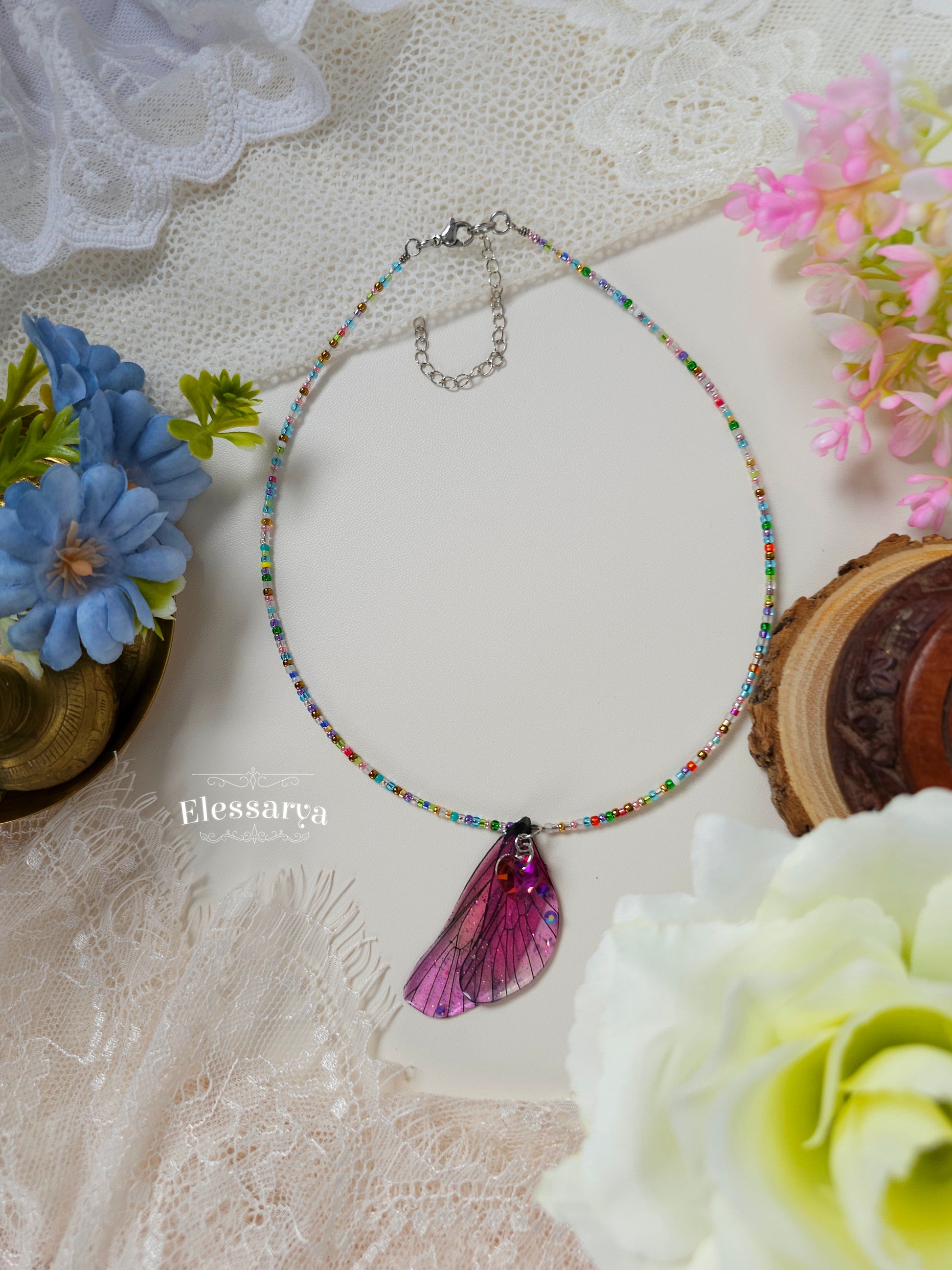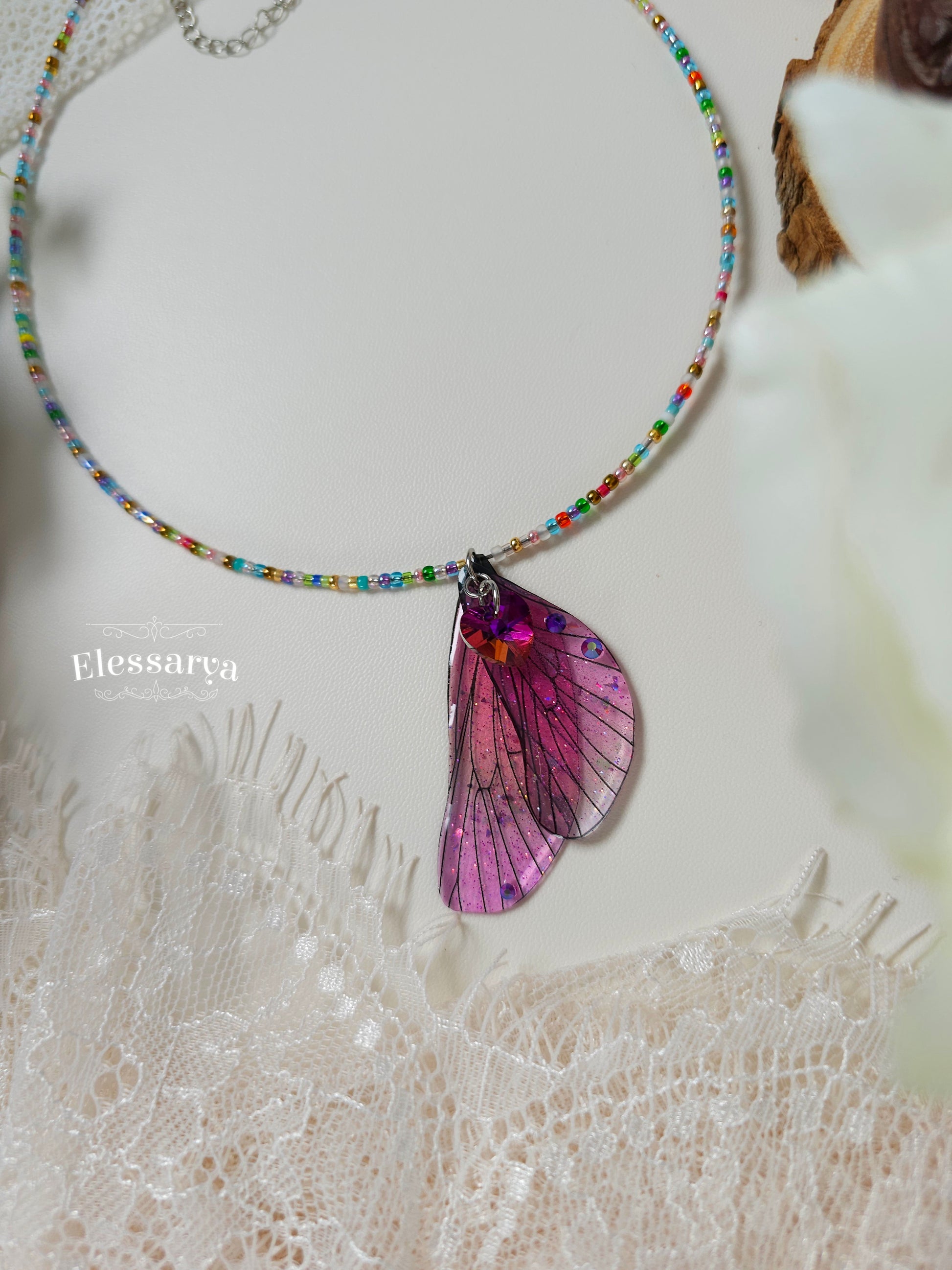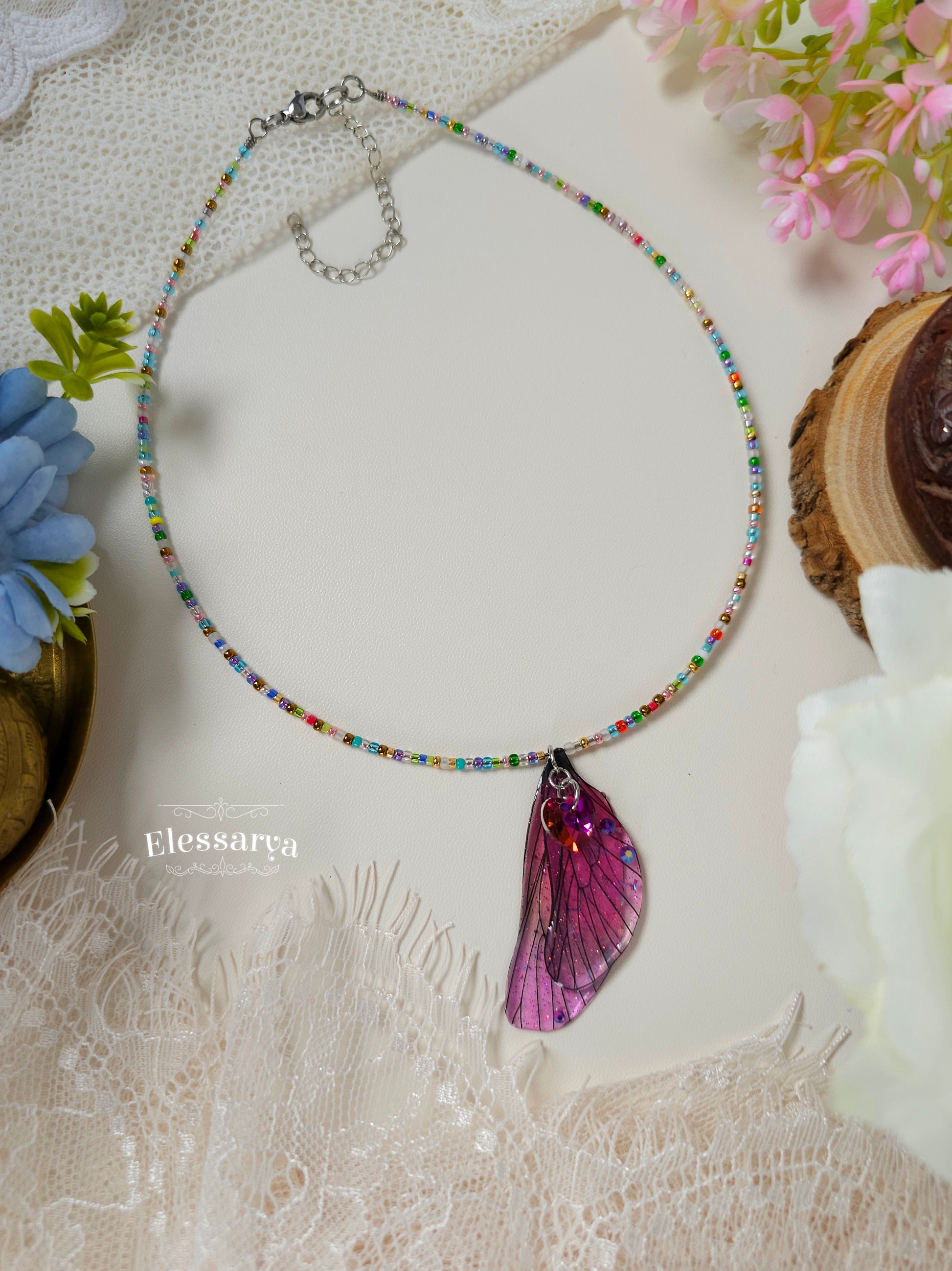 Pandantivul cu aripi roz intens, realizate din rășină non-toxică, este punctul central al colierului. Transparența lor vibrantă captează lumina, iar inimioara din sticlă roz, cu reflexii fine, se mișcă ușor odată cu aripile, adăugând un detaliu jucăuș și feminin. Este o piesă care nu vorbește despre promisiuni tăcute, ci despre dragostea trăită cu zâmbet și culoare.