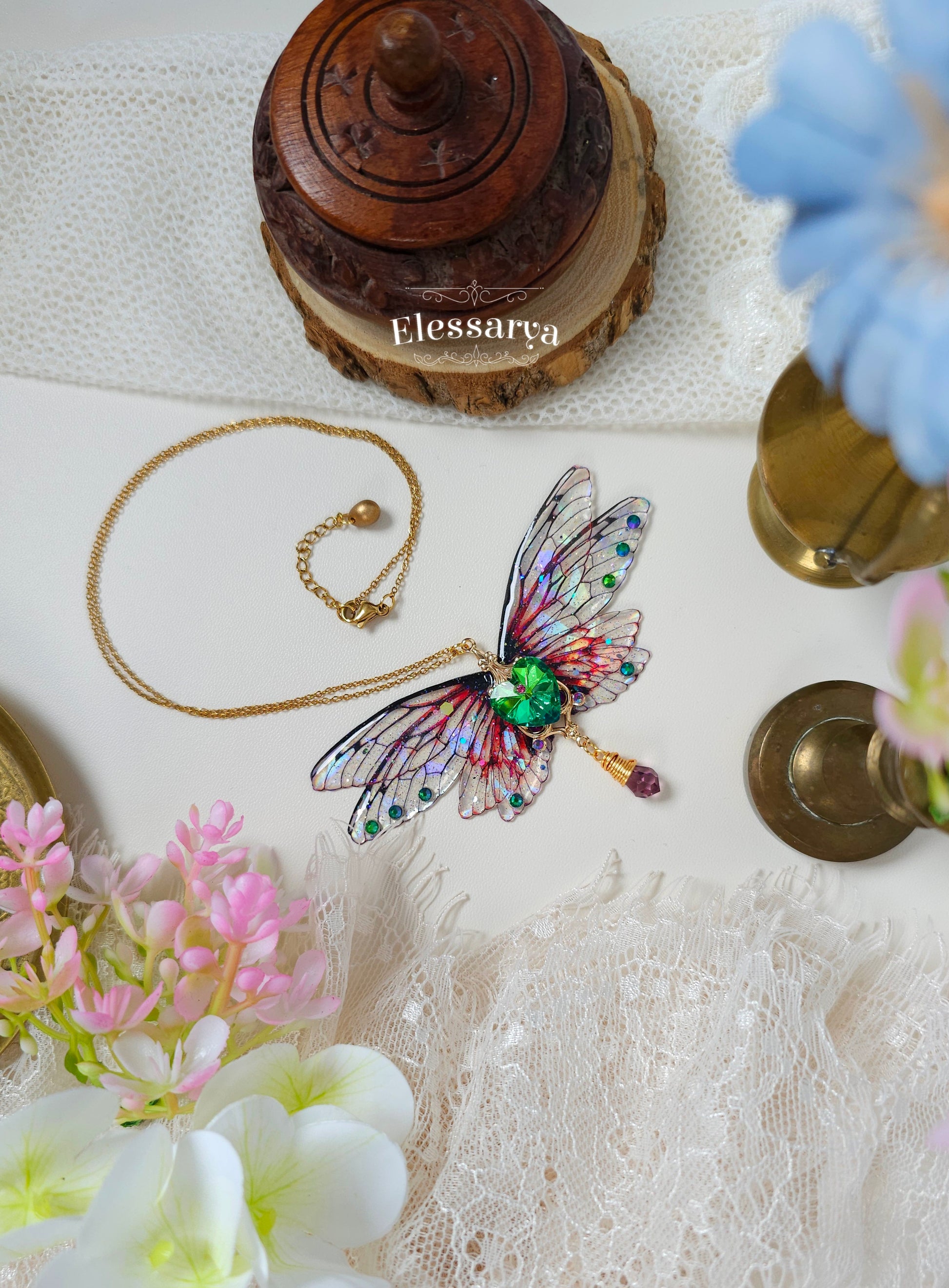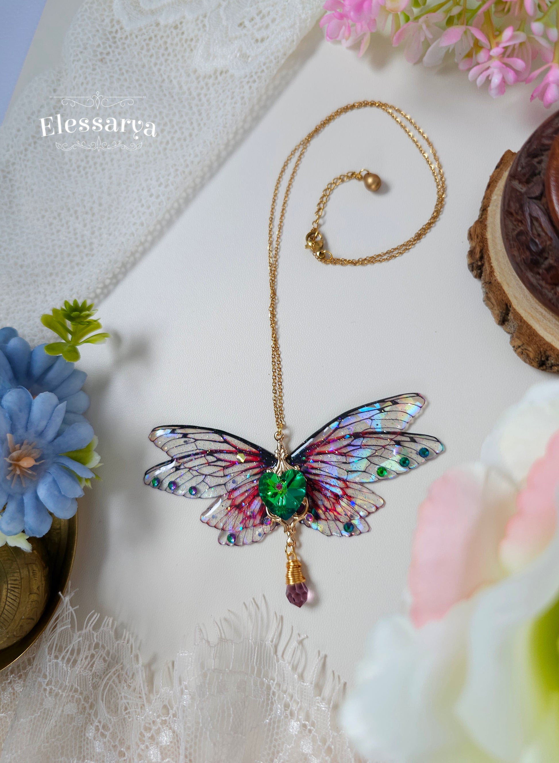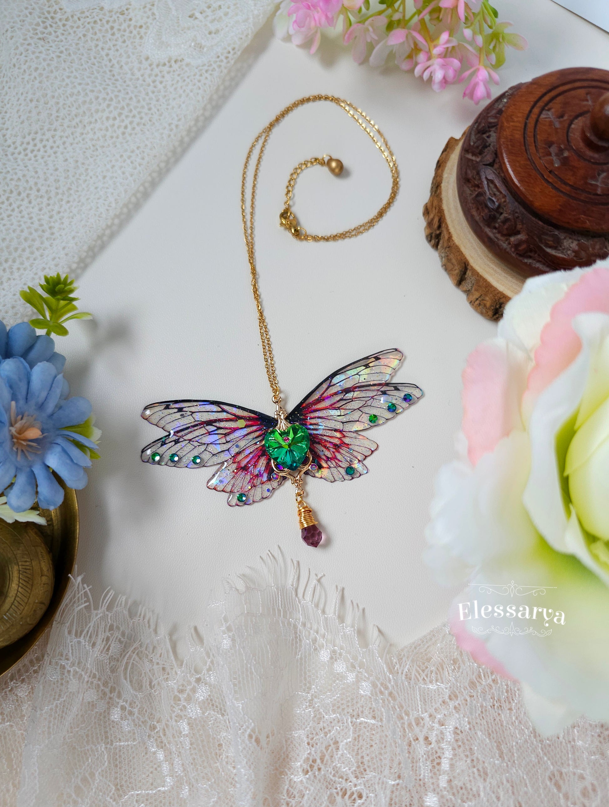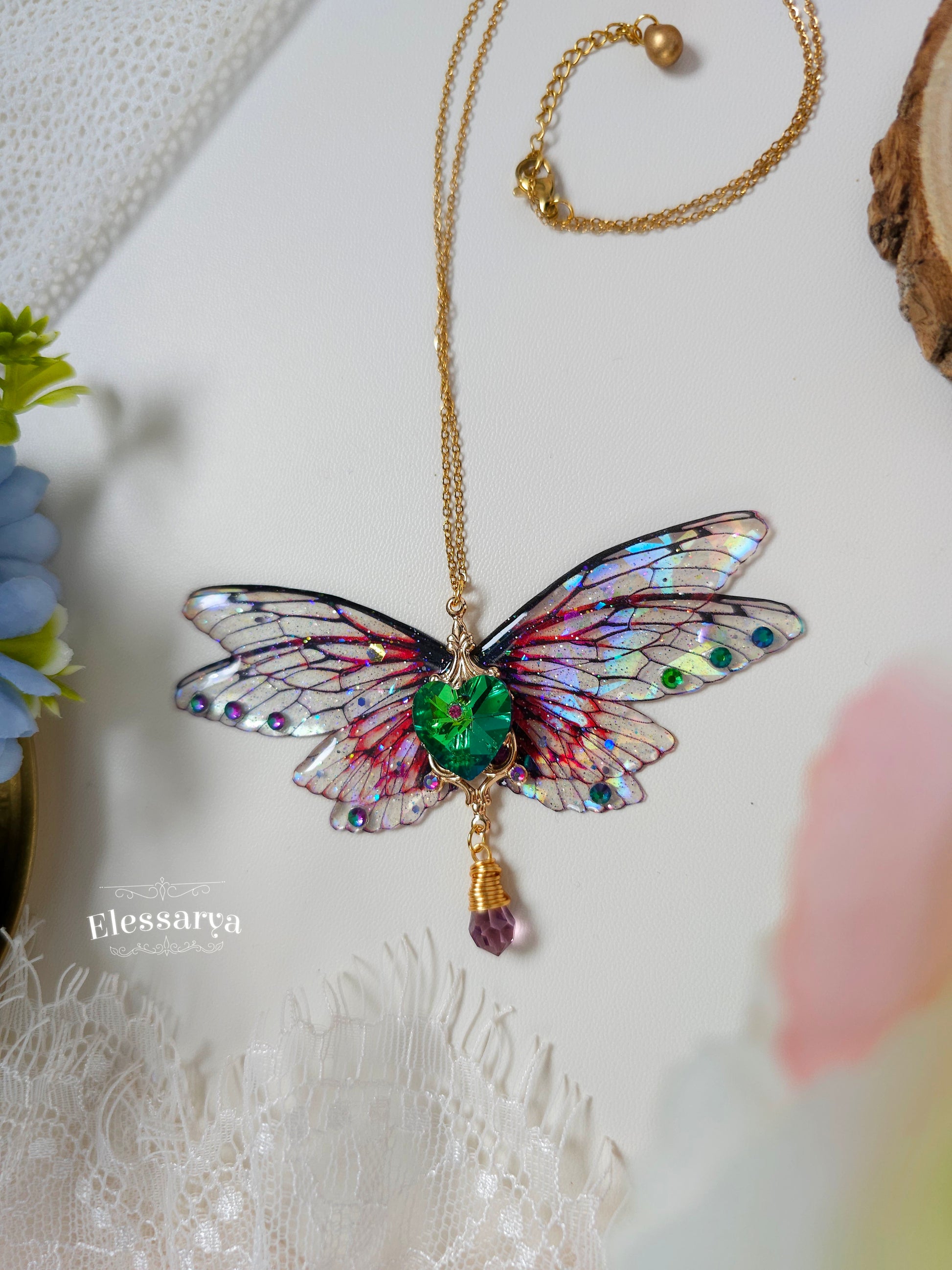 Acest colier statement este o piesă spectaculoasă, creată pentru a spune o poveste despre iubire, transformare și magie. Aripile larg deschise, cu reflexii de curcubeu și efect de broken glass, captează lumina din orice unghi, oferind un joc vibrant de culori și străluciri.
