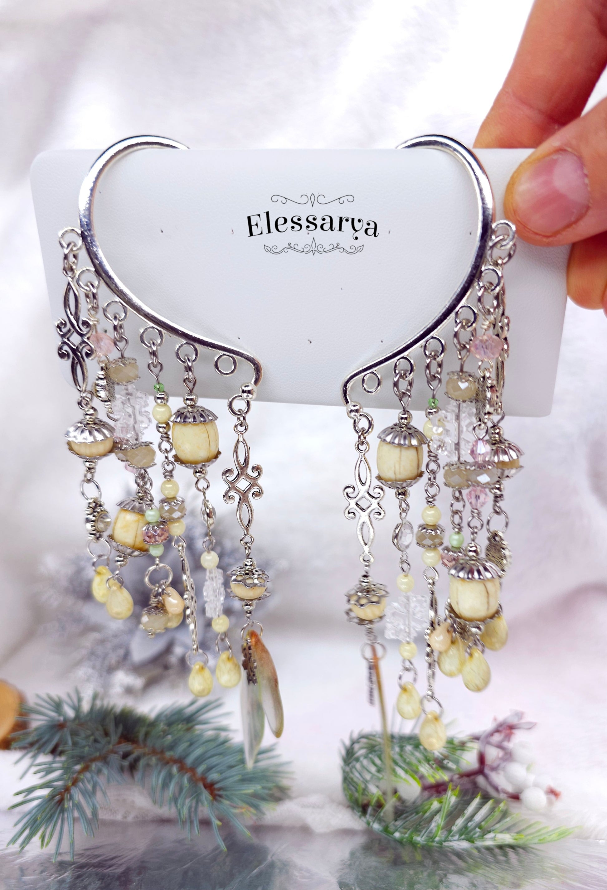 O pereche de earcuff-uri spectaculoase, create pentru cele care vor să pară desprinse direct dintr-un basm de iarnă. Structura este realizată dintr-un aliaj de calitate, cu aspect de argint tibetan, combinat cu elemente din oțel inoxidabil pentru rezistență și strălucire de durată. Designul este bogat, plin de detalii, exact ca podoabele purtate de o regină a zăpezilor.