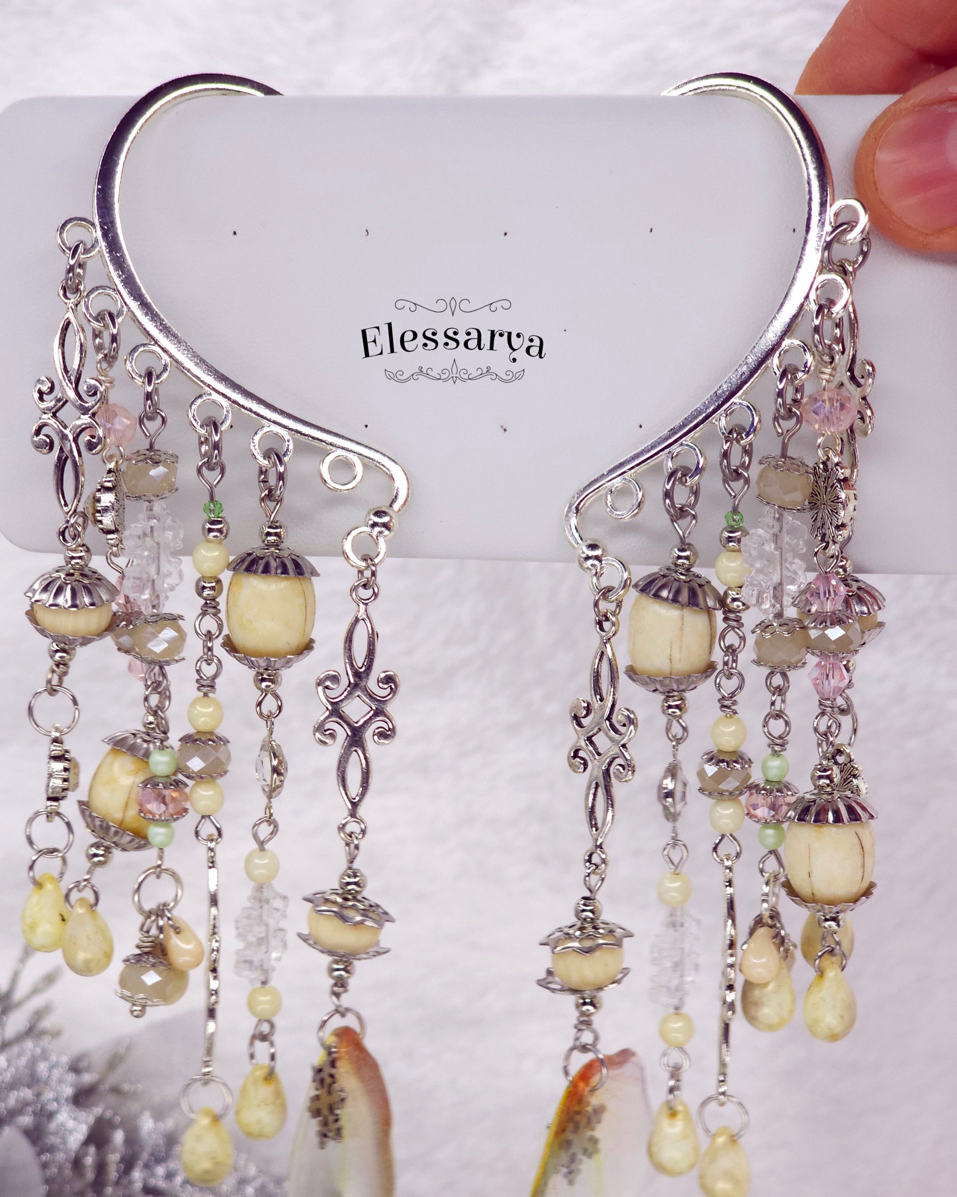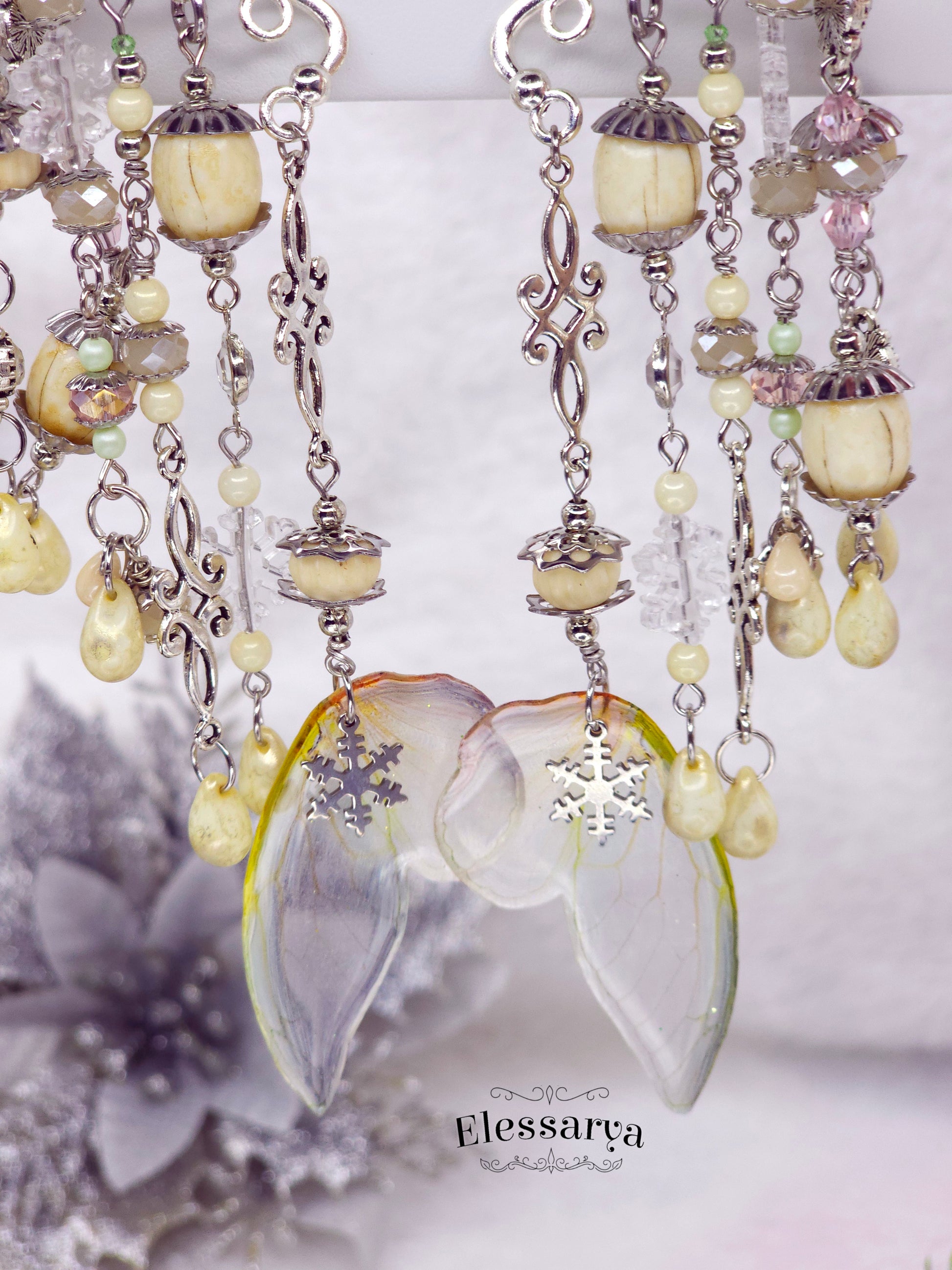 Lanțurile lungi sunt decorate cu un mix de mărgele: sticlă de Cehia, sticlă obișnuită cu reflexii fine, picături de acril ultra-ușoare și elemente translucide care prind lumina ca niște mici bucăți de gheață. Totul este gândit să se miște spectaculos, ca niște clopoței magici care se leagănă în vântul rece.