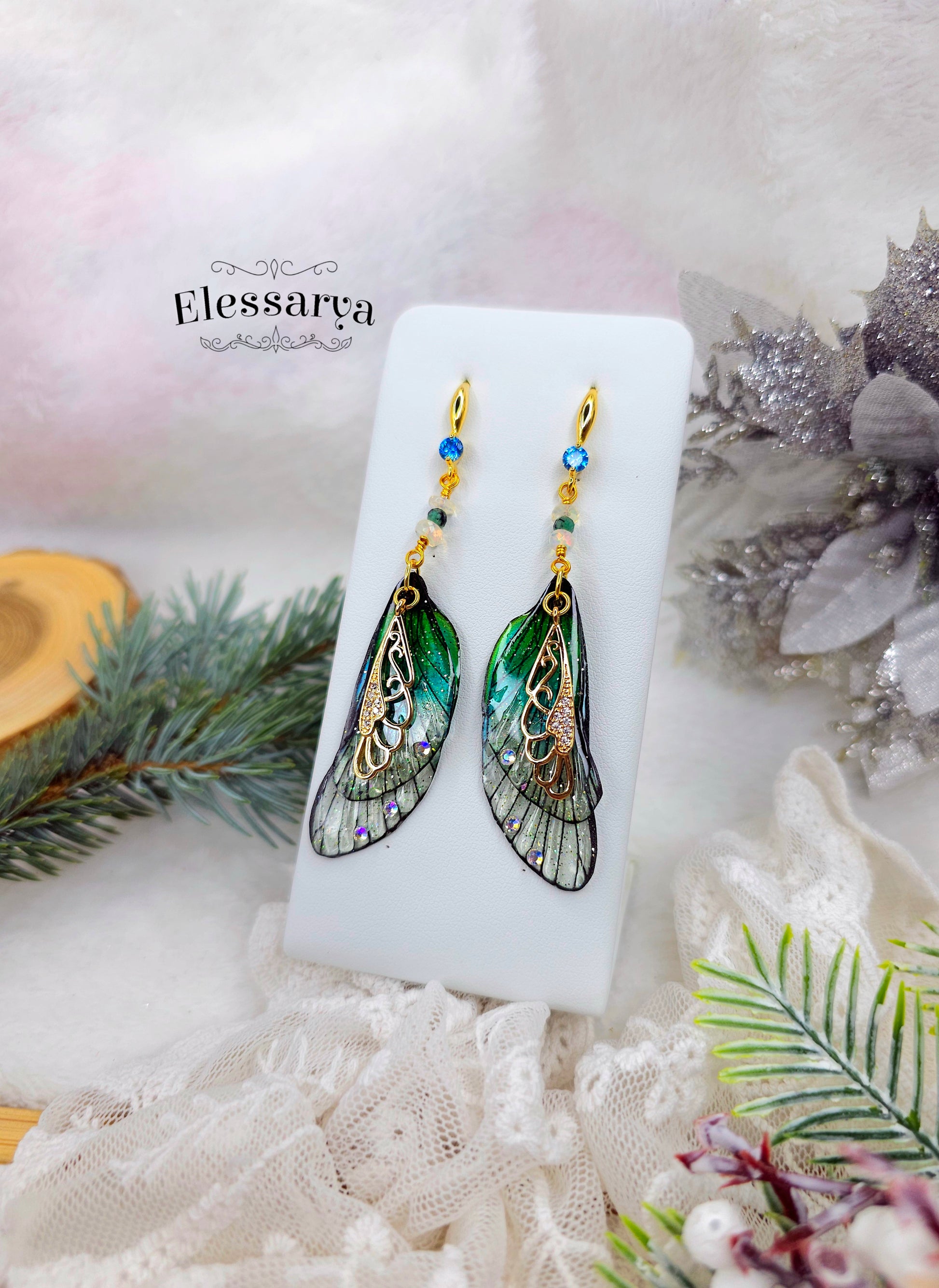 O pereche de cercei eleganți, lucrați cu atenție la fiecare detaliu. Toate piesele metalice sunt placate cu aur, iar între tortițe și aripi ai mărgeluțe din opal natural și rubin zoisit, care aduc contraste fine de albastru și verde.
