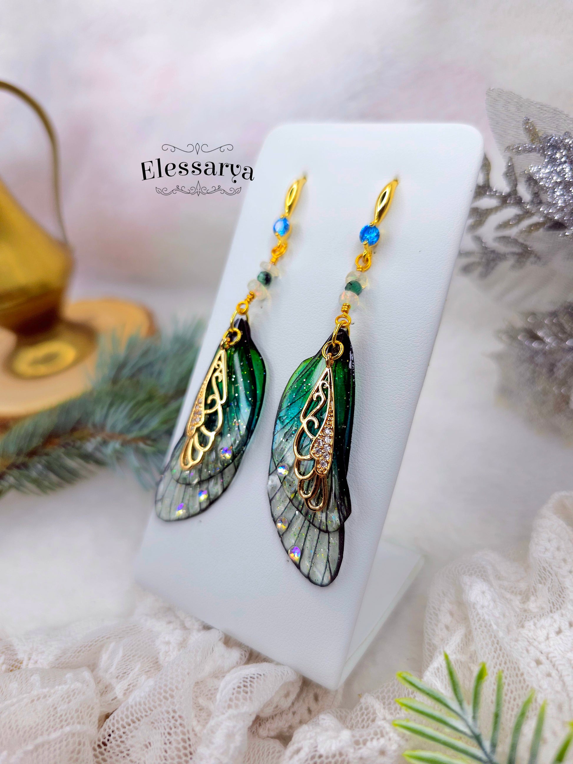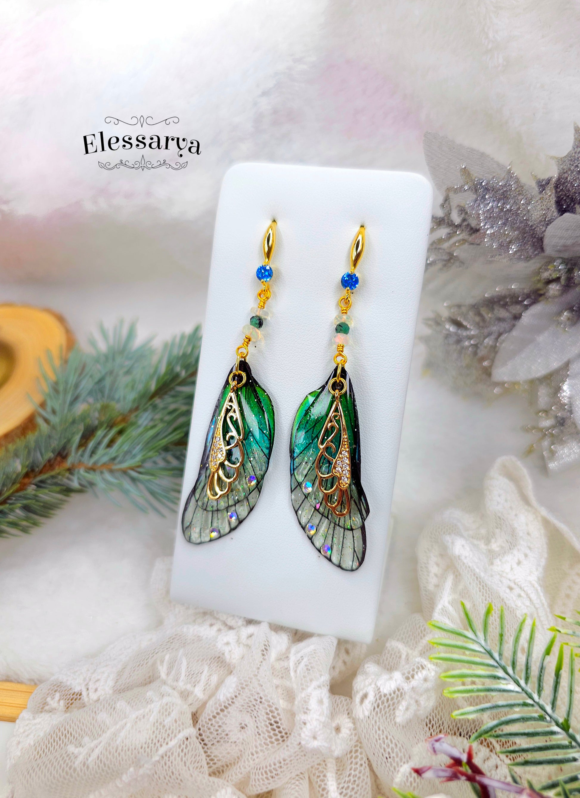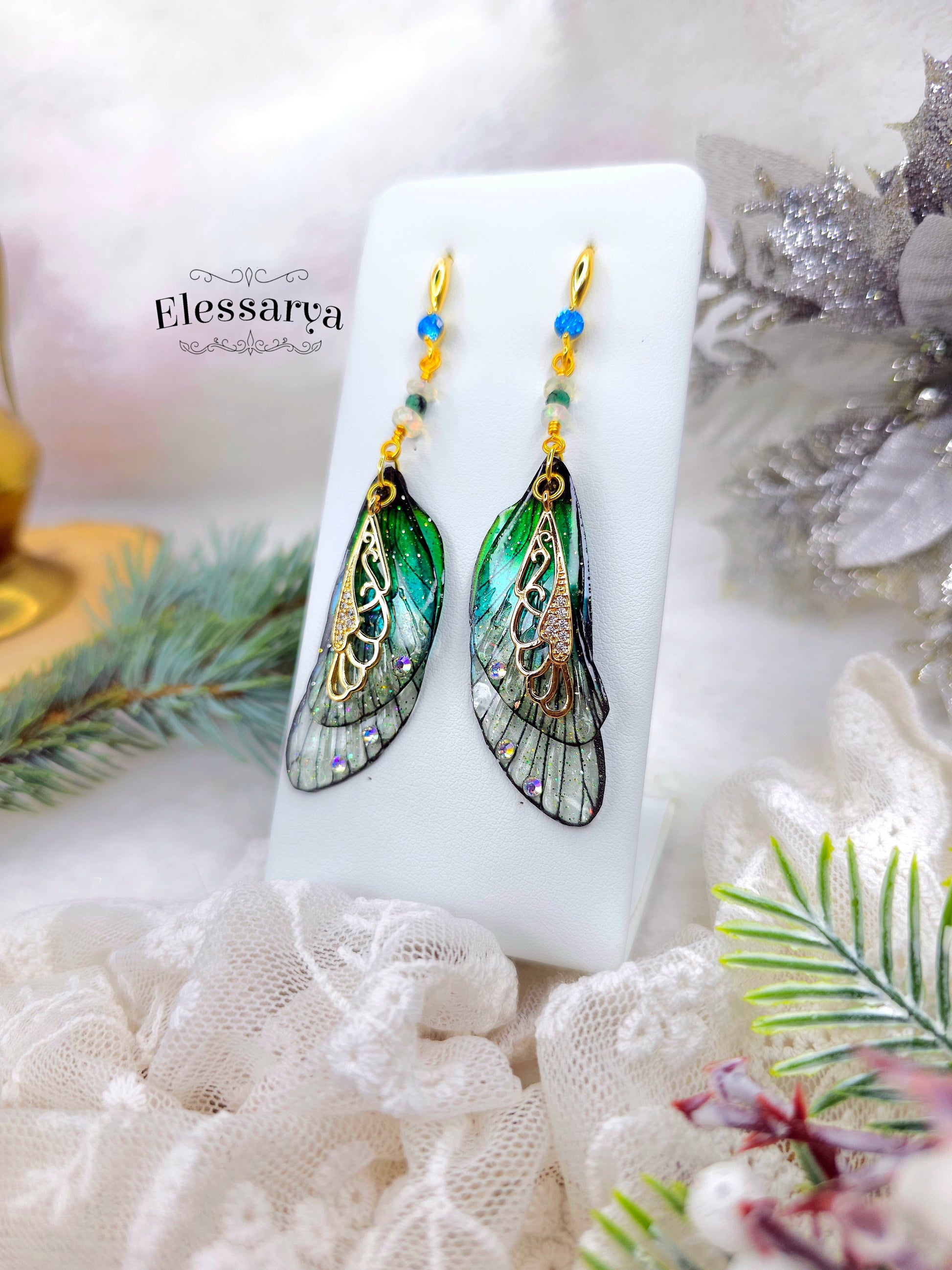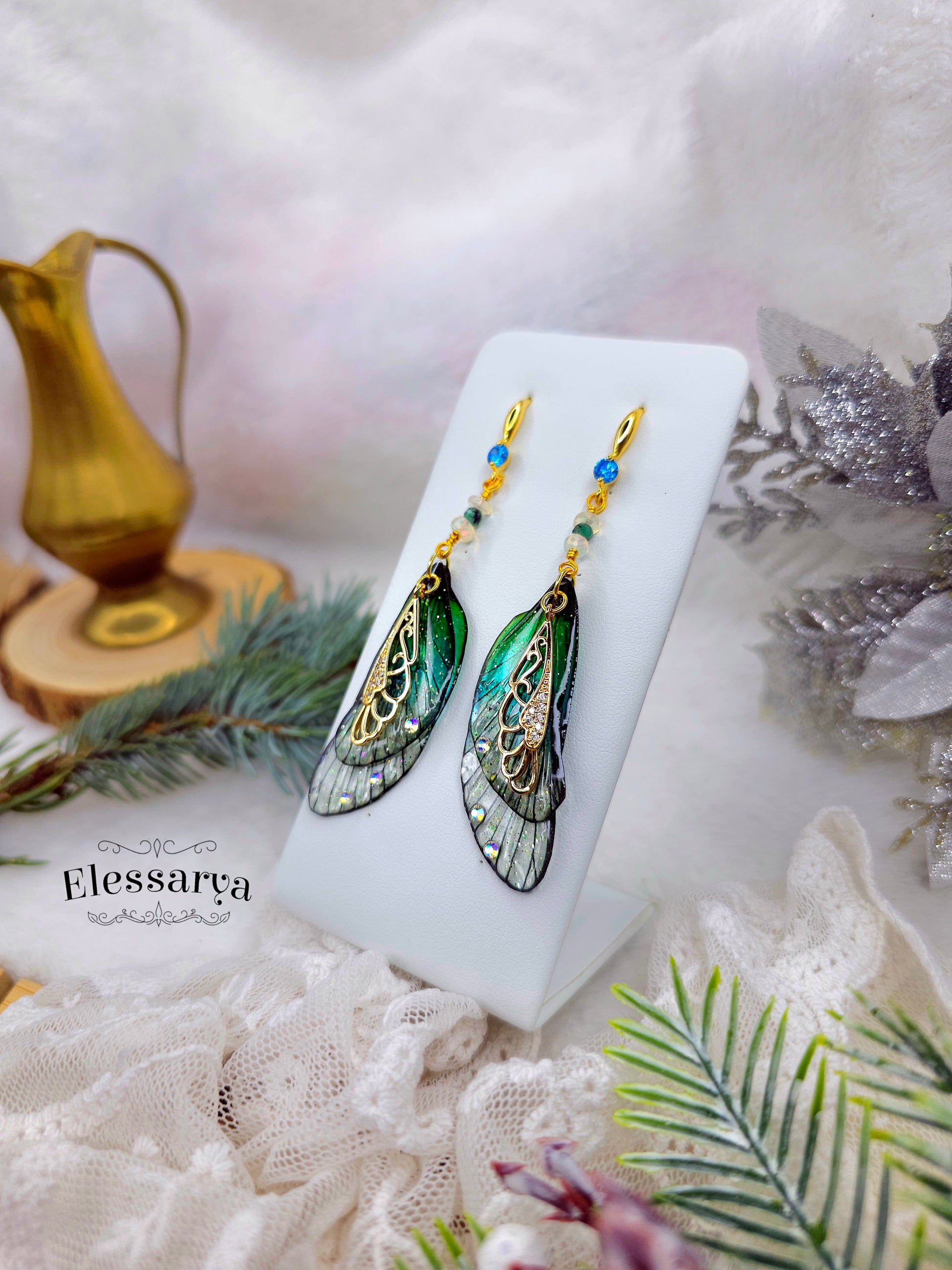 Aripile sunt create din rășină non-toxică, mobile și luminoase, în nuanțe de verde smarald și gri sidefat.