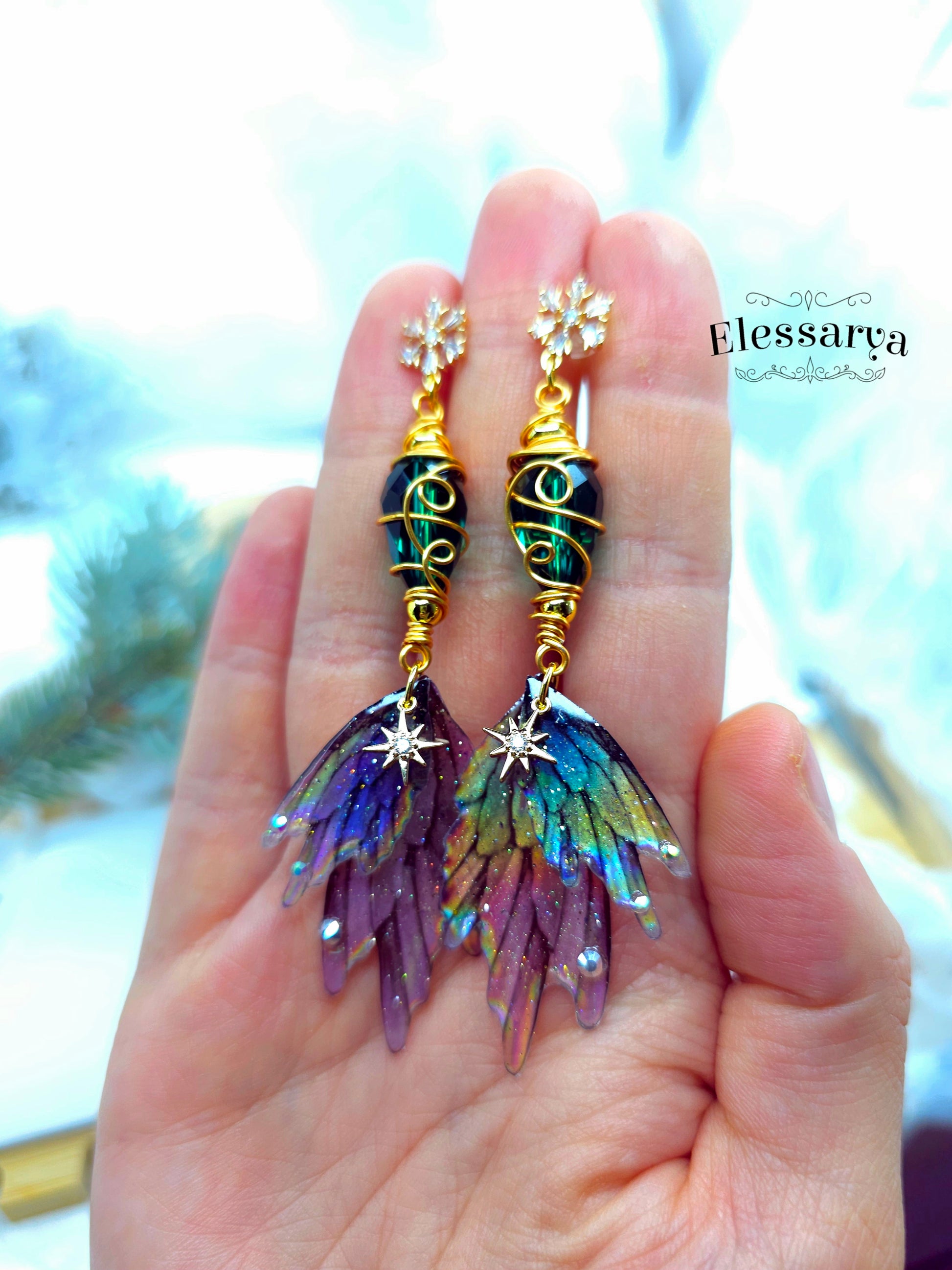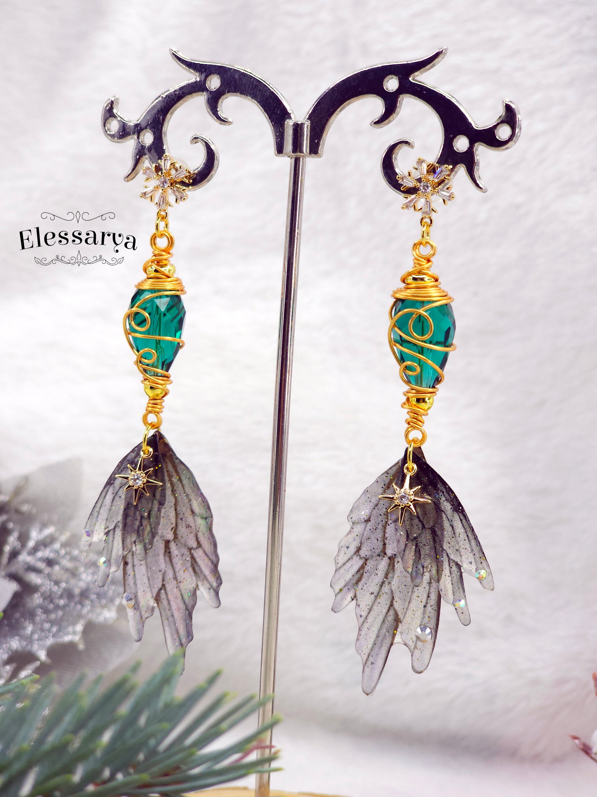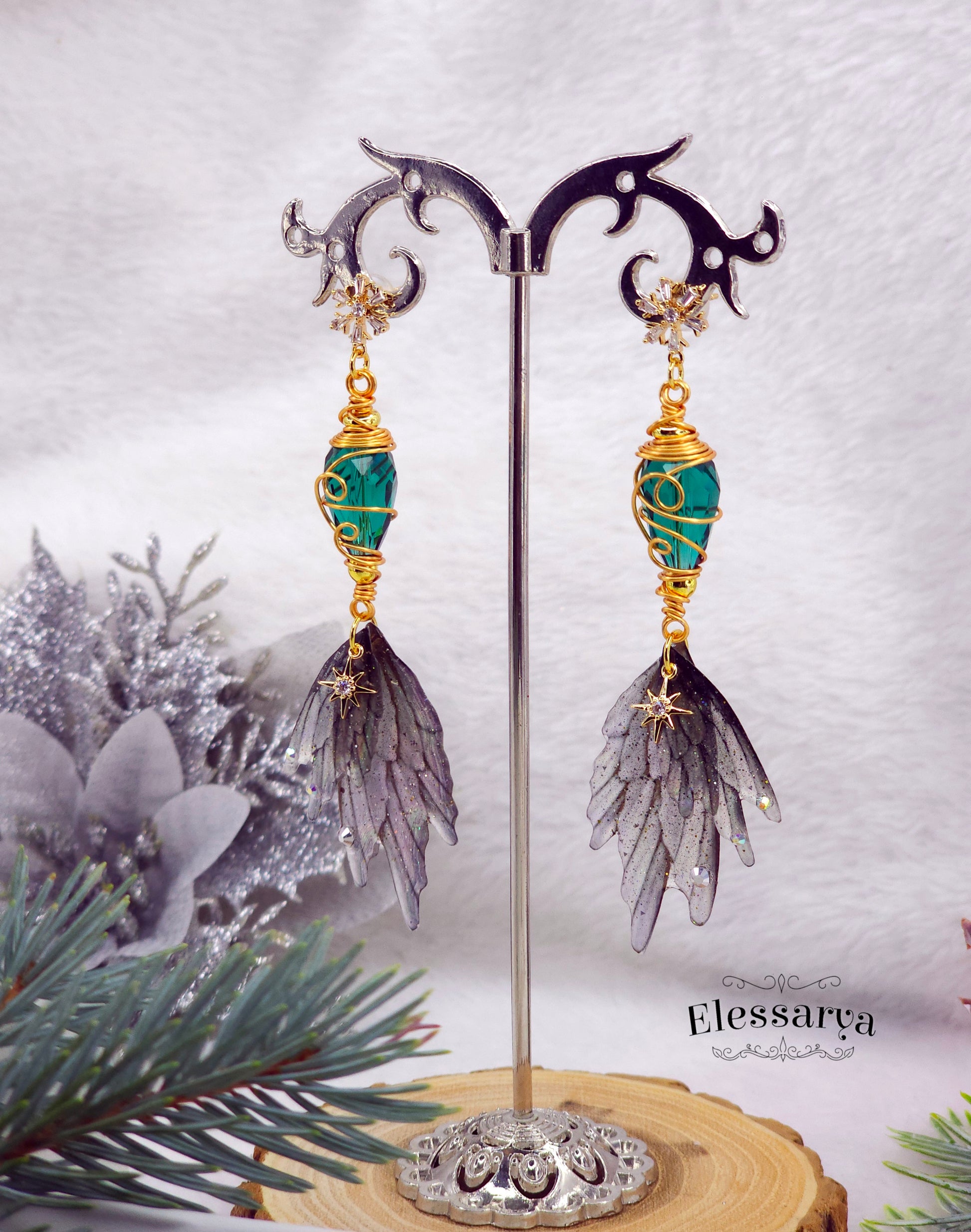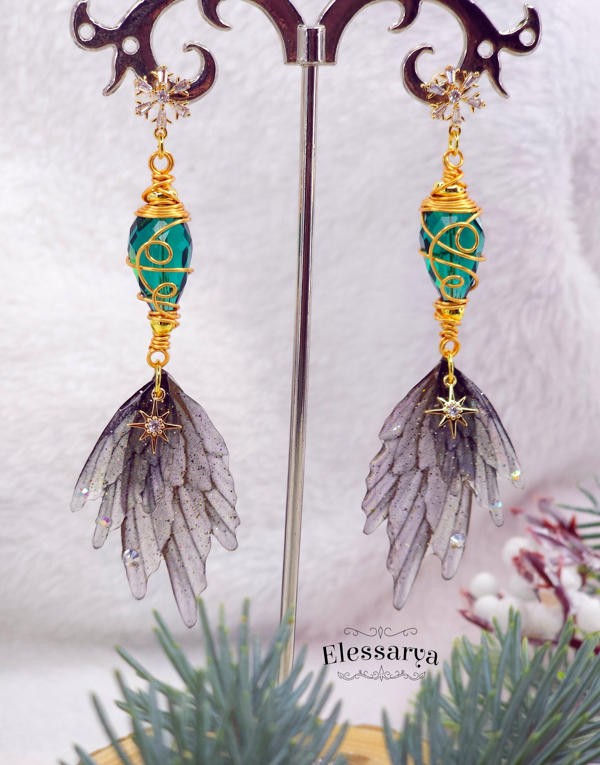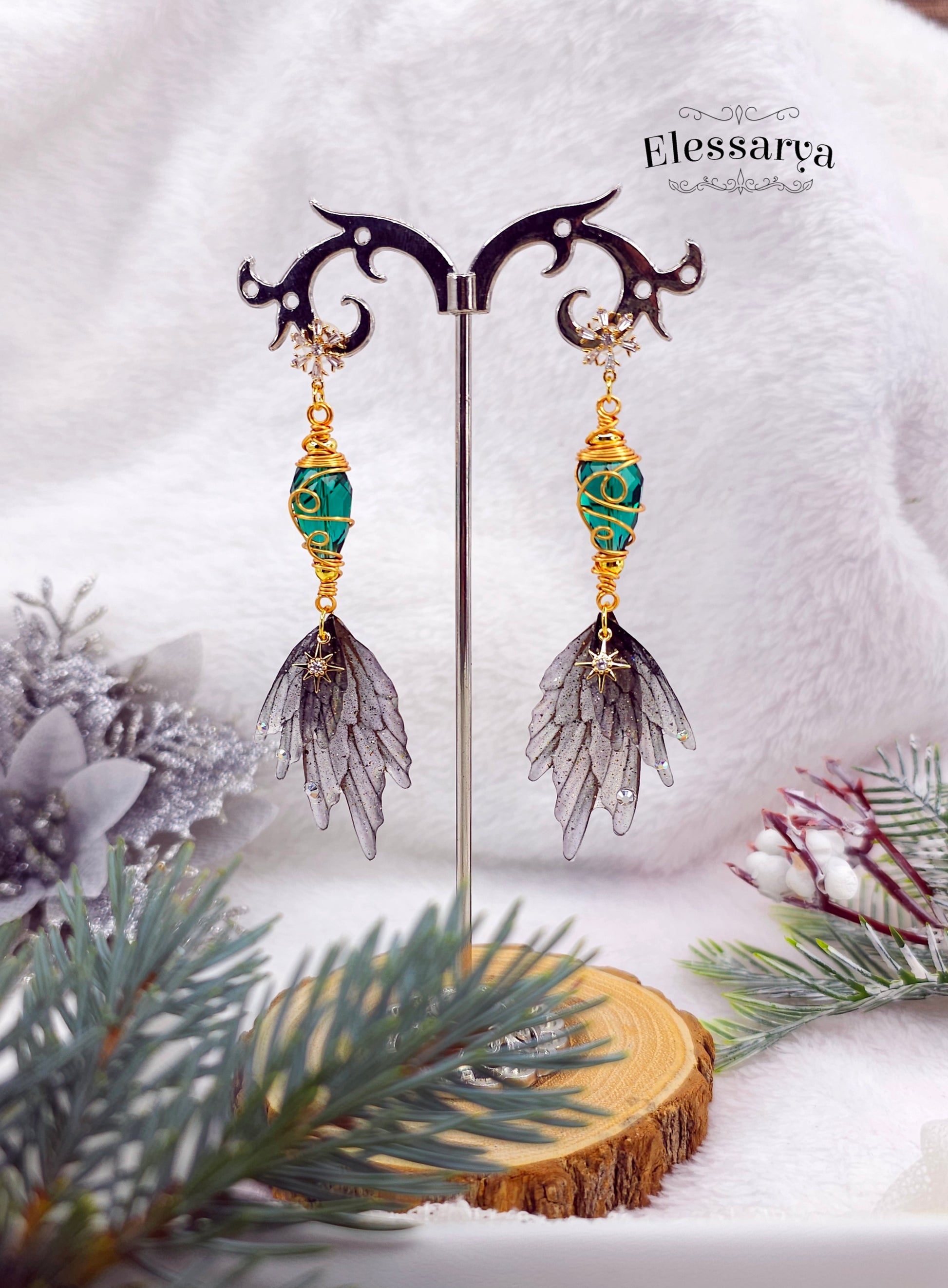 Cercei eleganți și feerici, creați pentru a prinde lumina ca niște mici licurici de iarnă. Aripile de zână sunt realizate din rășină non-toxică și au o magie aparte: la lumină normală par gri-transparente, iar în lumină puternică sau la soare își dezvăluie reflexiile de curcubeu, ca gheața subțire care prinde razele dimineții.