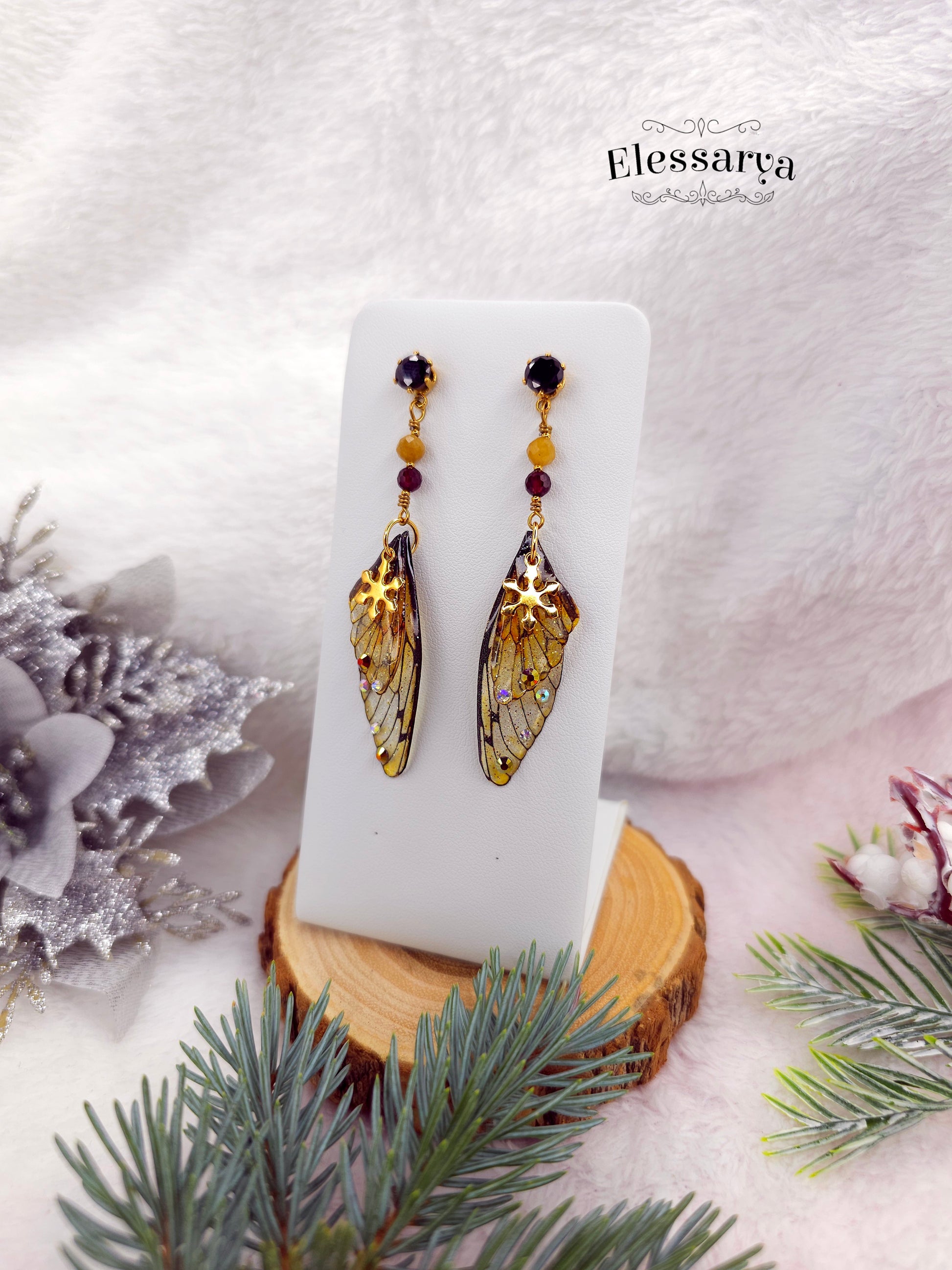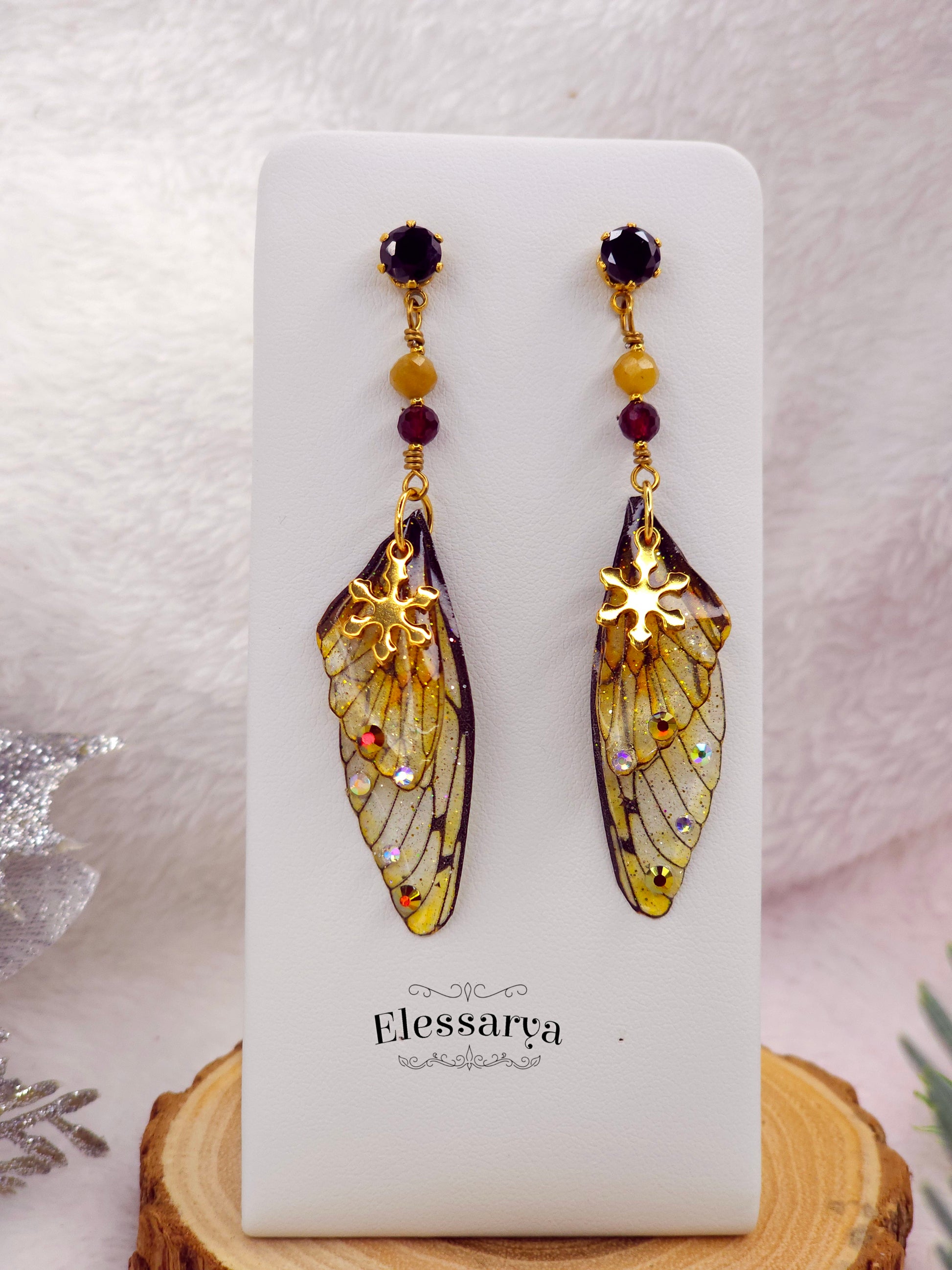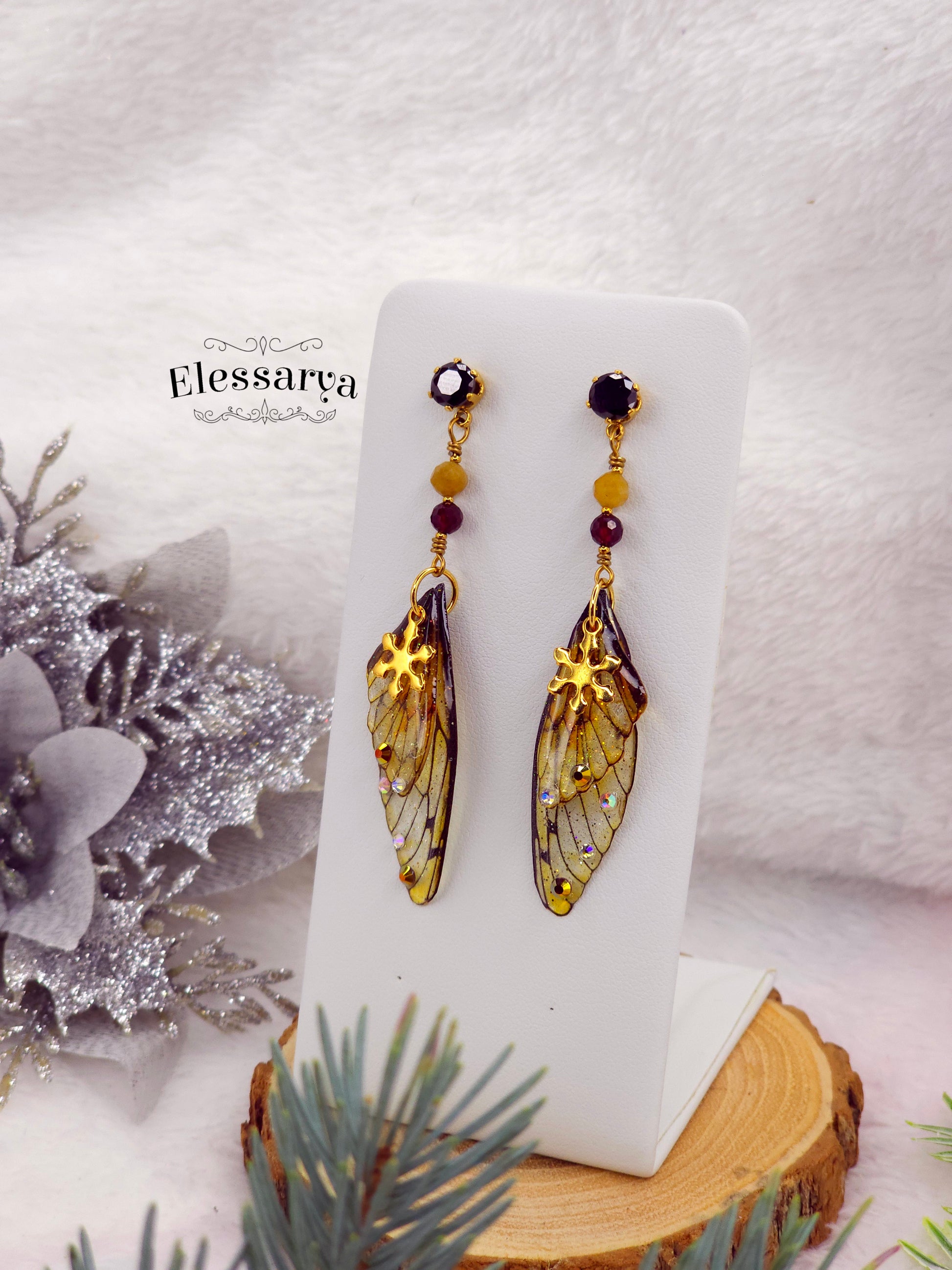 O pereche de cercei calzi și luminoși, creați din aripioare delicate turnate manual din rășină non-toxică. Nuanța lor principală este un galben auriu cu reflexii discrete, iar pe suprafață sunt aplicate mici strasuri holografice care prind lumina ca niște scântei fine de zăpadă.