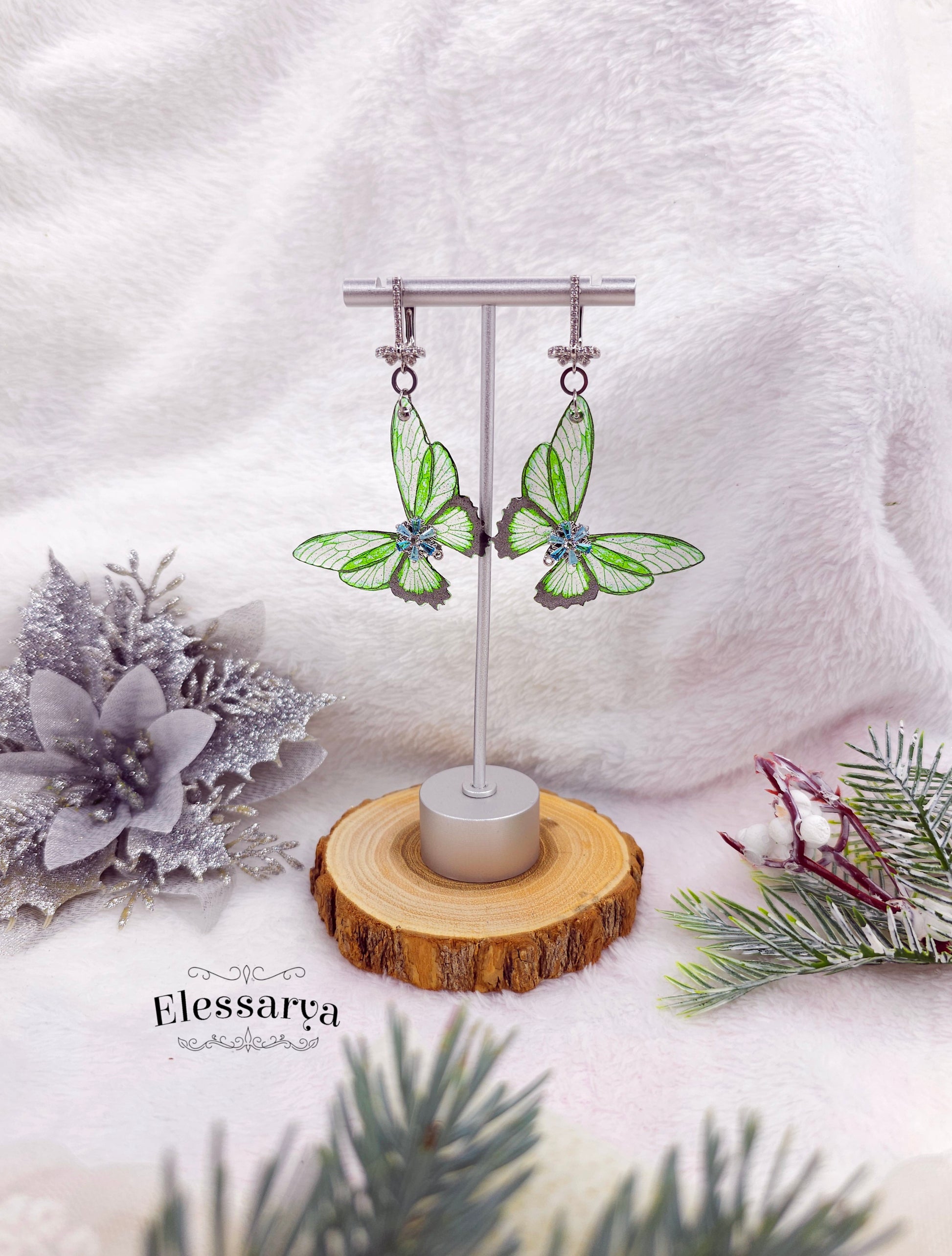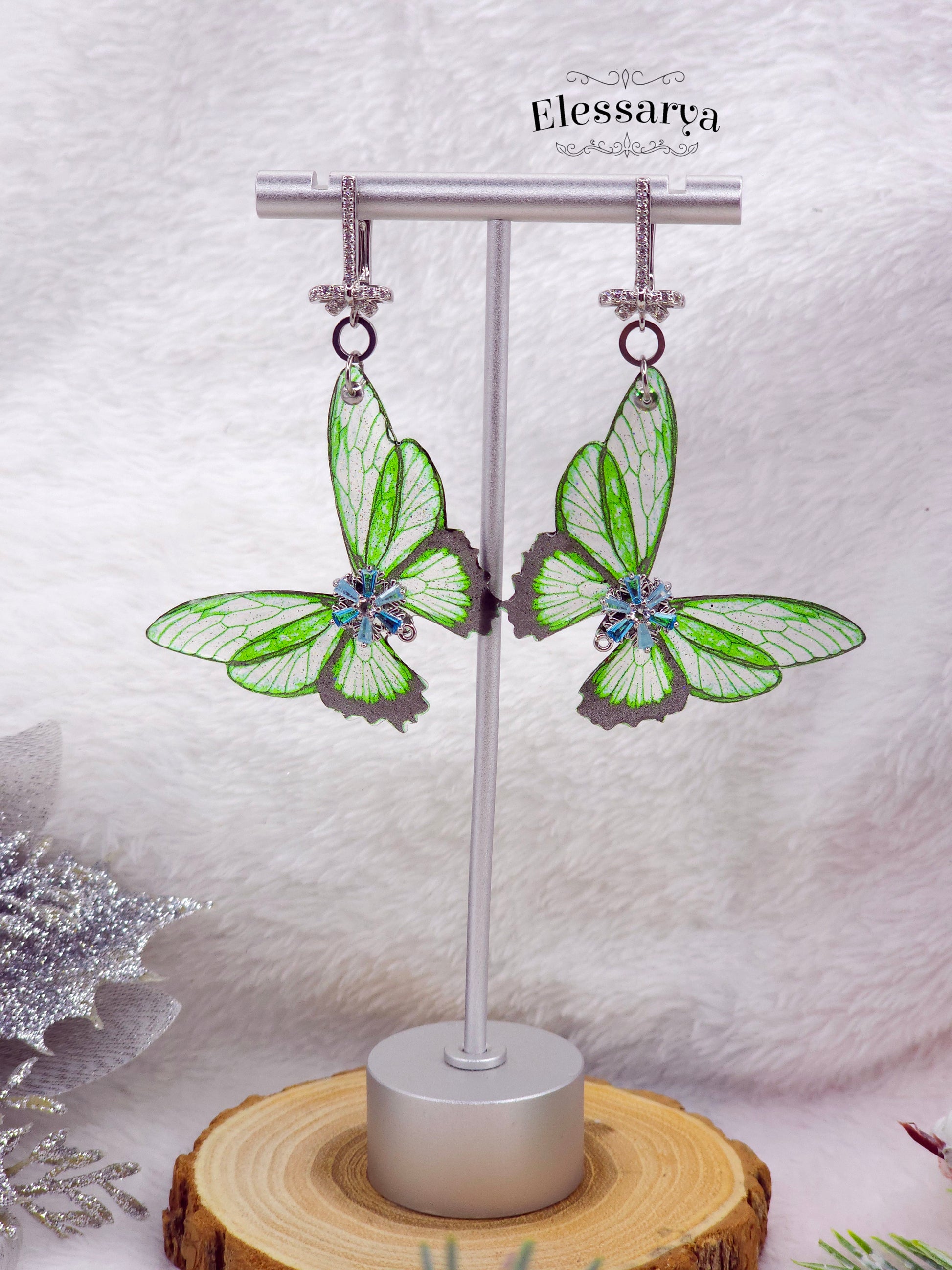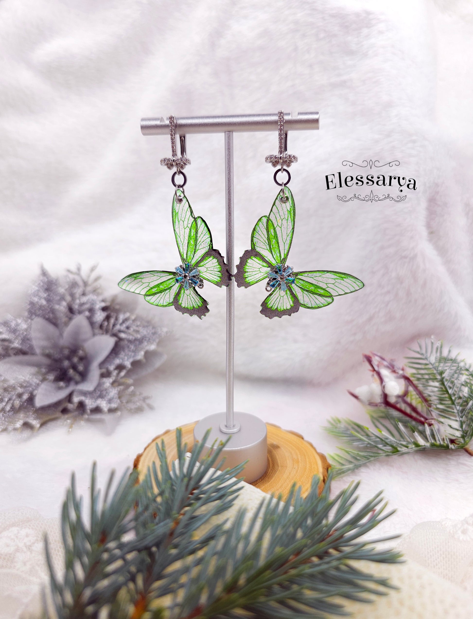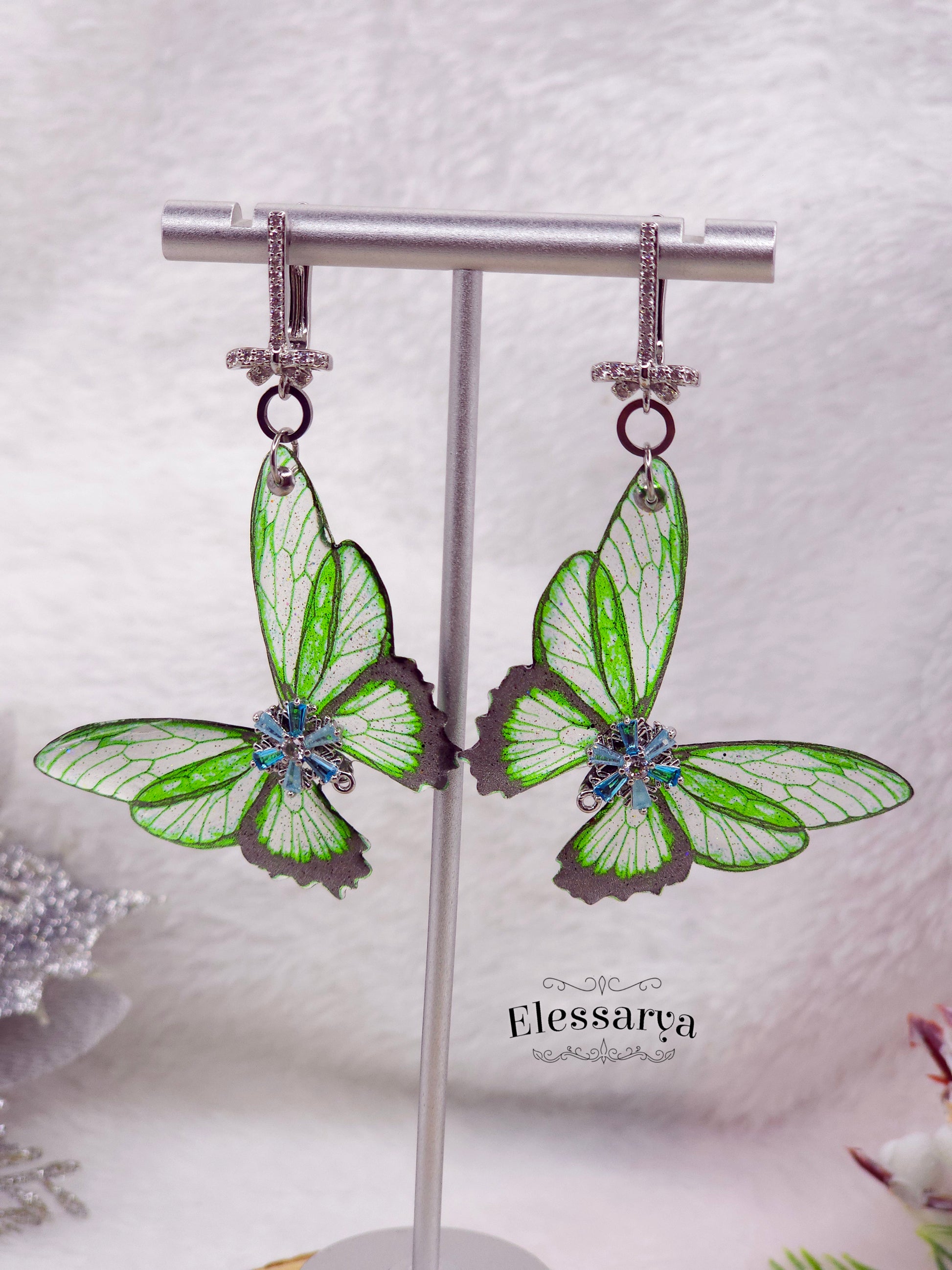 O pereche de cercei luminoși și jucăuși, creați din aripi de fluture realizate manual din rășină non-toxică, transparente și colorate într-un verde proaspăt, ca frunzele tinere la început de primăvară. Aripile sunt vaporoase și ușoare, cu accente fine de sclipici care prind imediat lumina și dau senzația de mișcare chiar și atunci când cerceii stau nemișcați.