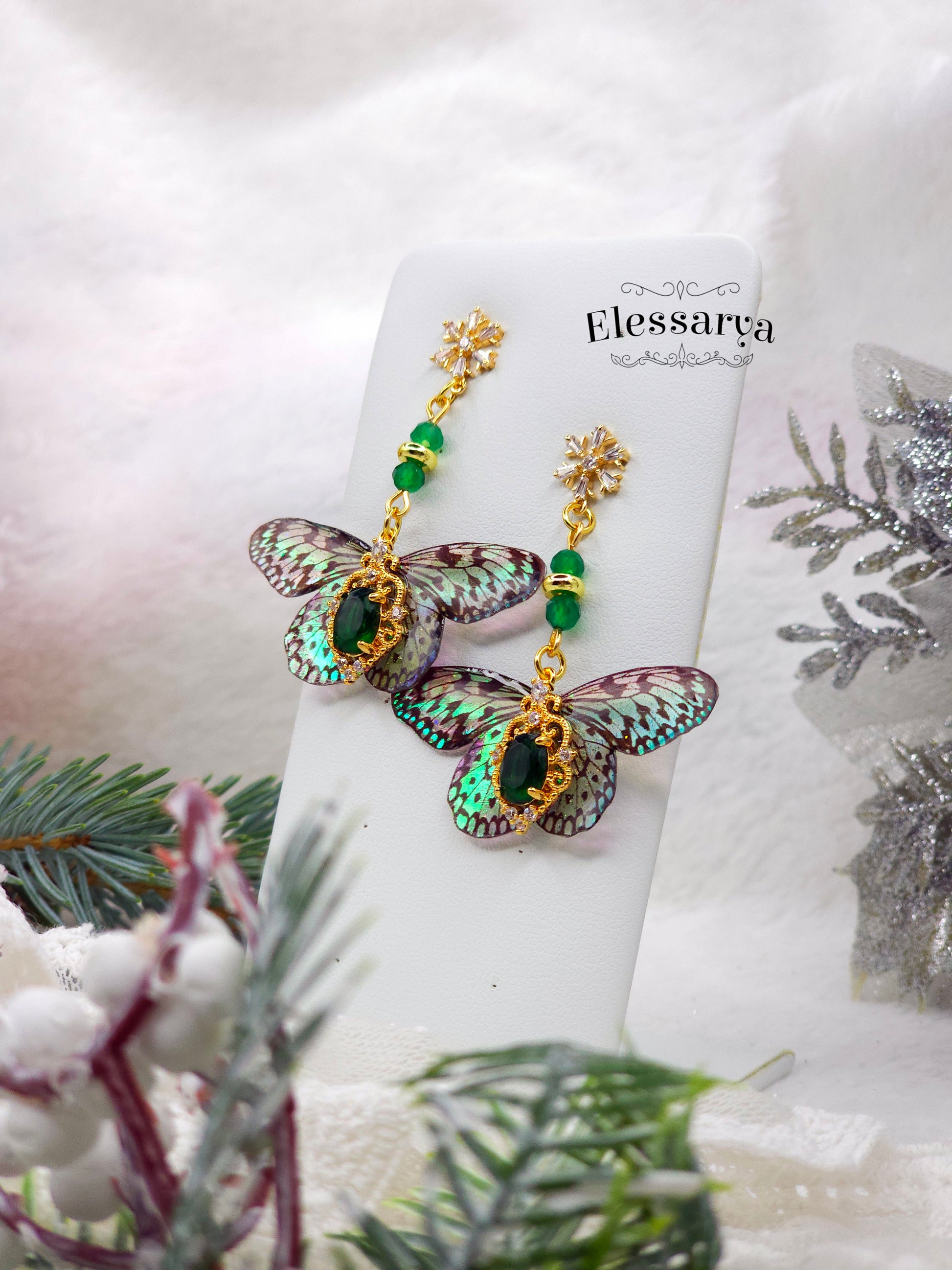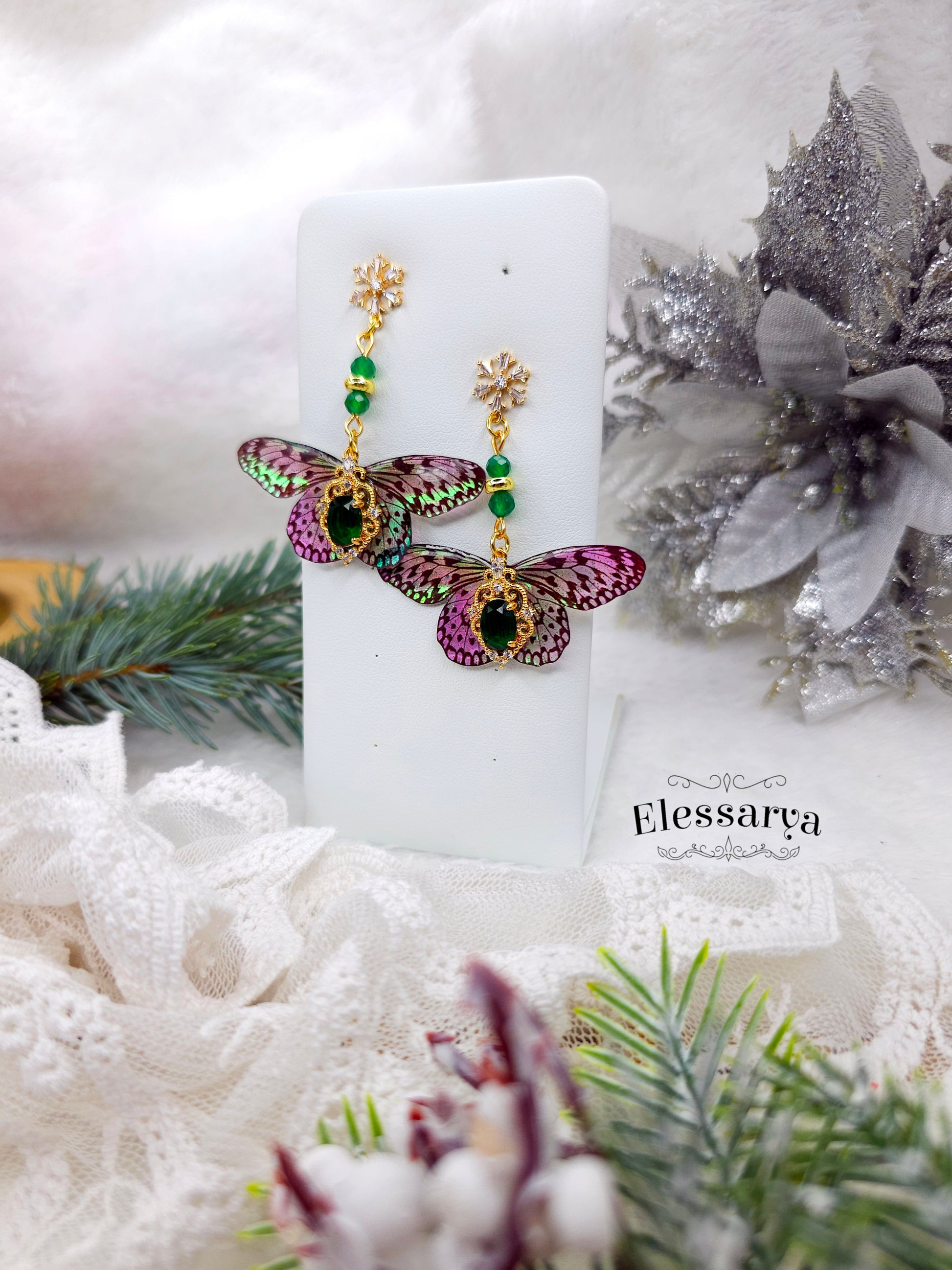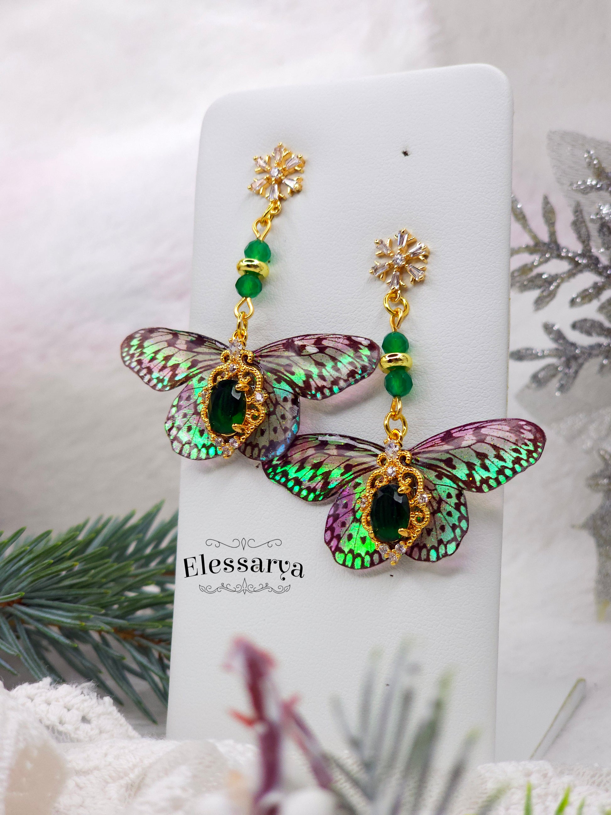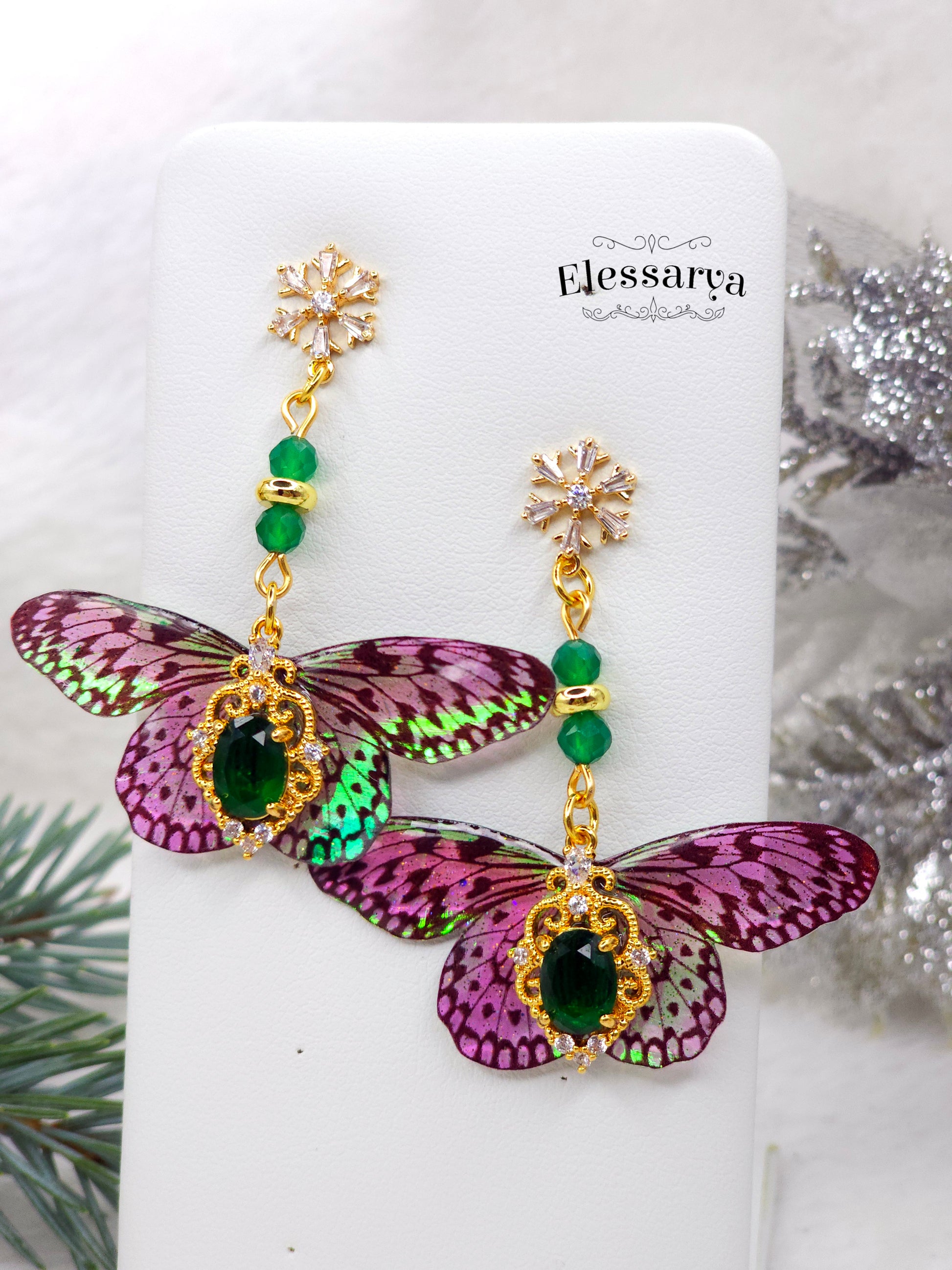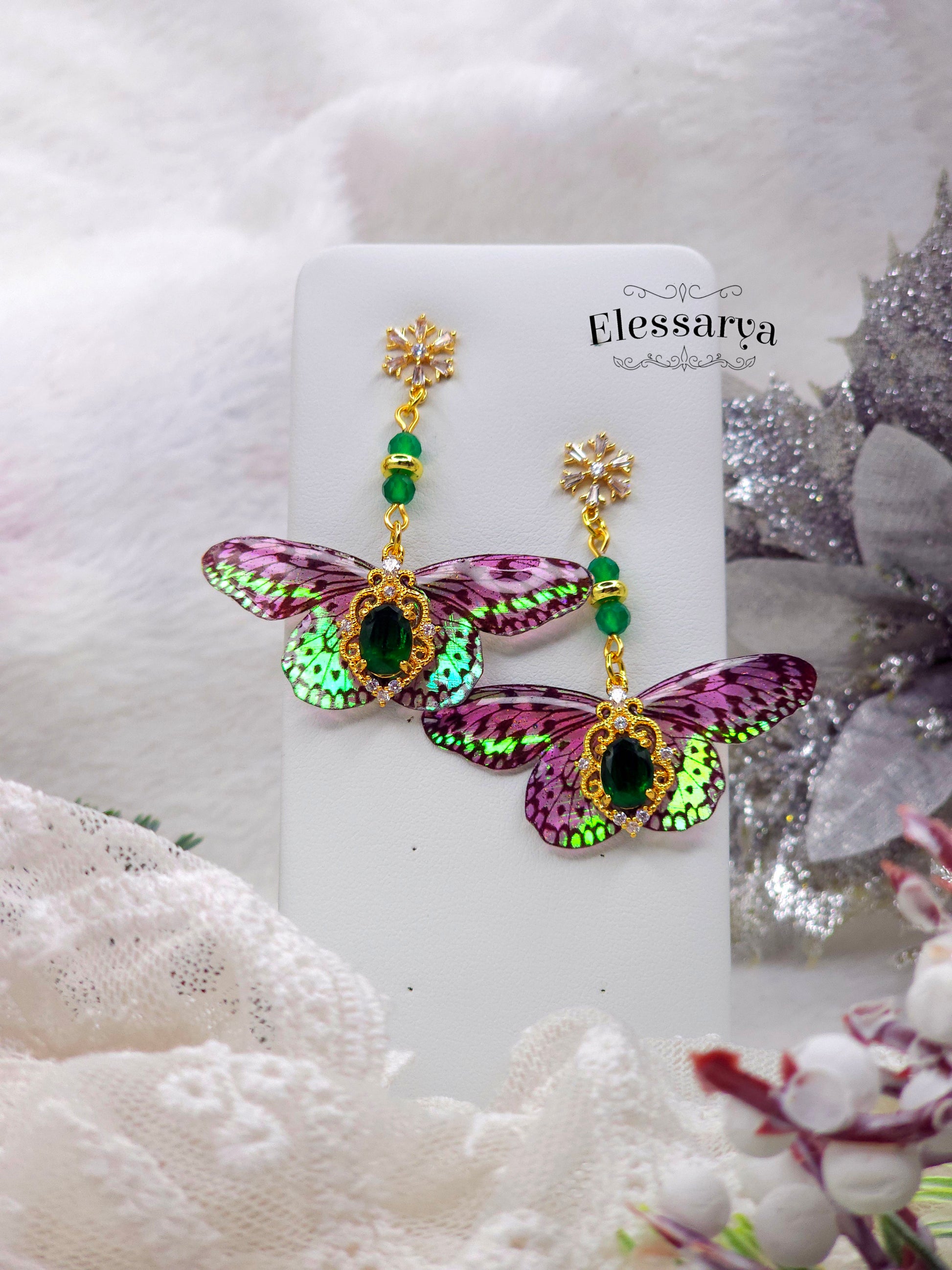 O pereche de cercei eleganți, plini de detalii fine și un aer festiv. Toate elementele metalice sunt placate cu aur. Mărgeluțele sunt din agat verde, o piatră care se vede superb în lumină și completează perfect nuanțele aripilor. Fluturașii au reflexii verzi și rozalii, care se schimbă în funcție de unghiul din care sunt priviți, ca niște solzi de zână.