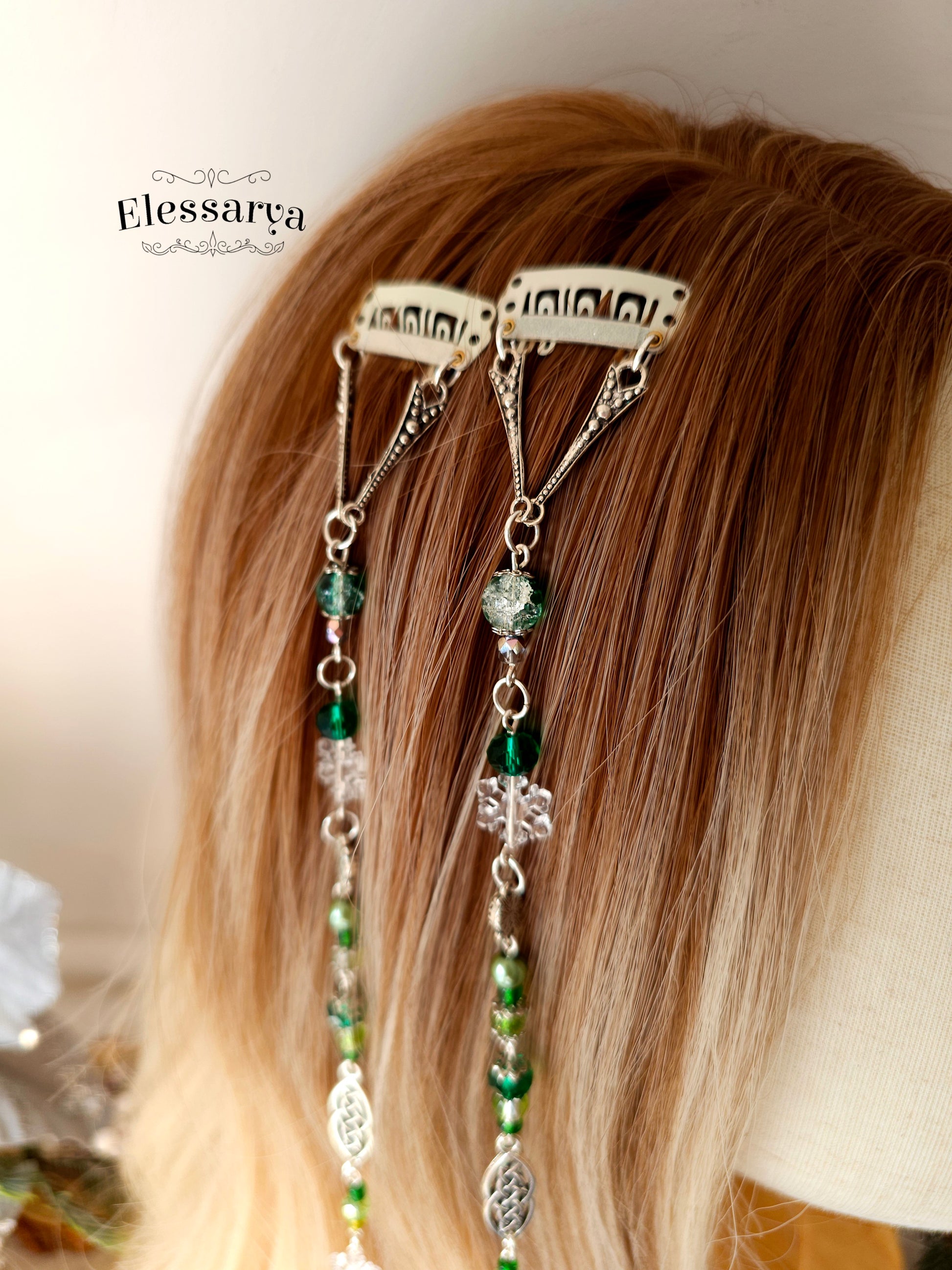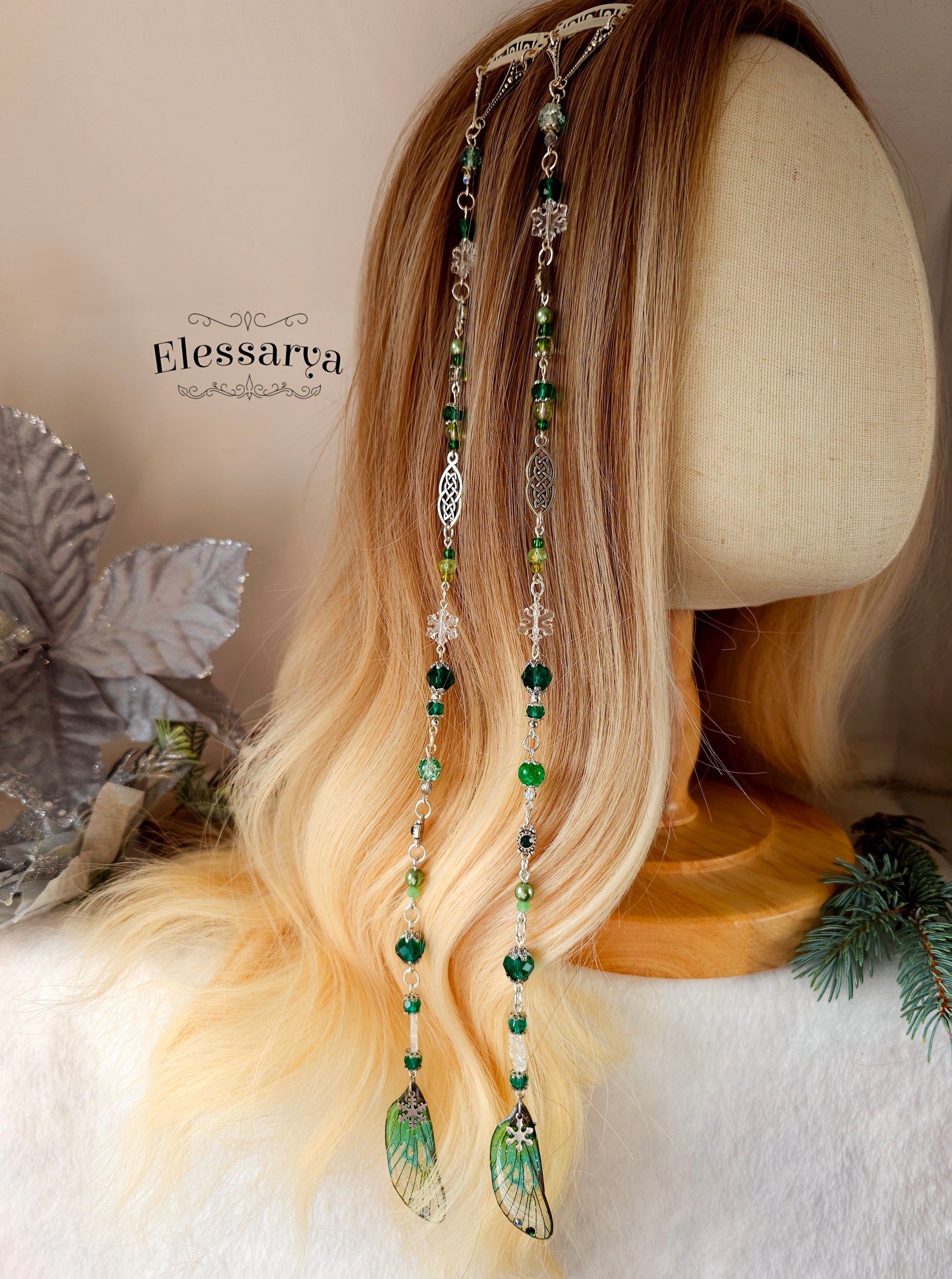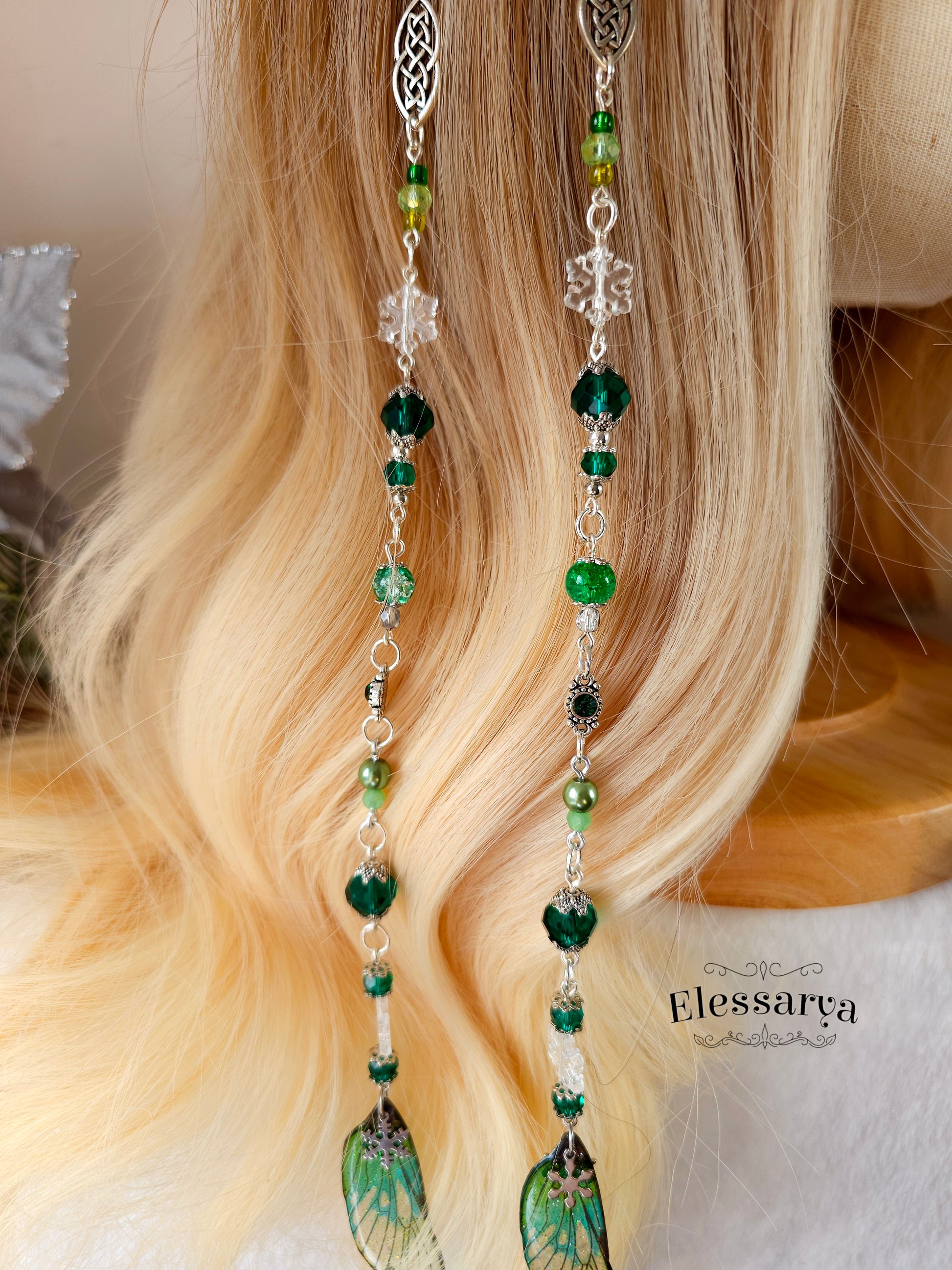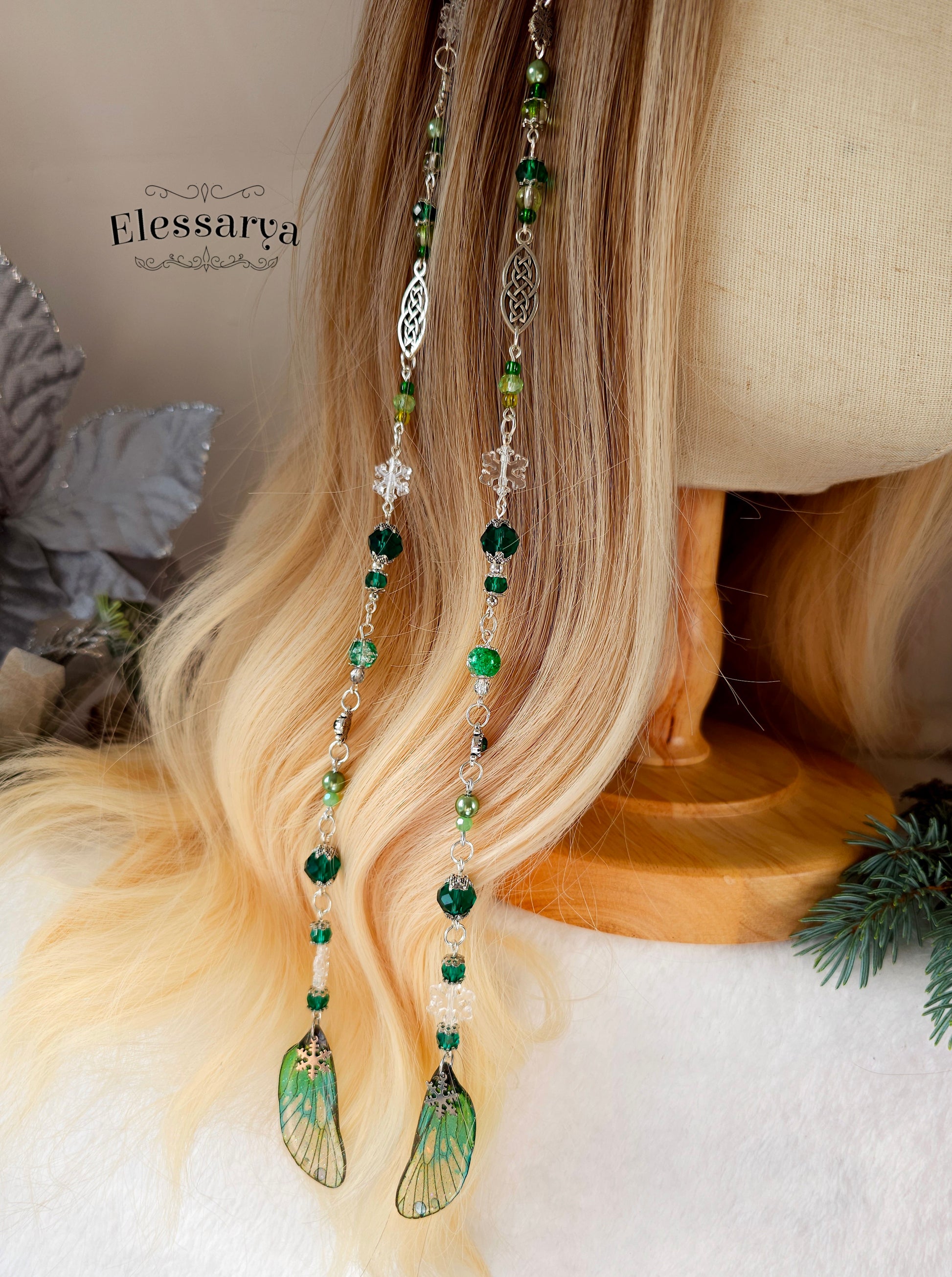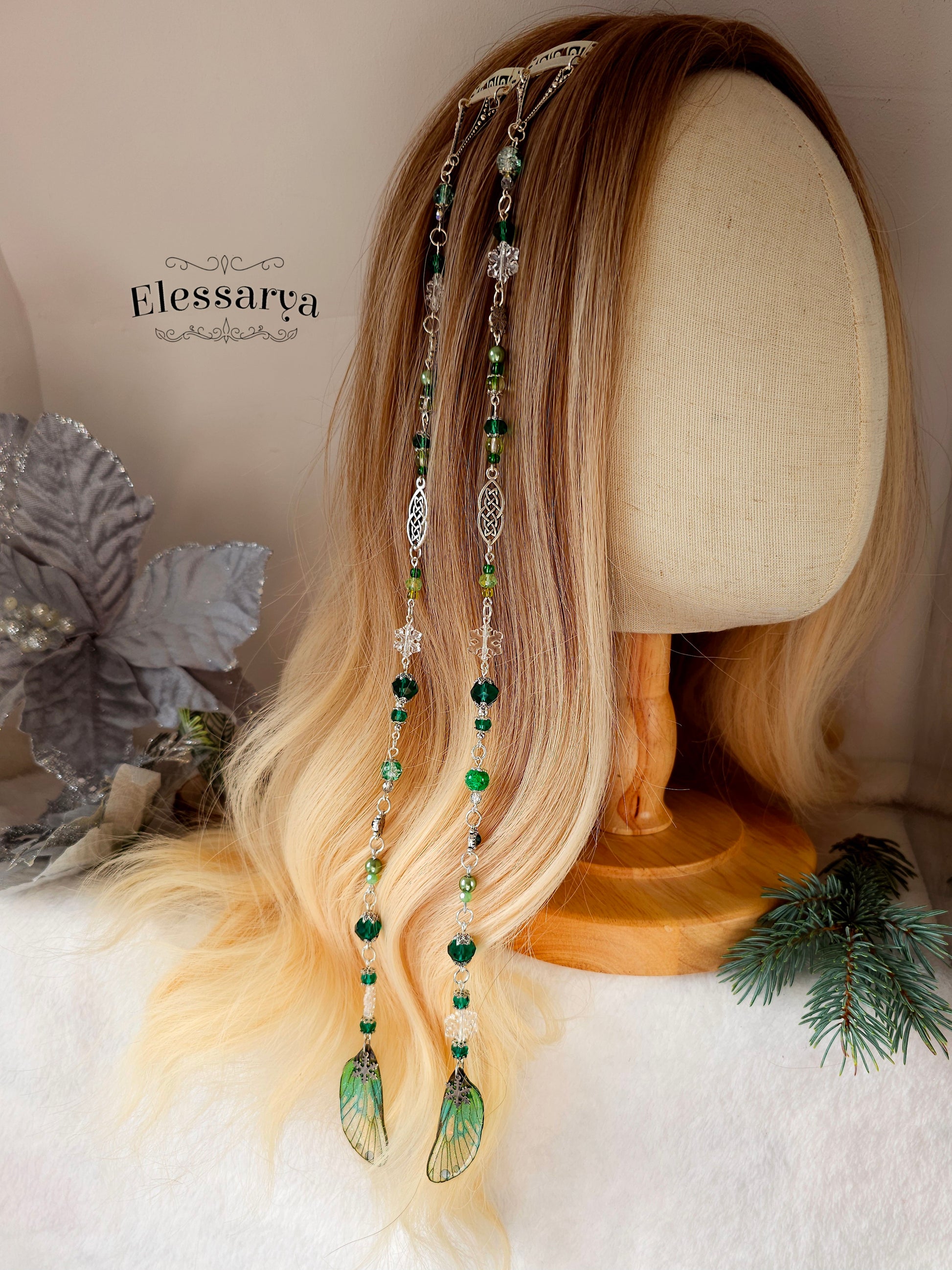 Între ele, fiecare segment este construit din mărgele de sticlă și acril în tonuri de verde, transparent, argintiu și microlumini cristaline, conectate prin elemente metalice din aliaj și cupru placat cu argint. Totul e gândit să creeze o linie fluidă, ușor elfină, dar rezistentă.