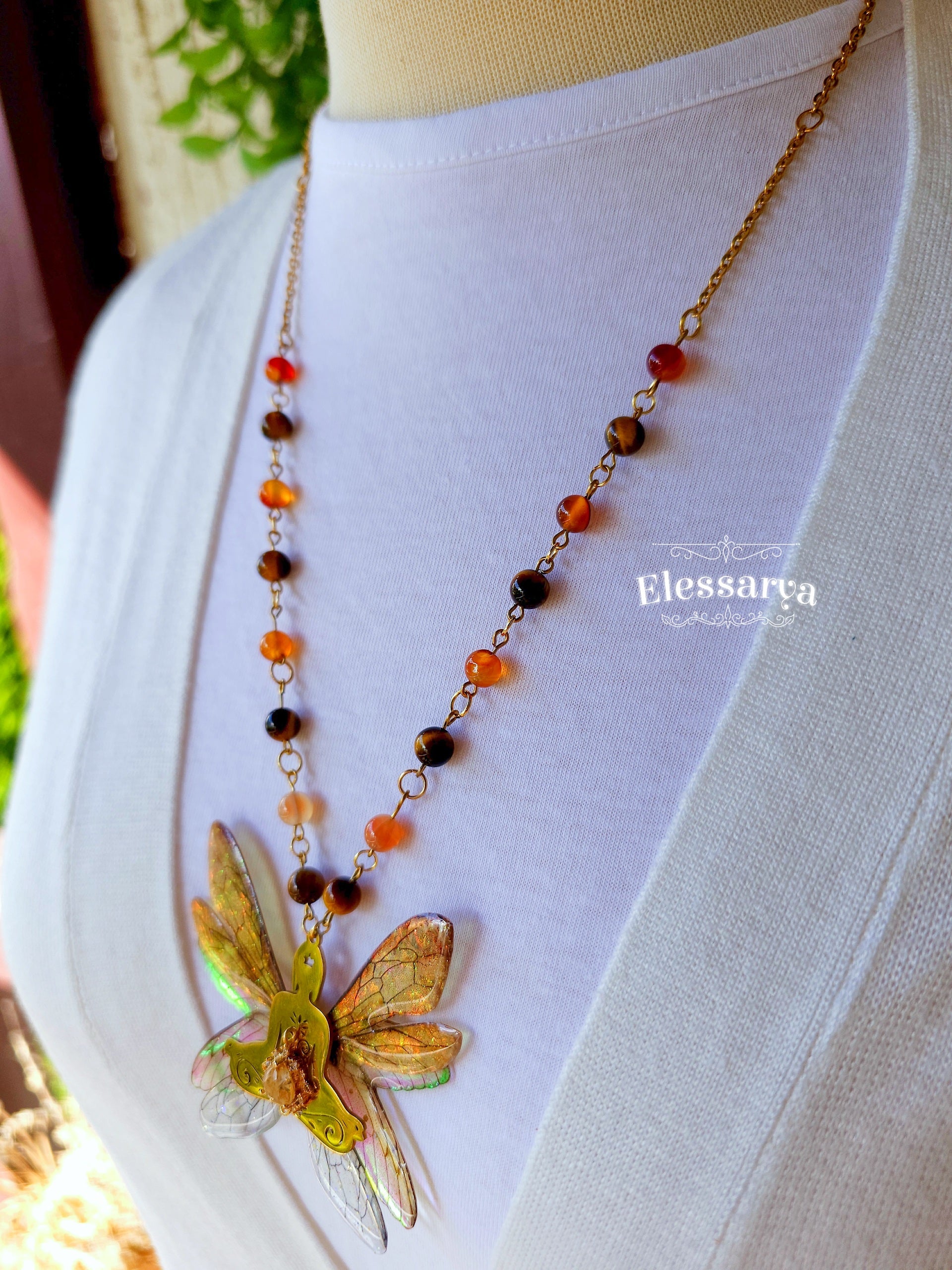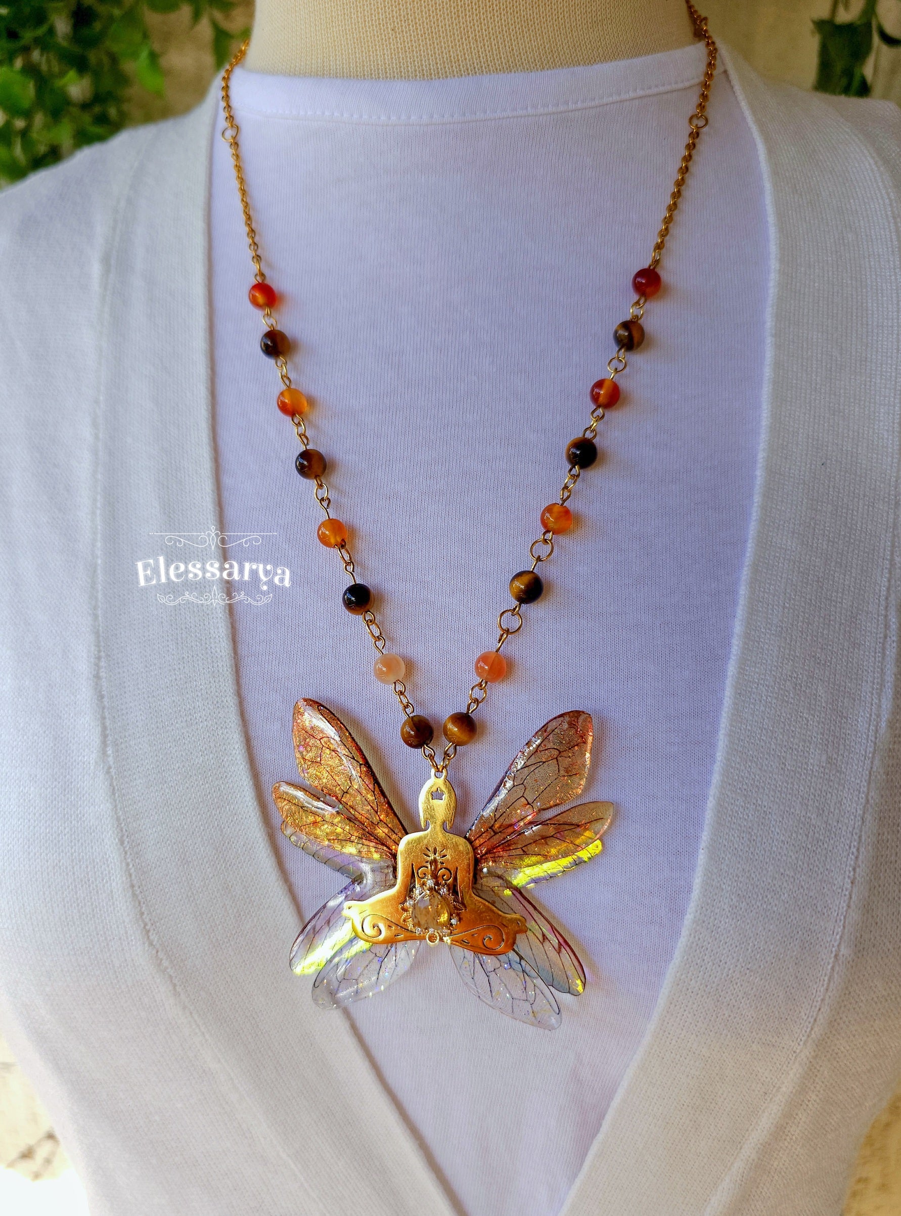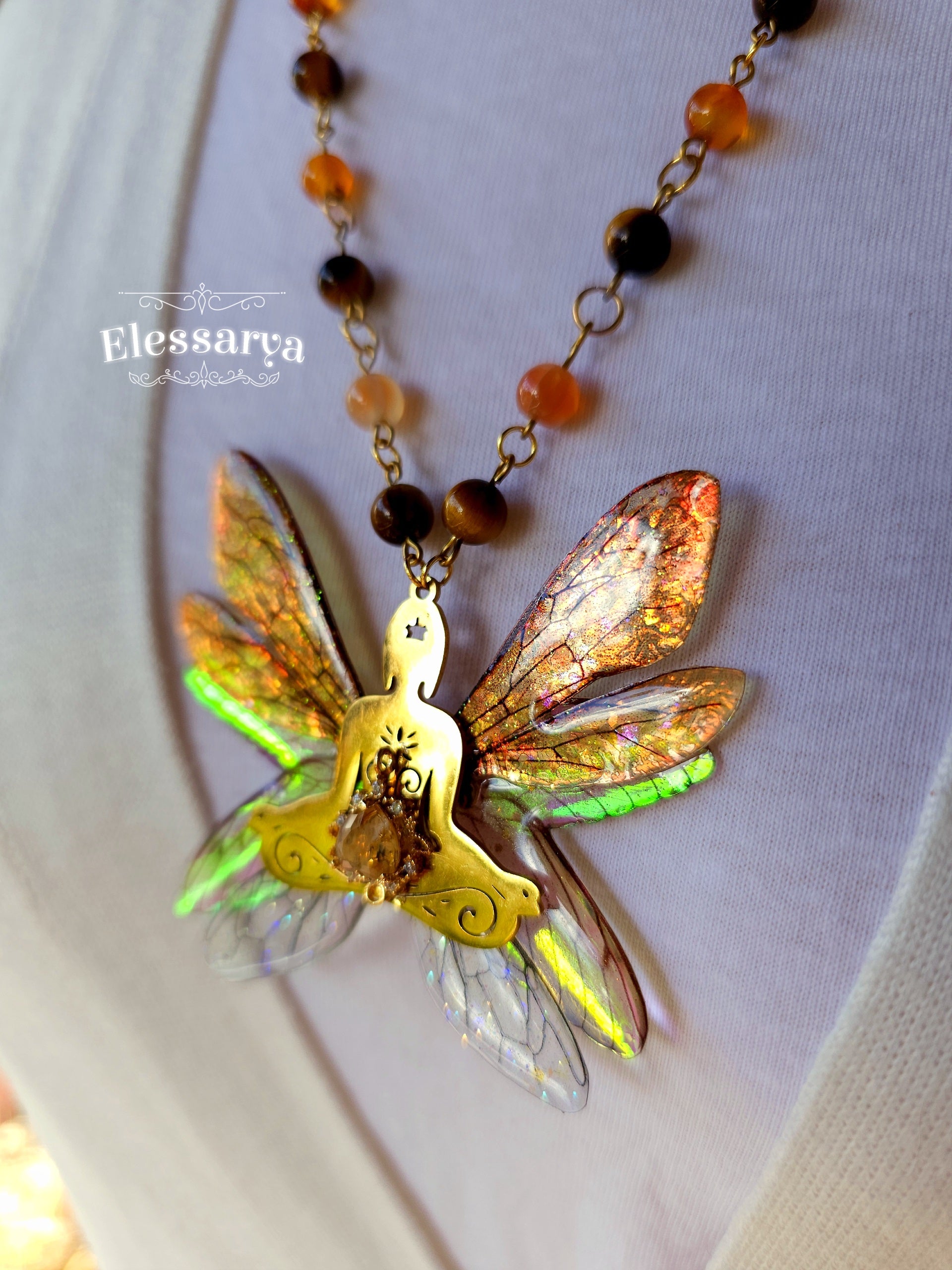 Aripile zânei, create din rășină non-toxică, au reflexii irizate în tonuri de arămiu, chihlimbar, verde și auriu pal, care se schimbă ușor în funcție de lumină. Este o piesă statement, menită să inspire echilibru, grație și o legătură profundă cu energia vitală.